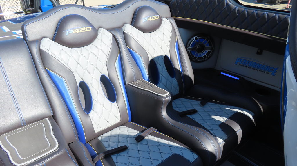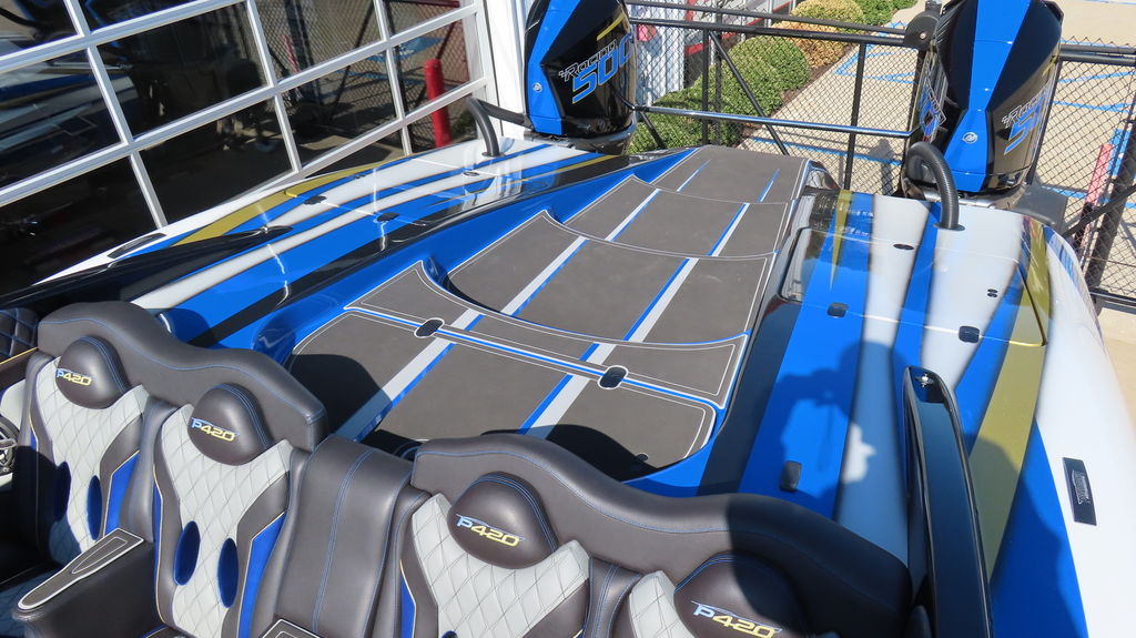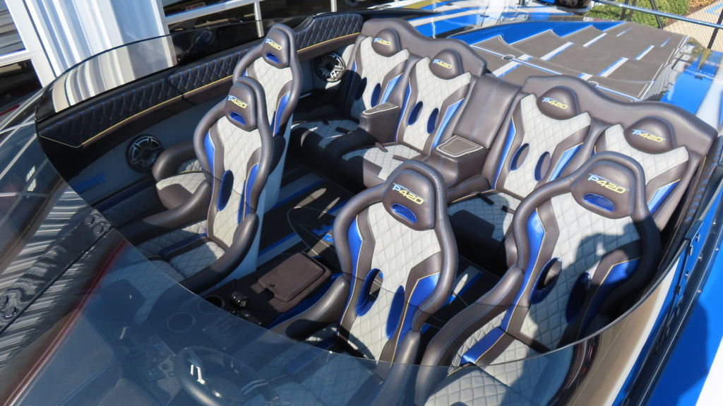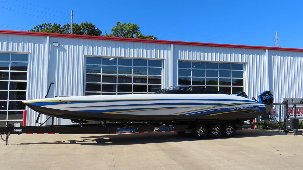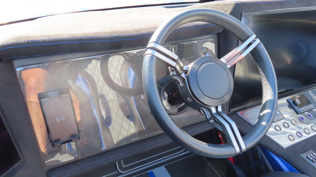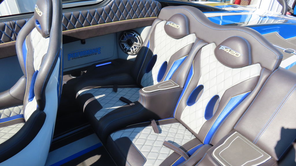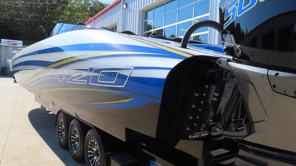 Carbon hull and deck lay-up, Vacuum-bagged e-Glass Epoxy/Carbon Fiber, Stringers & Bulkheads formed out of Foam Core/Carbon Fiber Reinforced, Faired Hull and Deck Joint, No Rub Rail, Wrap Around Windshield, Bocatech Switches, Lined Large Storage Locker Rear of Cockpit, Stainless Tie Bar, Billet Jack Plates, LED Nav and cockpit lighting, 3 AGM Batteries w/Remote Dash Switch, Bilge Pumps w/Automatic float Switches, 3 Bank Battery Charger, Cockpit blower vents, Illuminated Billet Cockpit handles, 8" Pop up cleats, QTY 6, Garmin 8622 22" Display Centered in Dash, Pull out Telescoping Ladder, Carbon Fiber dash panels, Cup Holders Qty 8, Mercury DTS Throttles and Shifters, Fire Extinguisher with Billet Mount, Sea Dek Flooring, Custom 8 person interior, Alcantara accents, Ultra Leather and Suede, Storage Compartments in cockpit with Performance logo, Fusion Head Unit, JL Multi Channel AMP, Speakers Sub and box, Shadow Caster Underwater lights, cockpit and Bilge lights, Tilt Steering, Isotta Steering wheel, Vessel View 903, 2 Garmin Rear facing cameras, Dash Blowers, Power Footrest, Mercury CNC 5 Blade Cleaver Props, Wireless Phone Chargers, Cockpit cover, Myco Aluminum Trailer Included!