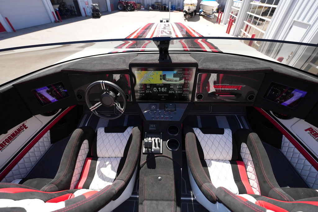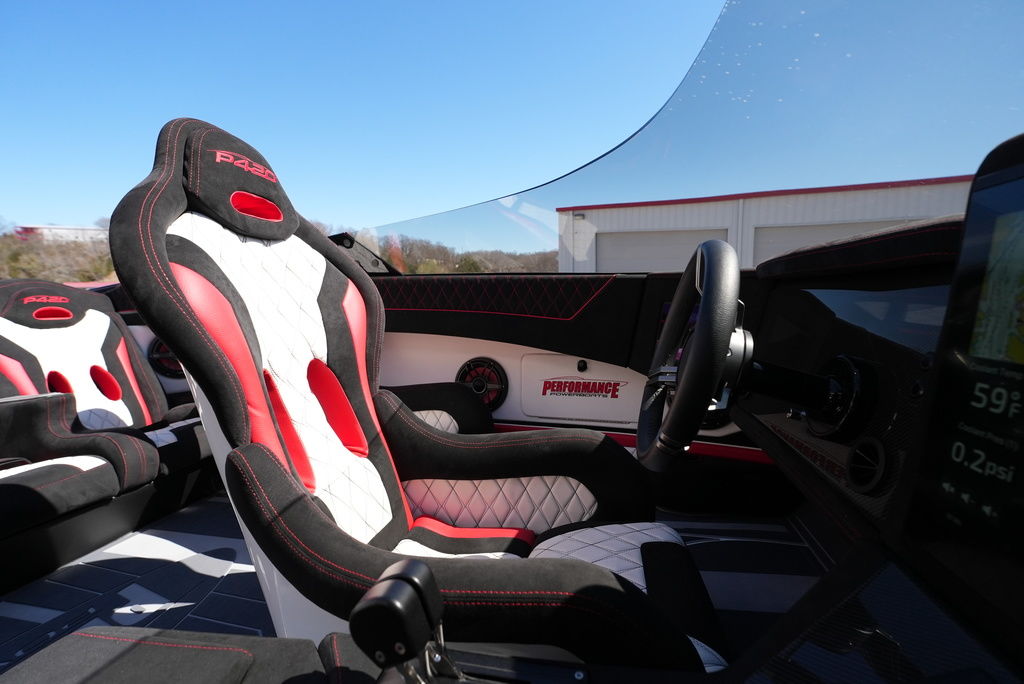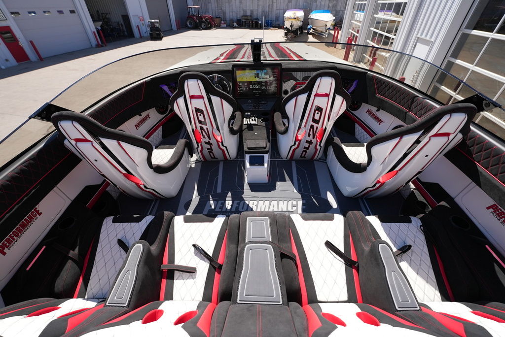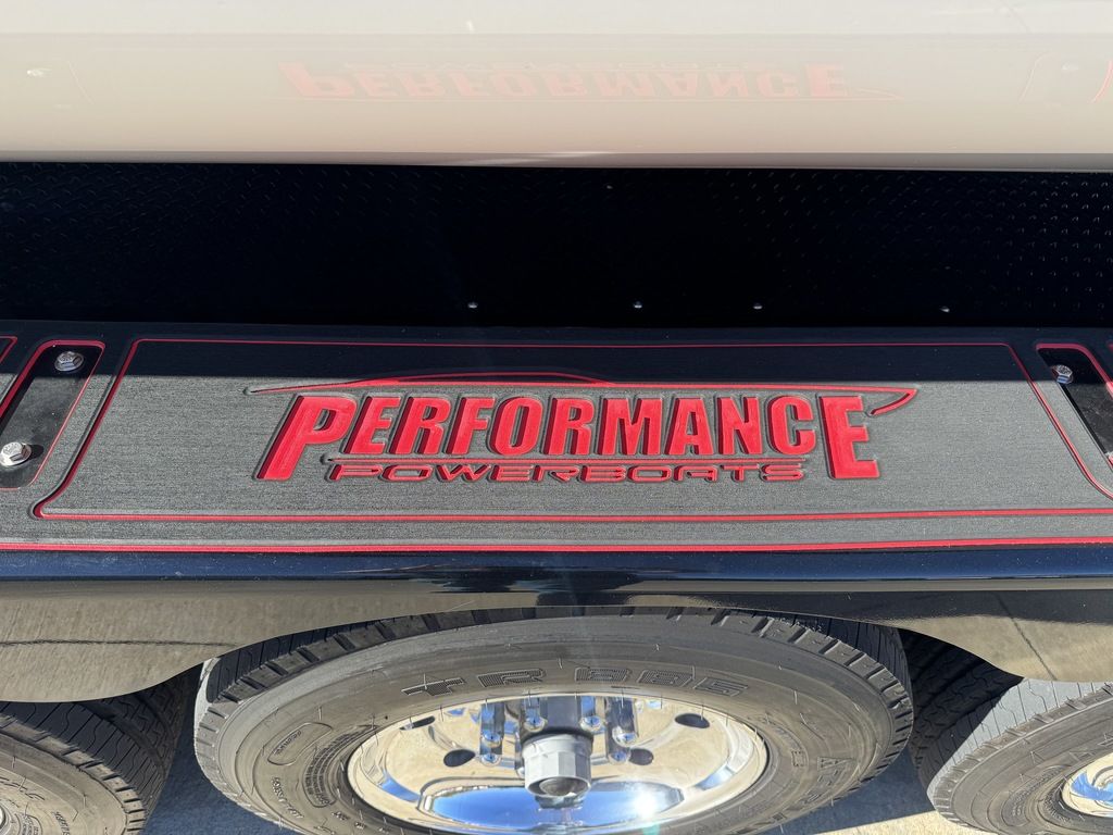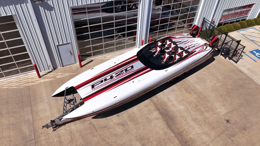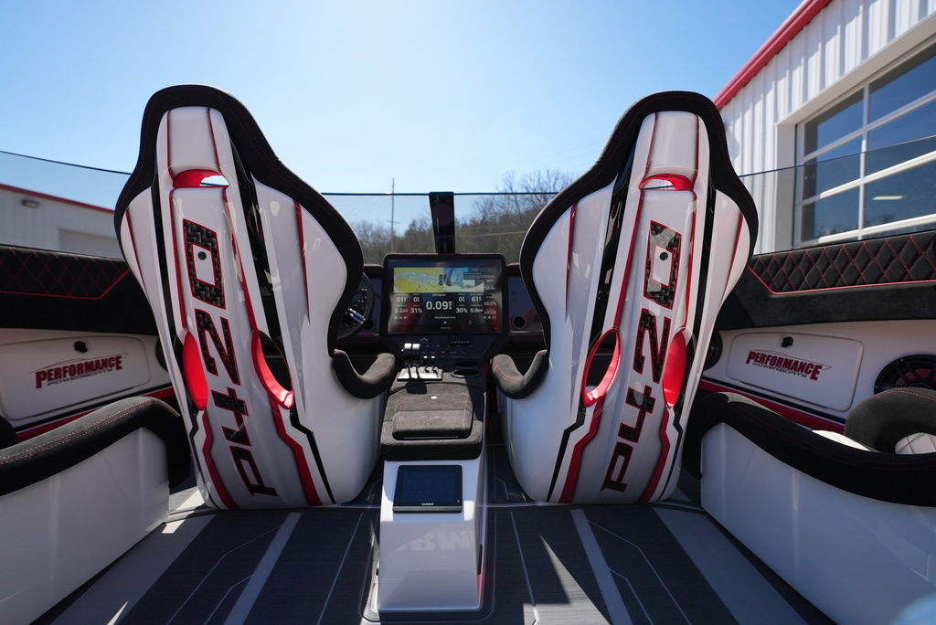 Carbon hull and deck lay-up, Vacuum-bagged e-Glass Epoxy/Carbon Fiber, Stringers & Bulkheads formed out of Foam Core/Carbon Fiber Reinforced, Faired Hull and Deck Joint, No Rub Rail, Wrap Around Windshield, Bocatech Switches, Lined Large Storage Locker Rear of Cockpit, Stainless Tie Bar, Billet Jack Plates, LED Nav and cockpit lighting, 3 AGM Batteries w/Remote Dash Switch, Bilge Pumps w/Automatic float Switches, 3 Bank Battery Charger, Cockpit blower vents, Illuminated Billet Cockpit handles, 8" Pop up cleats, QTY 6, Garmin 8622 22" Display Centered in Dash, Pull out Telescoping Ladder, Carbon Fiber dash panels, Cup Holders Qty 8, Mercury DTS Throttels and Shifters, Fire Extinguisher with Billet Mount, Sea Dek Flooring, Custom 8 person interior, Alcantara accents, Ultra Leather and Suede, Storage Compartments in cockpit with Performance logo, Fusion Head Unit, JL Multi Channel AMP, Speakers Sub and box, Shadow Caster Underwater lights, cockpit and Bilge lights, Tilt Steering, Isotta Steering wheel, Vessel View 903, Mercury CNC 5 Blade Cleaver Props, Cockpit cover