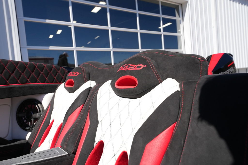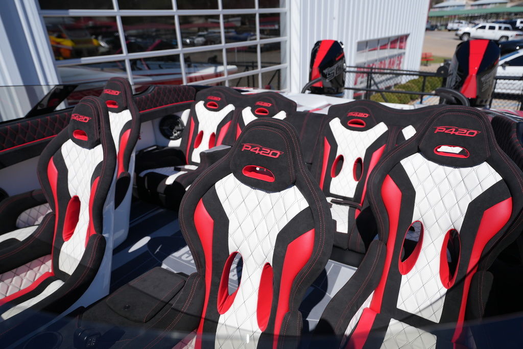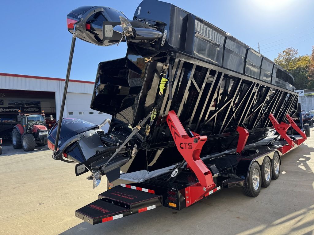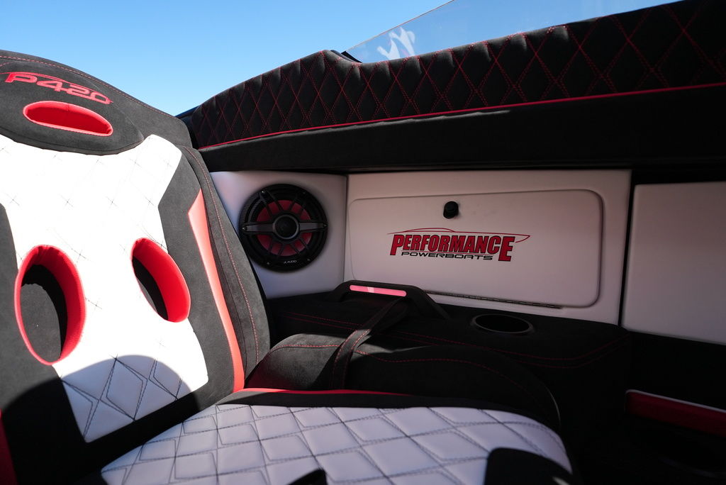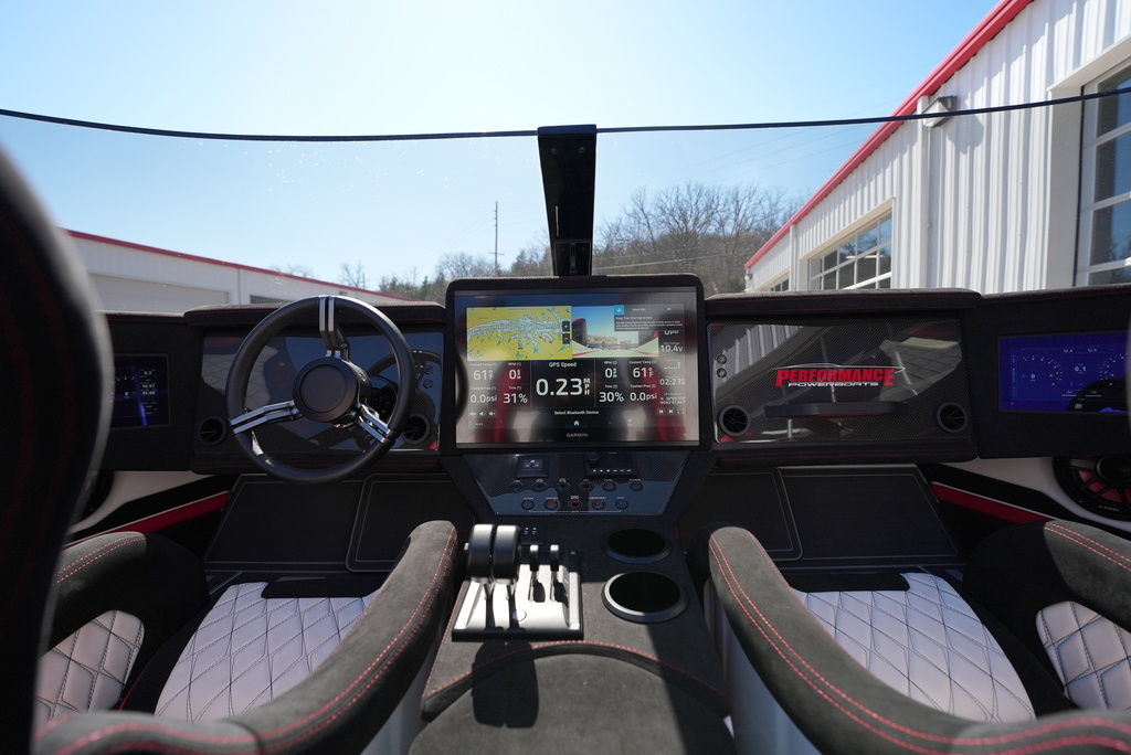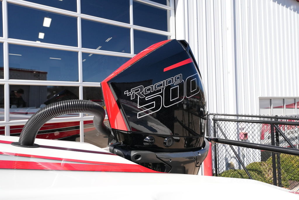 Carbon hull and deck lay-up, Vacuum-bagged e-Glass Epoxy/Carbon Fiber, Stringers & Bulkheads formed out of Foam Core/Carbon Fiber Reinforced, Faired Hull and Deck Joint, No Rub Rail, Wrap Around Windshield, Bocatech Switches, Lined Large Storage Locker Rear of Cockpit, Stainless Tie Bar, Billet Jack Plates, LED Nav and cockpit lighting, 3 AGM Batteries w/Remote Dash Switch, Bilge Pumps w/Automatic float Switches, 3 Bank Battery Charger, Cockpit blower vents, Illuminated Billet Cockpit handles, 8" Pop up cleats, QTY 6, Garmin 8622 22" Display Centered in Dash, Pull out Telescoping Ladder, Carbon Fiber dash panels, Cup Holders Qty 8, Mercury DTS Throttels and Shifters, Fire Extinguisher with Billet Mount, Sea Dek Flooring, Custom 8 person interior, Alcantara accents, Ultra Leather and Suede, Storage Compartments in cockpit with Performance logo, Fusion Head Unit, JL Multi Channel AMP, Speakers Sub and box, Shadow Caster Underwater lights, cockpit and Bilge lights, Tilt Steering, Isotta Steering wheel, Vessel View 903, Mercury CNC 5 Blade Cleaver Props, Cockpit cover