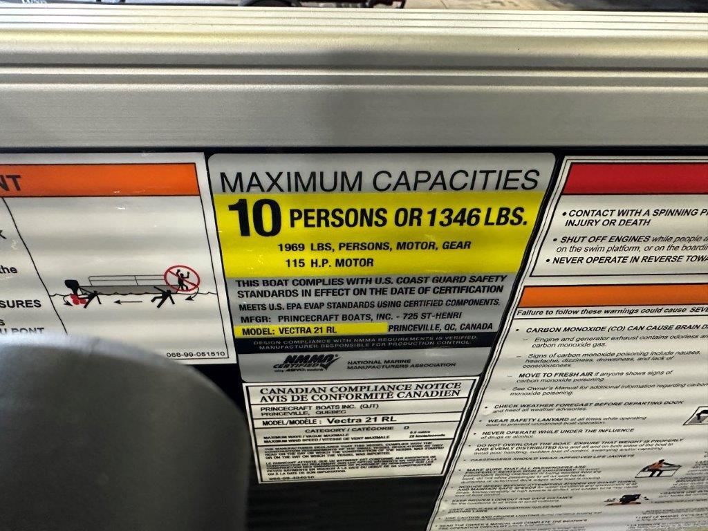 2025 Princecraft Vectra 21 RL Swingback Pontoon & Mercury 4-Stroke EFI. This 20' Rear Lounger Pontoon Has Lounge Seating Up Front With Storage, Side By Side Captain's Seats, Rear Facing Lounge Seating With Storage (Can Also Be Forward Facing Bench Seating), All Vinyl Floor, Bluetooth Radio/MP3 Player With 4 Speakers, Phone Charger, Multiple Cup Holders, New Battery, Bimini Top, Mooring Cover, LED Nav Lights, LED Docking Lights, Traditional Package, Two Tables, Built-In 29 Gallon Gas Tank, Tilt Steering, Helm Storage, Huge Rear Swim Deck With 4 Step Stainless Steel Ladder, Nice Front Deck, 25" Tubes. Rated For 10 People.