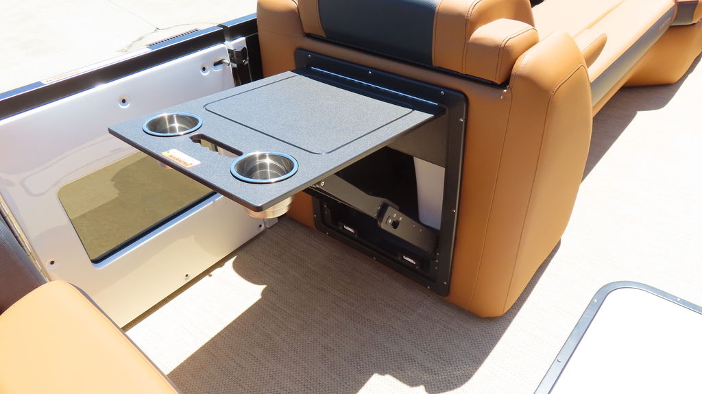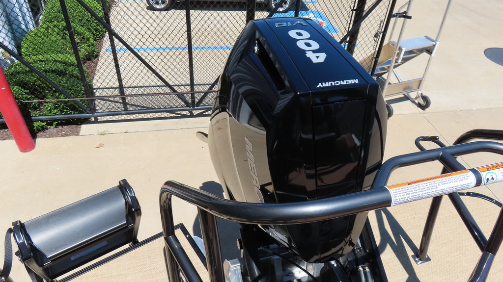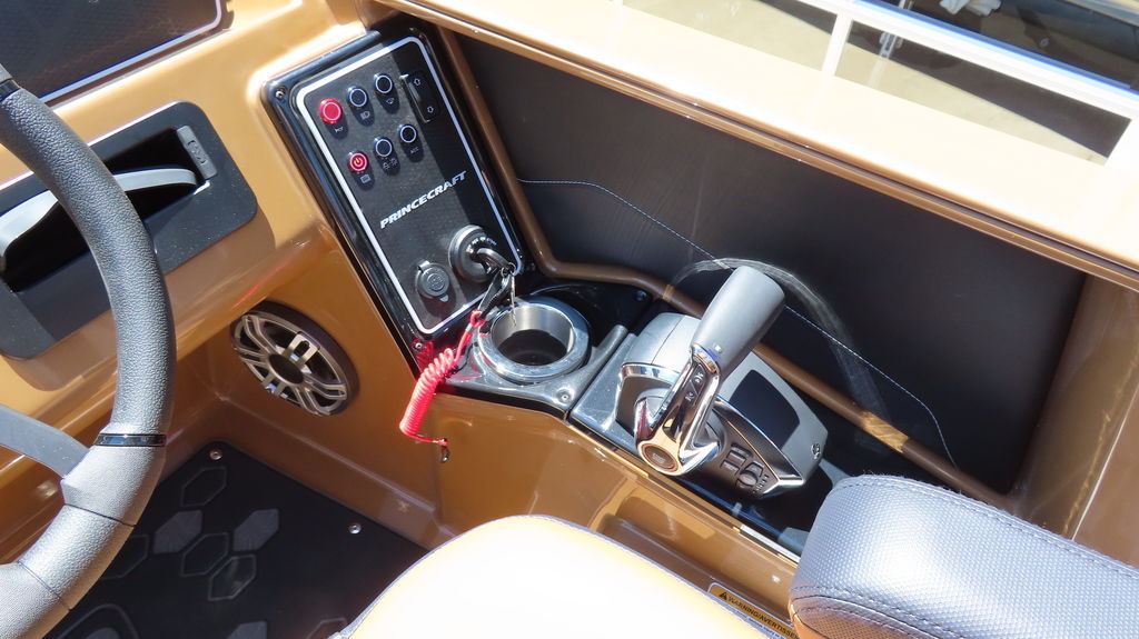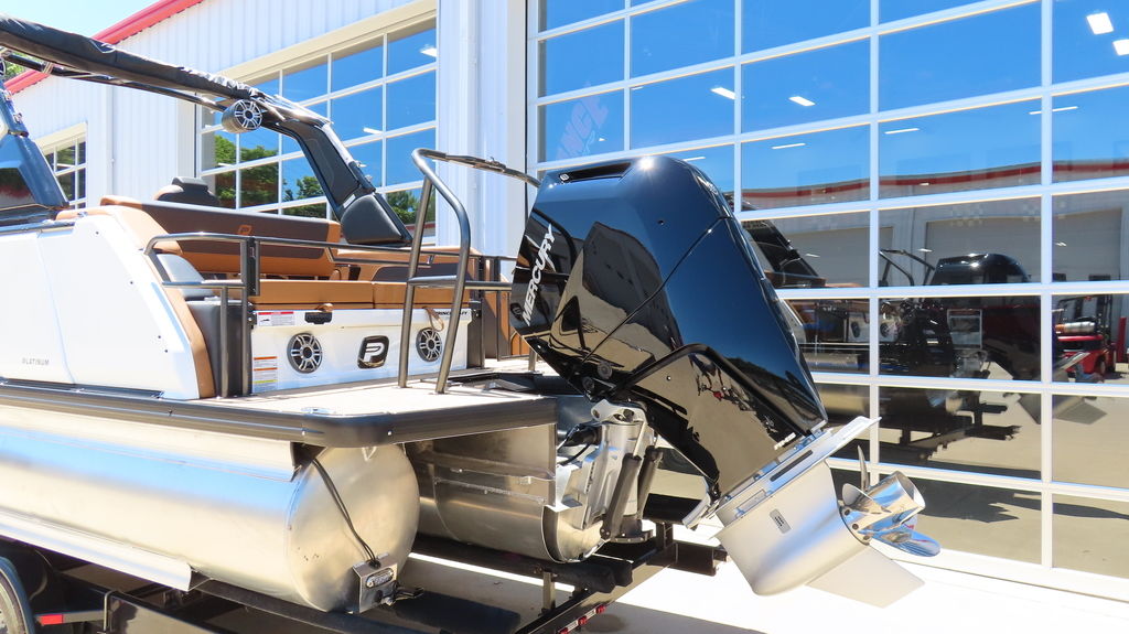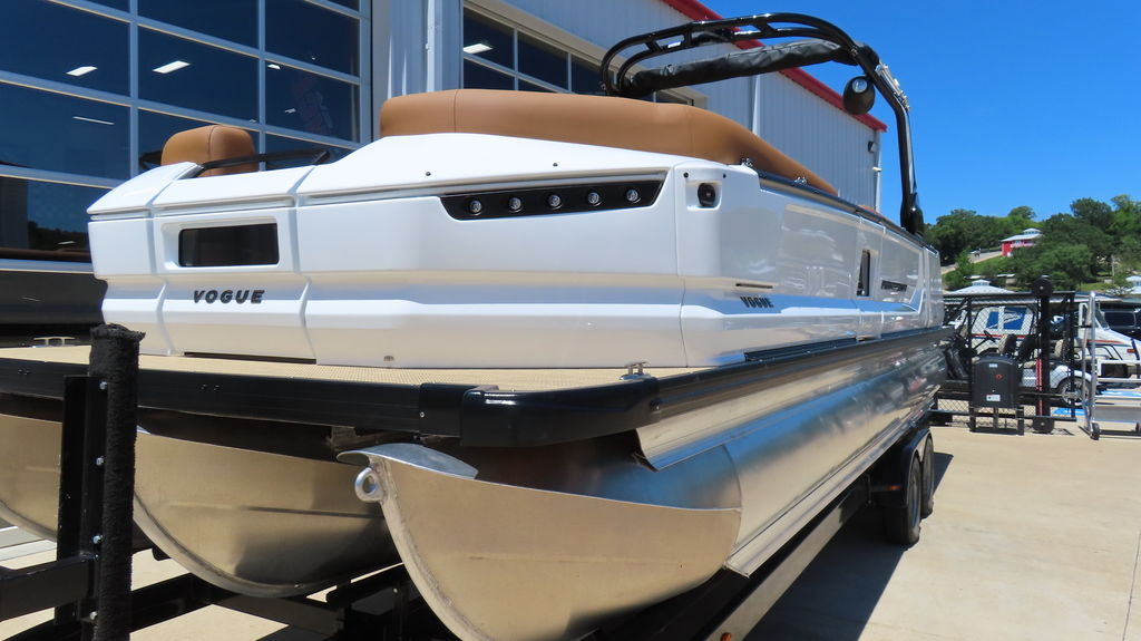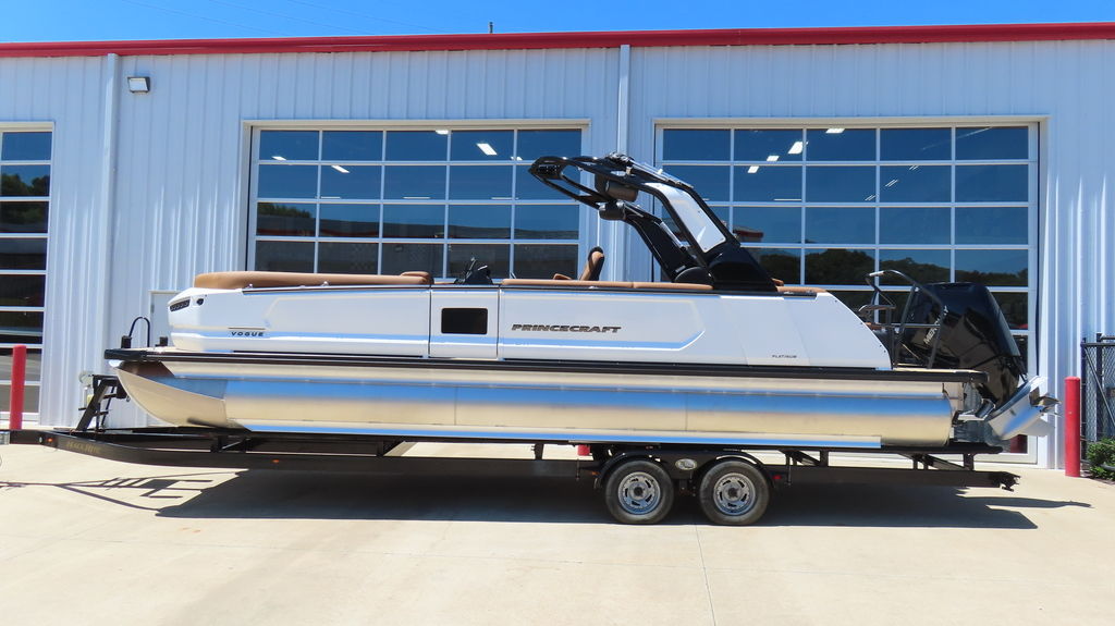 2025 Princecraft Vogue 27 RL Platinum edition powered by a Mercury Racing 400hp V10, Metallic White, Wakeboard tower with bimini top, Premium Stereo system, Battery bank system with charger, Wakeboard tower speakers, Underwater lighting, Refrigerator Drawer under captains chair, Pullout dog dishes, Digital Dash gauge cluster with built in vessel view, Rear table, Wireless cell phone chargers front and rear Full cover package