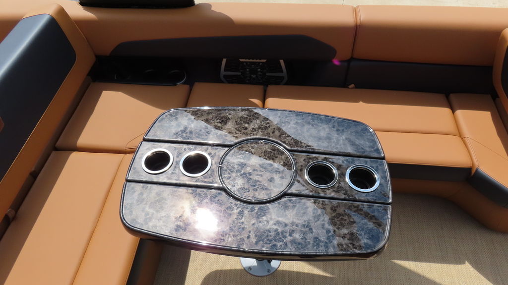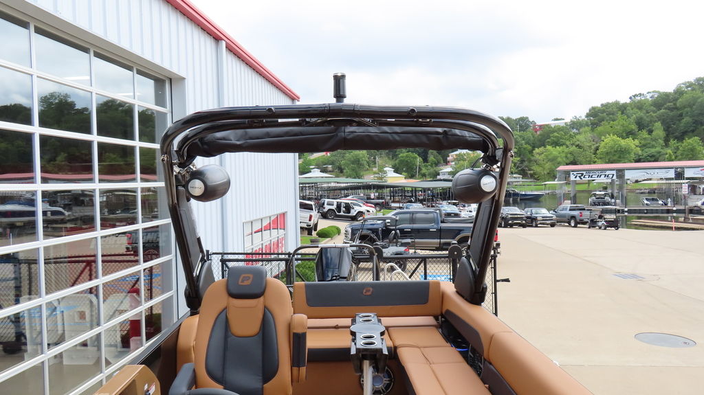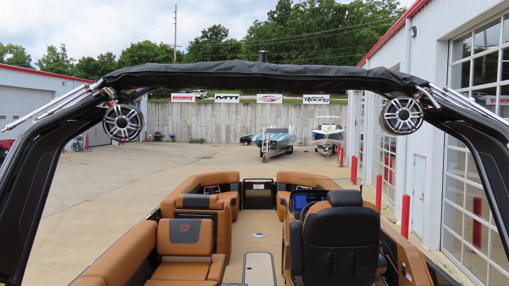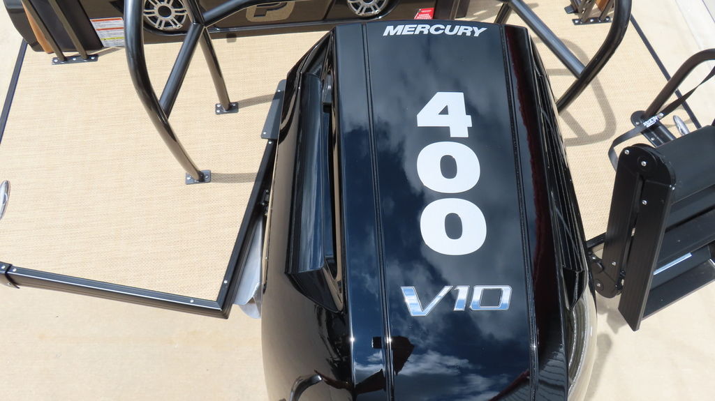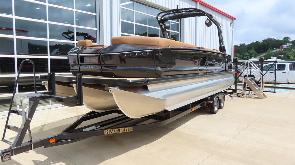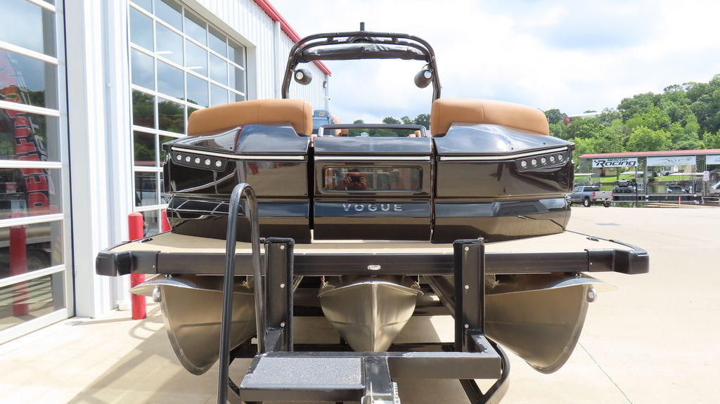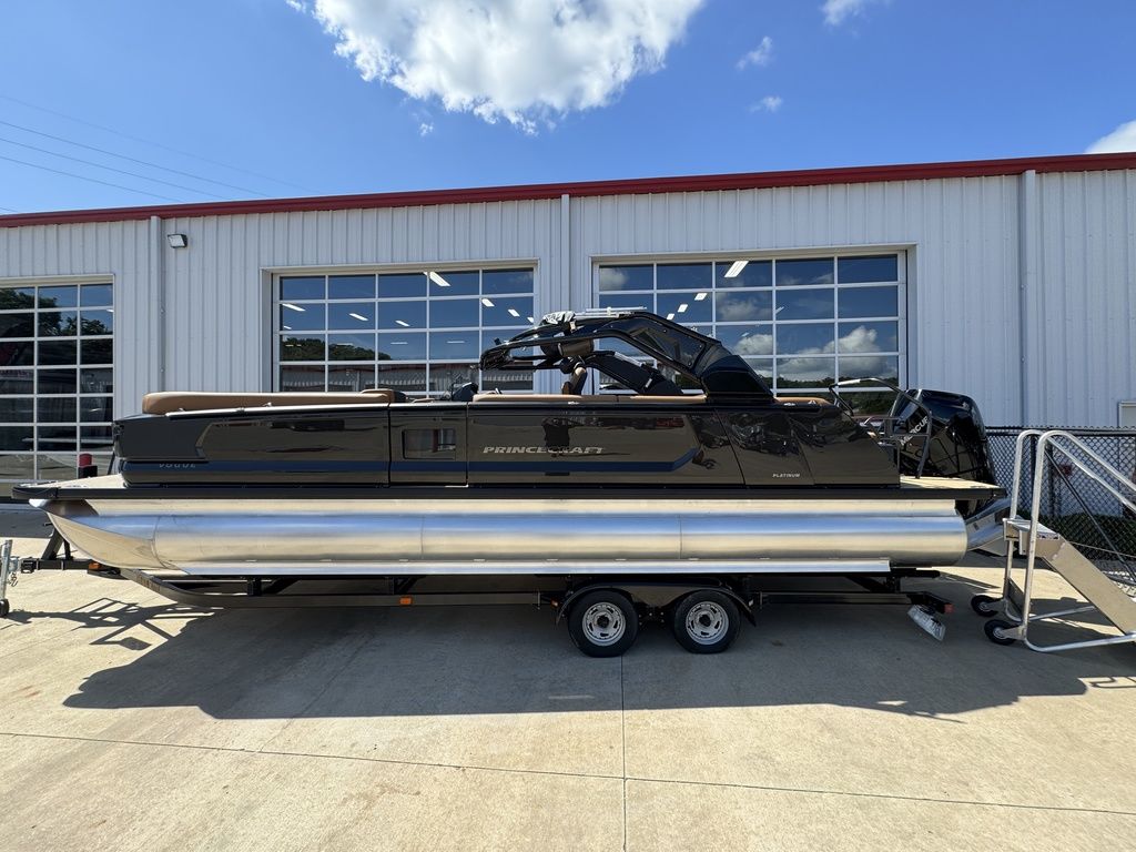2025 Princecraft Vogue 27 RL Platinum Edition powered by a Mercury Racing 400hp V10, metallic black, power folding wakeboard tower with double bimini top, premium stereo system, battery bank system with charger and remote switch, wakeboard tower speakers, underwater lighting, refrigerator drawer under captains chair, pullout dog dishes, pull out storage drawer under helm, Lillipad Revo Ladder, black chrome ski tow bar, digital dash gauge cluster with built in vessel view, rear removable table with folding wings, wireless cell phone chargers front and rear full cover package