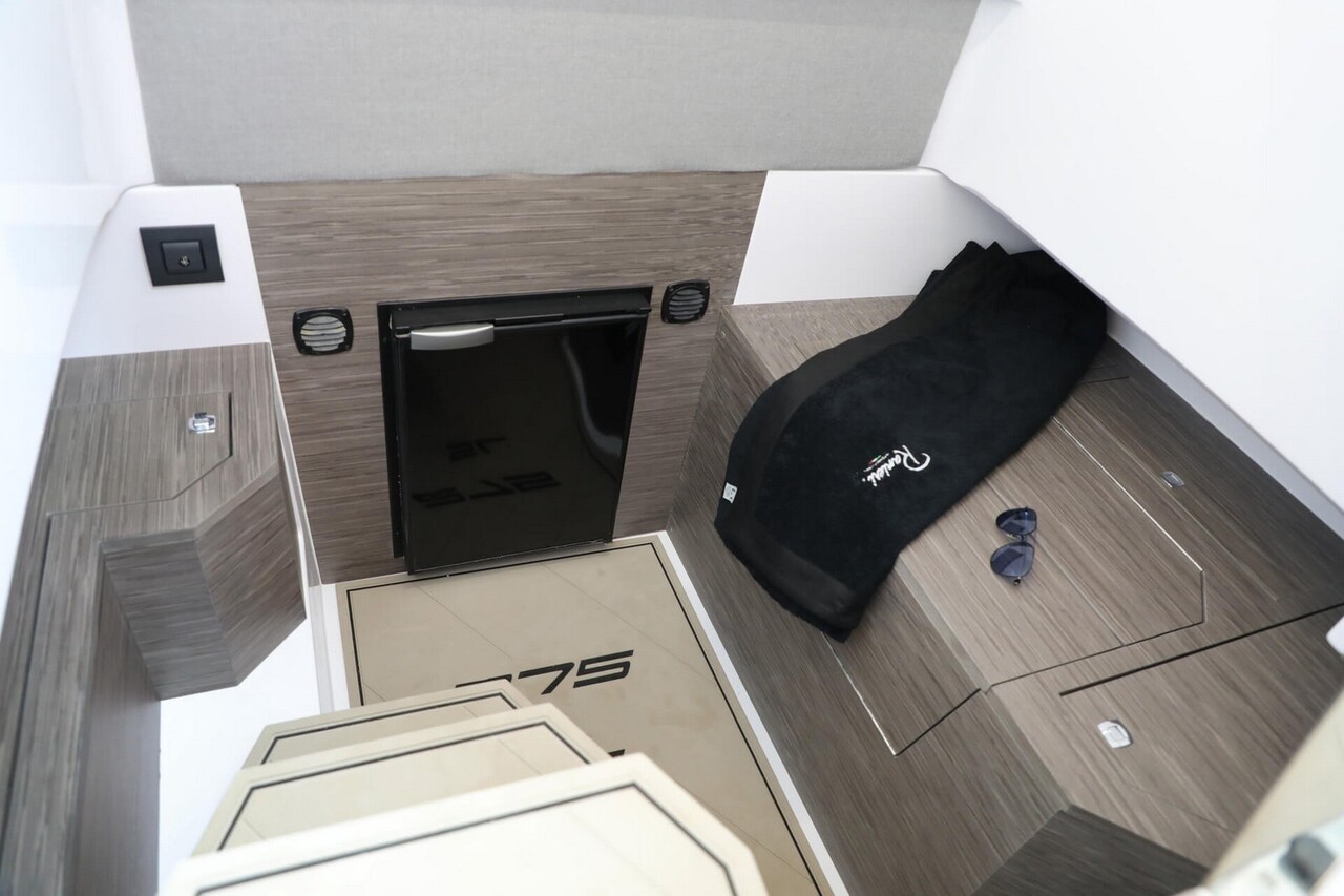 2 Console porthole with black plexiglass cover - 2 S-Line comfort seats with boolster - 8 Bottle holders - Luxury cabin equipment - Gas extractor - Compass - Stainless steel anchor cubia - Bow "C" dinette with sundeck extension - Refrigerator - Complete shower system - Fuel gauge - Navigation lights - Cabin furniture in dark grey oak - N° 2 Bow seat backrest - King engine cable deck - Stern platforms at walking level - Fuel pump bilge with automatic/manual control - Storage compartment - Cockpit with Seadeck - Black Plex hull profiles - Redan hull HIS Gen III - Electric windlass - White hull - Stainless steel telescopic ladder - Bow seat - Water tank - Fuel tank - Complete set of stainless steel handrails - Tilting backrest for stern seat - Standard external upholstery - Interior upholstery - King Starboard stern table - Full hydraulic steering up to 300HP (Monopropeller) - Electric Horn - Electric Marine Toilet with Waste Water Tank