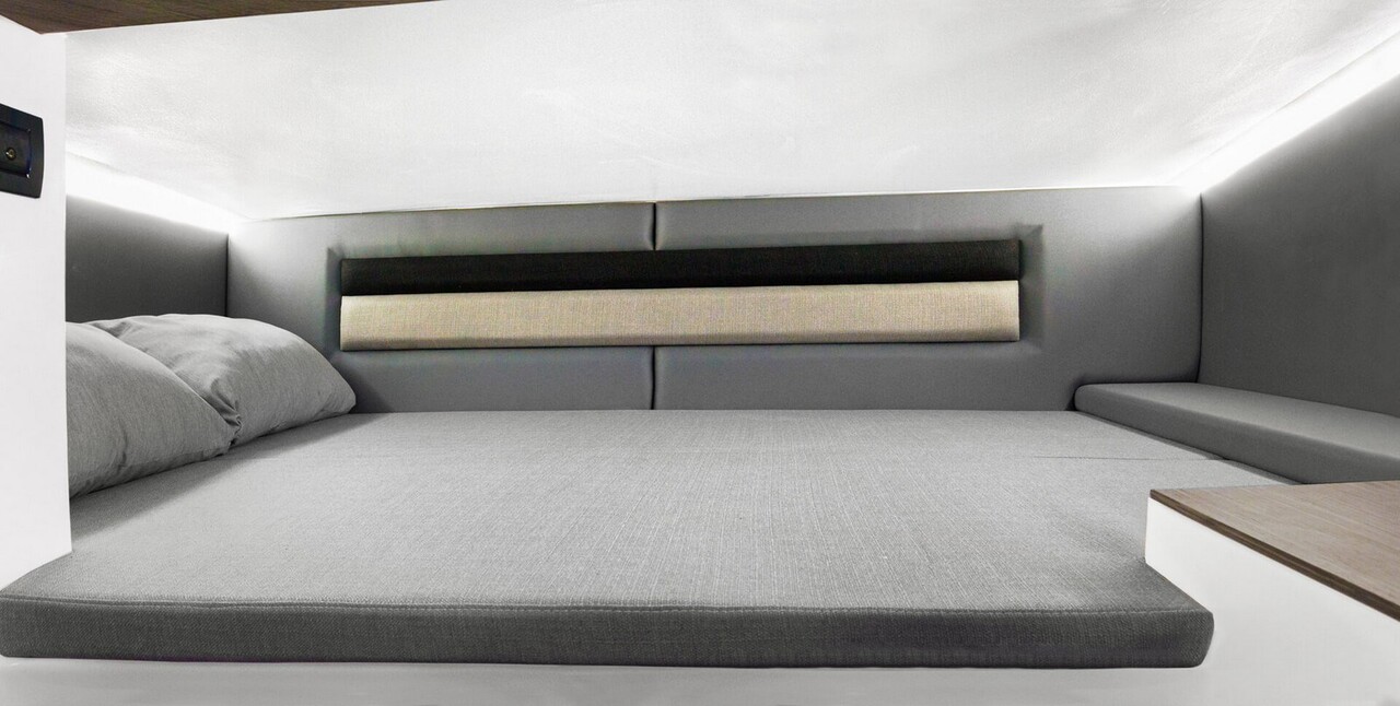 The Fully - Developed Cockpit System by Ranieri International construction technique has made it possible to create a welcoming cabin with two beds, a bench cabinet that hides a comfortable toilet and numerous storage compartments.