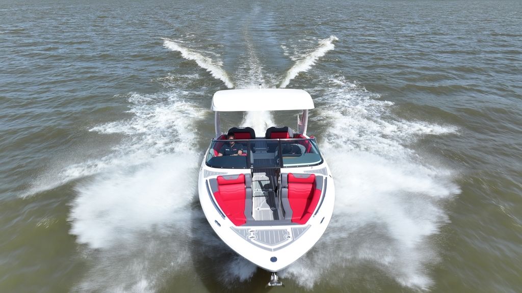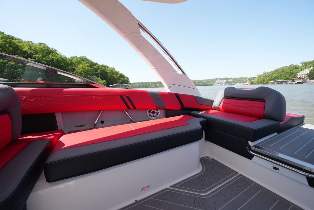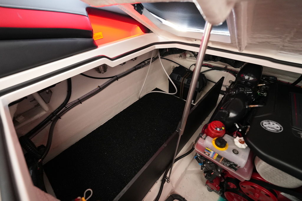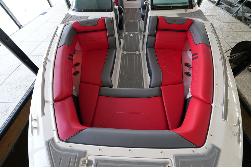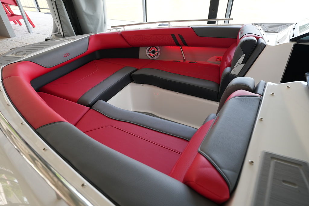 Cool touch marine Vinyl, Power collapsible Tower, battery charger, automatic fire system, bow thruster, transom shower, pump out toilet, bow filler cushion, underwater power platform, Flag pole, windlass anchor, ultimate JL Audio package, trim tabs, twin Garmin screens, Foam Flooring, and much more!
