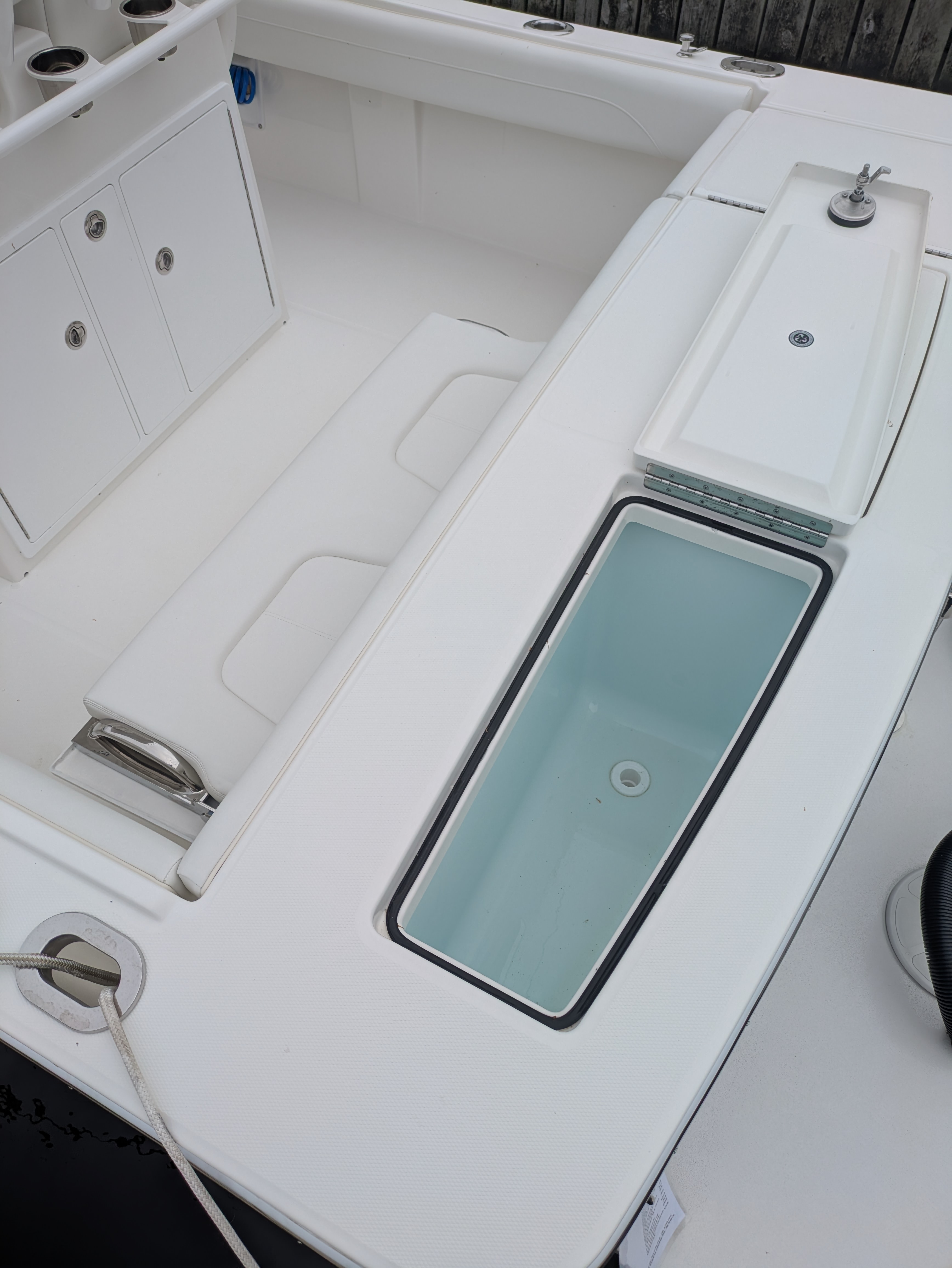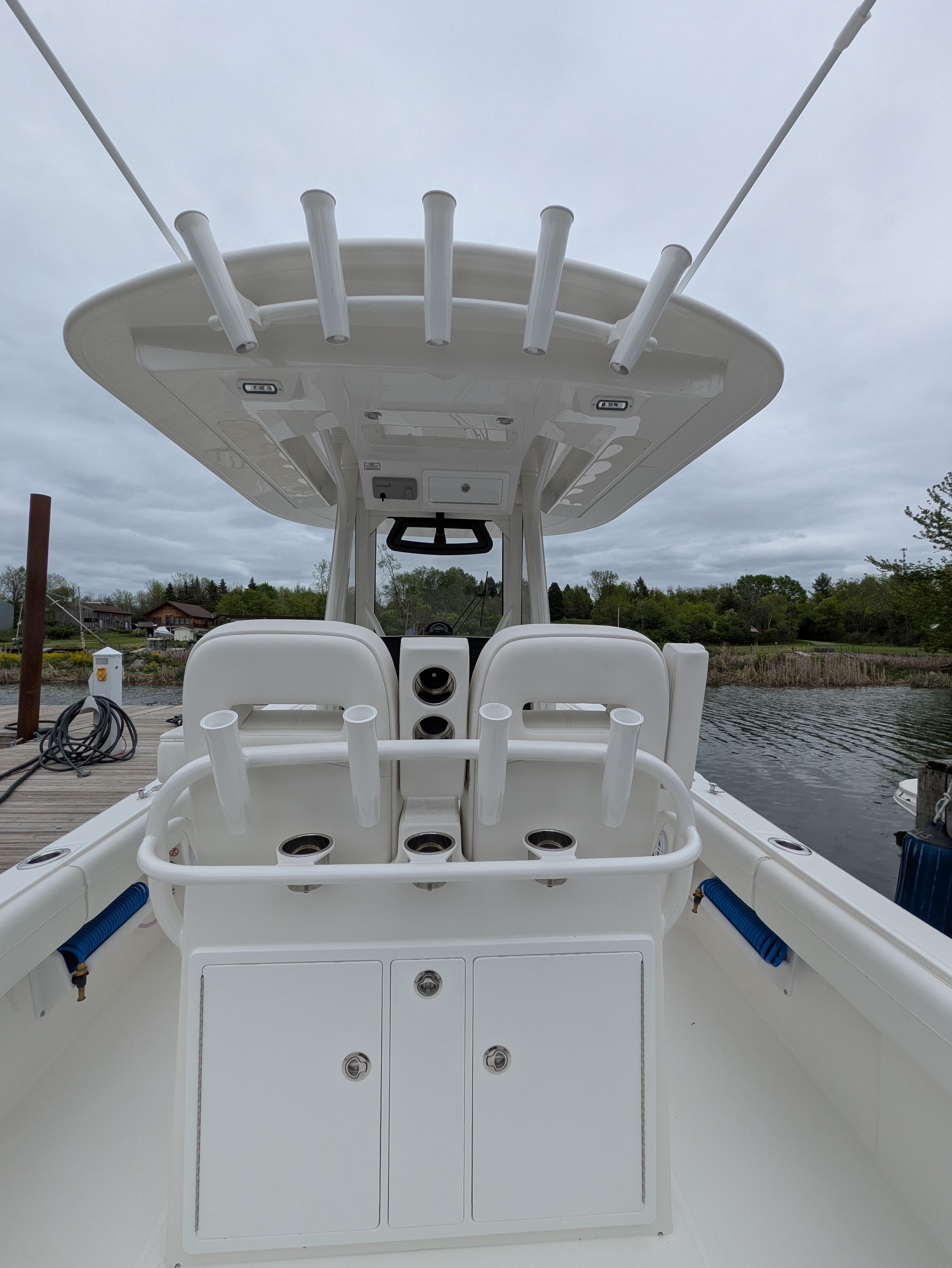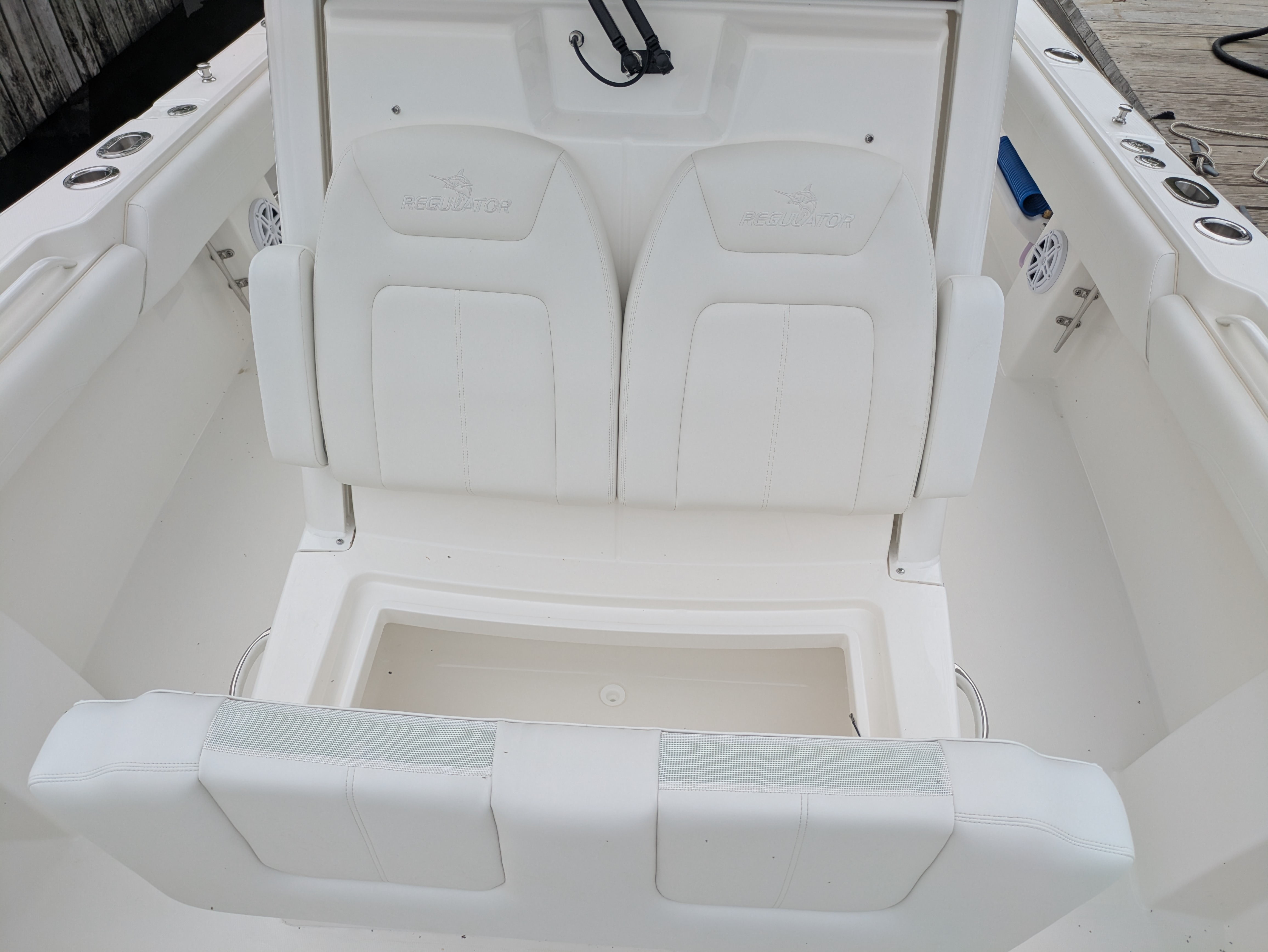 - 28 Tackle Center w/ Upholstered Helm Seating for Two w/ Individual Folding Footrests, (2) Cup Holders, and Seatback Rocket Launcher w/Tackle Center & Storage