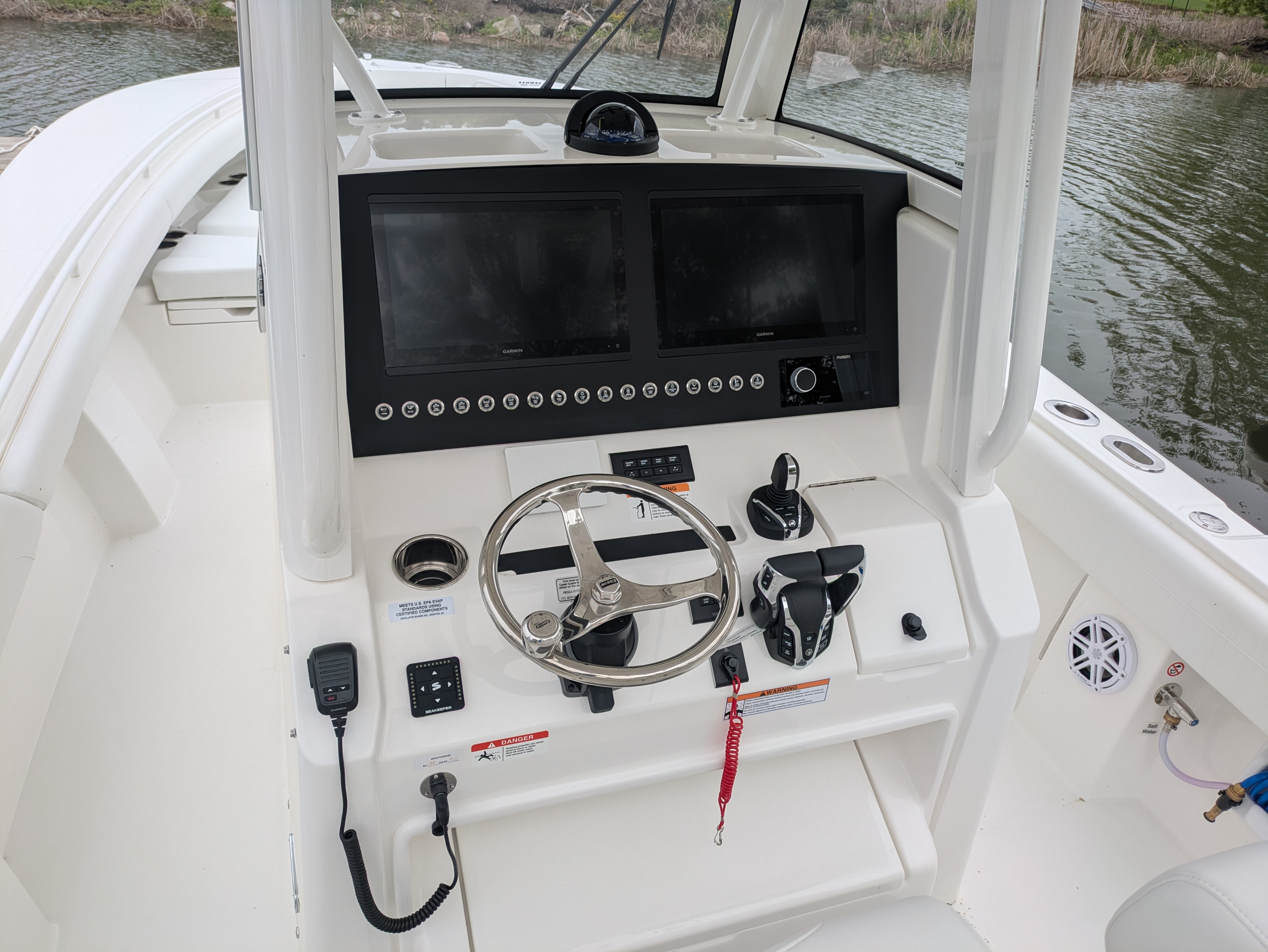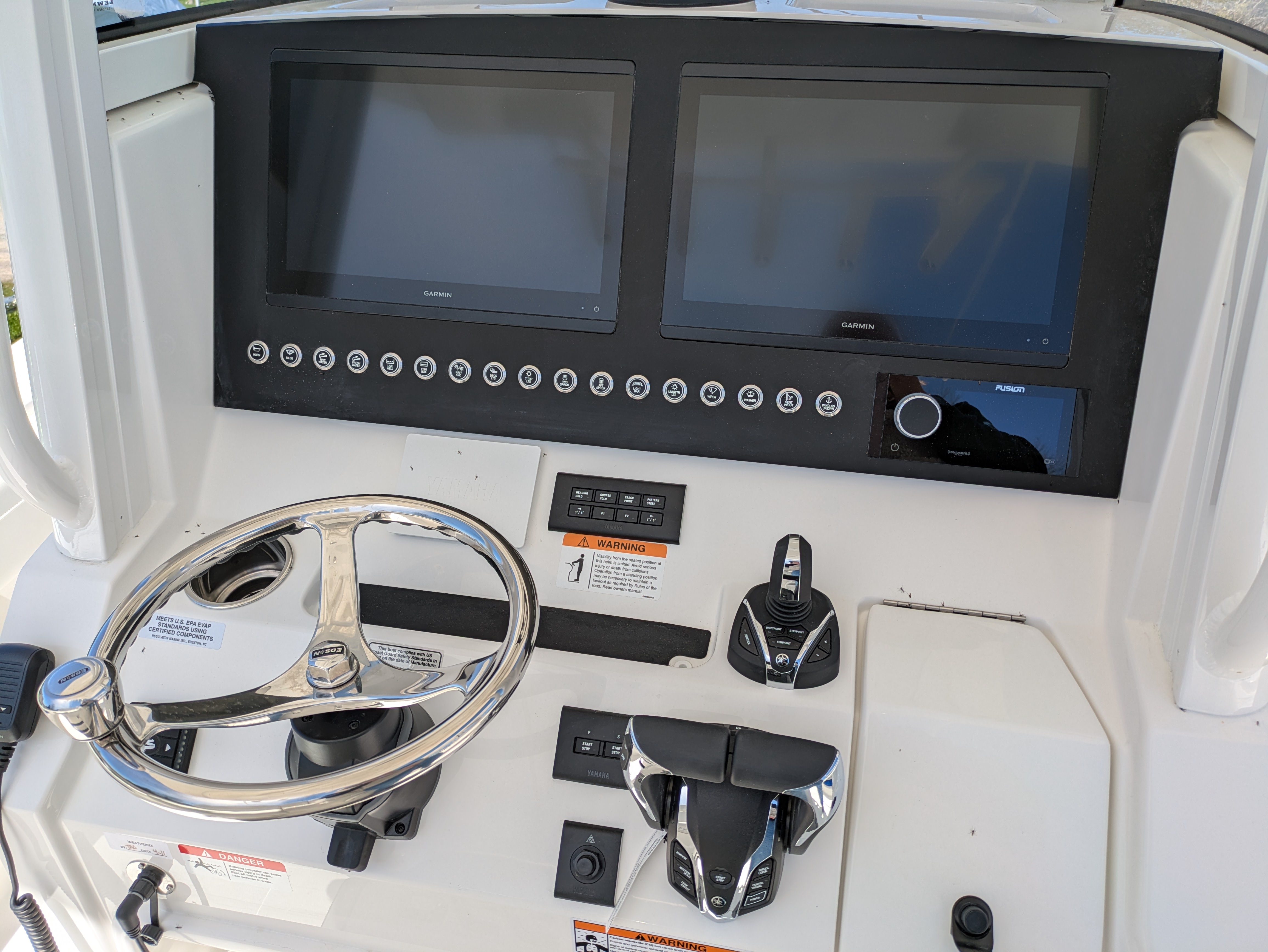 - Factory-Installed Garmin® 28 Premium Package: Two 16" GPSMAP® 8616 XSV Multi-Touch Widescreen Chartplotter/Sonar Displays, VHF 215 AIS Radio with Dual 8' Antennas, Airmar® B275LHW with Wide Beam 1kW CHIRP Transducer, Plus Black Flushmount Electronics Face and Remote Mic