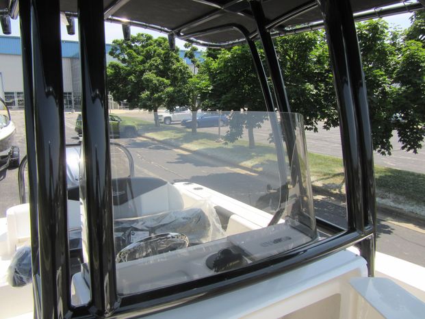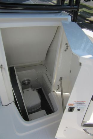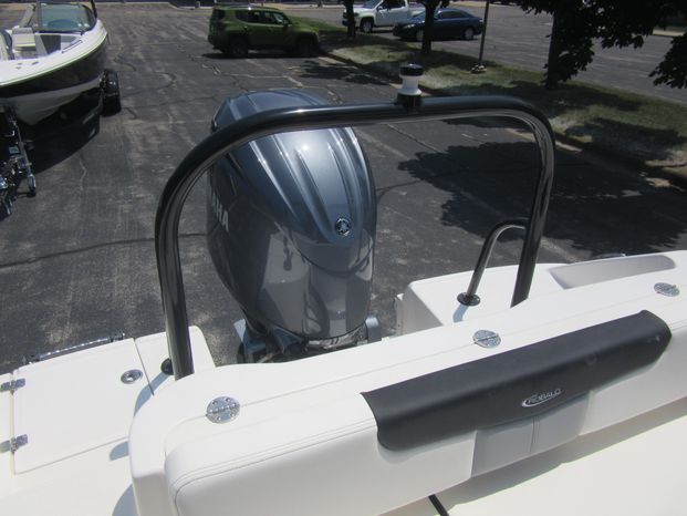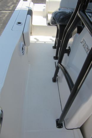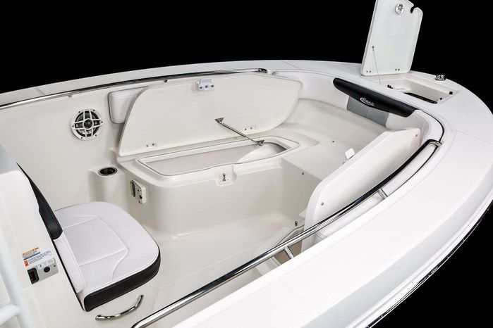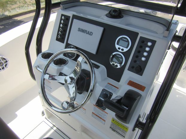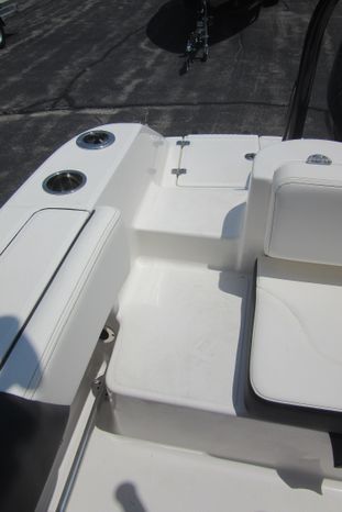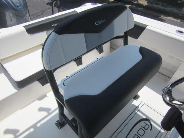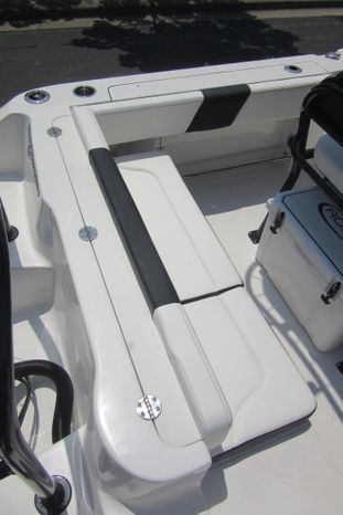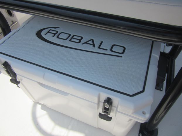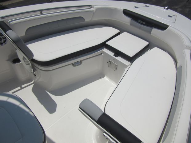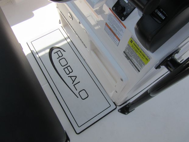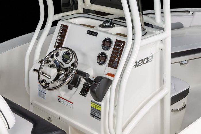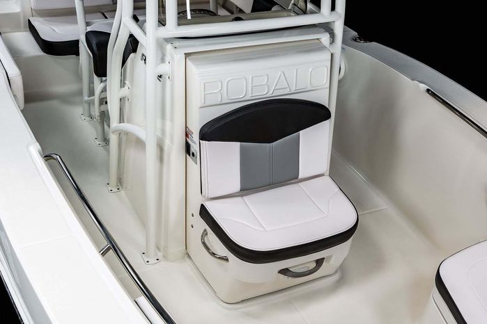 Robalo's R202 Explorer offers the convenience of a center console layout and ease of maintenance, plus expanded seating comfort for a full day of on-water family fun. Well-padded forward seating includes removable backrests and a wide aft bench adds storage and conceals a large live well. Center console includes a private porta-potty compartment. T-top includes rocket launchers and adds rigid hand-holds in addition to sturdy shade and outstanding style. This model includes a long list of standard features from Robalo and is loaded with these factory options and dealer additions:
