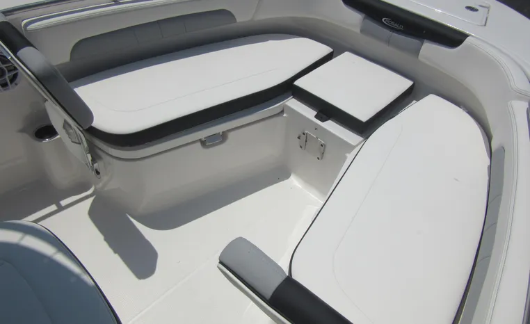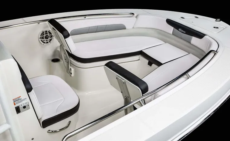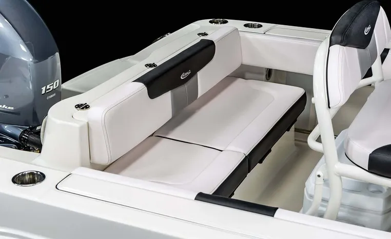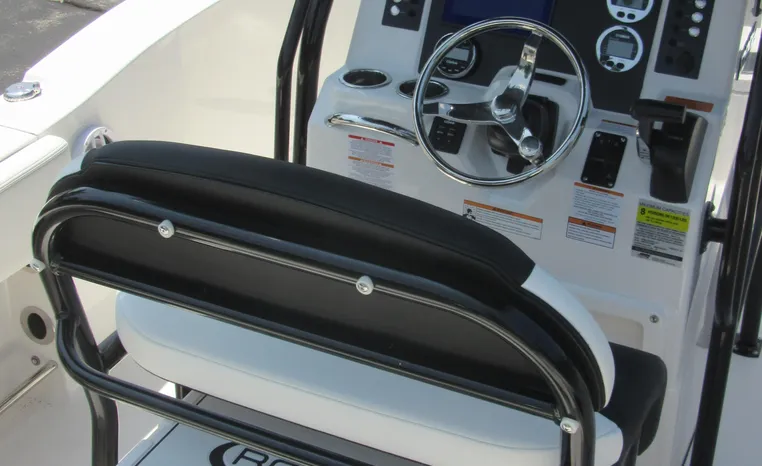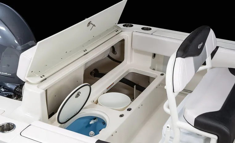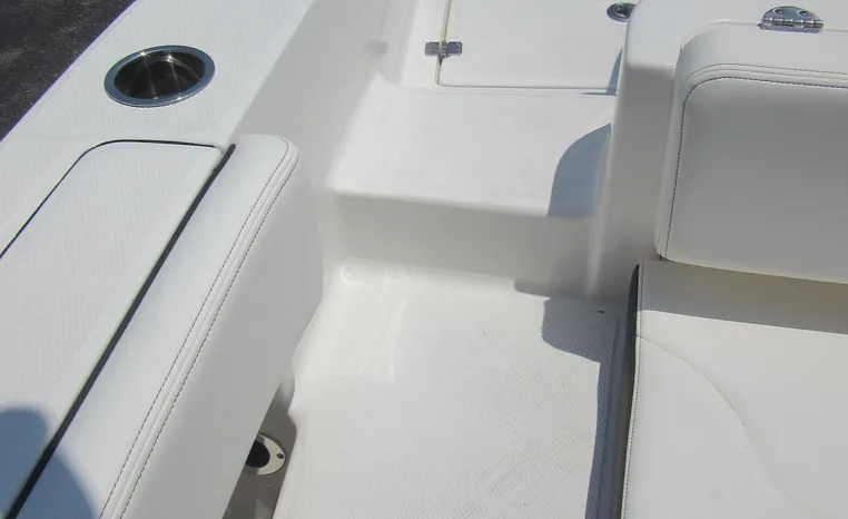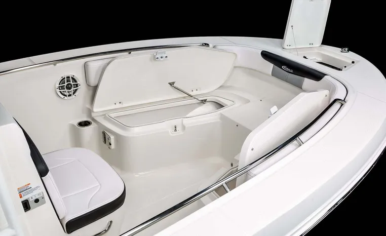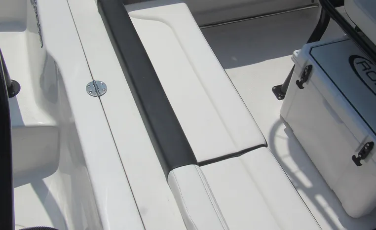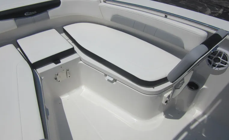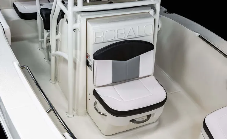 Robalo's R202 Explorer offers the convenience of a center console layout and ease of maintenance, plus expanded seating comfort for a full day of on-water family fun. Well-padded forward seating includes removable backrests and a wide aft bench adds storage and conceals a large live well. Center console includes a private porta-potty compartment. T-top includes rocket launchers and adds rigid hand-holds in addition to sturdy shade and outstanding style.