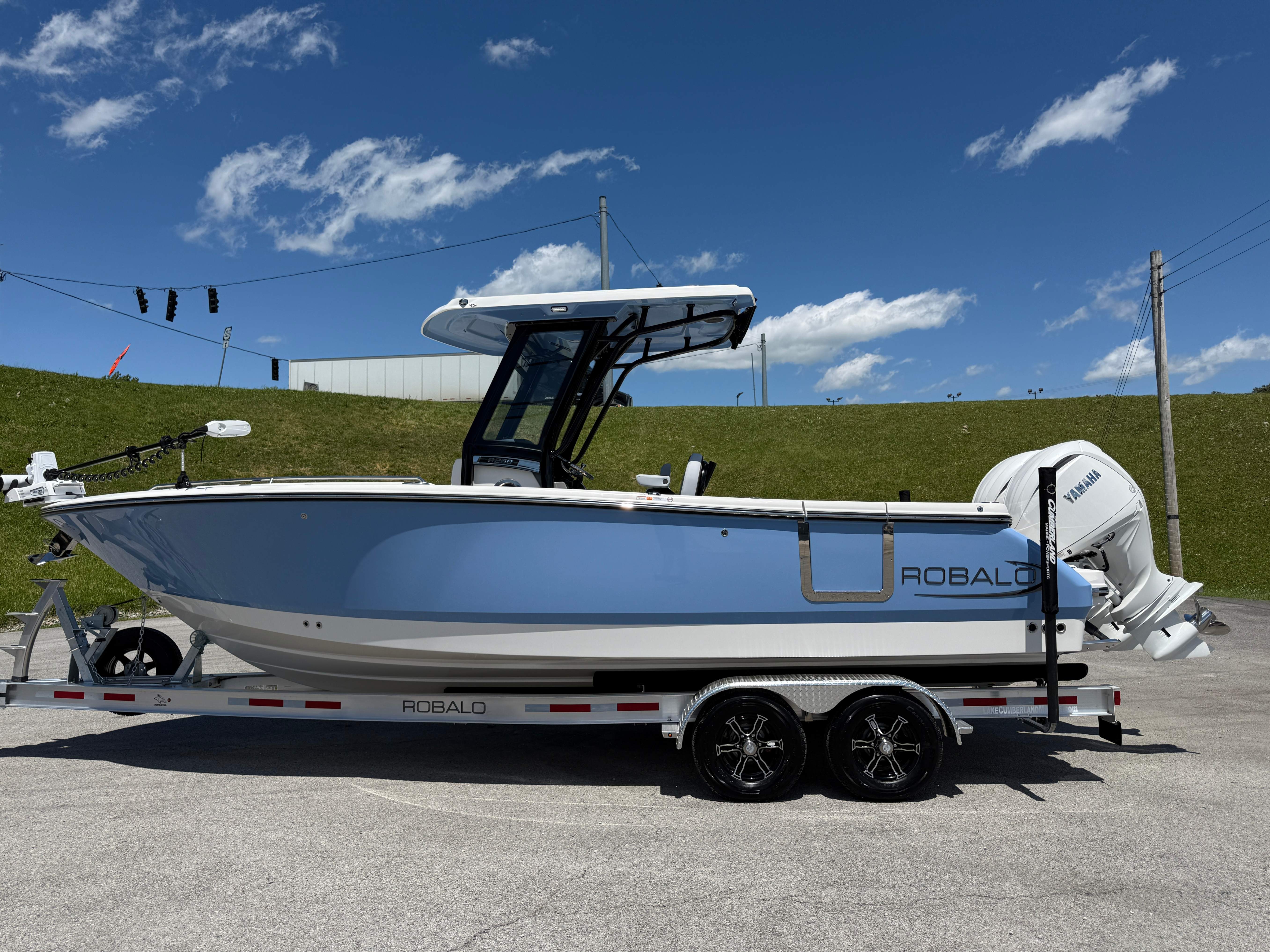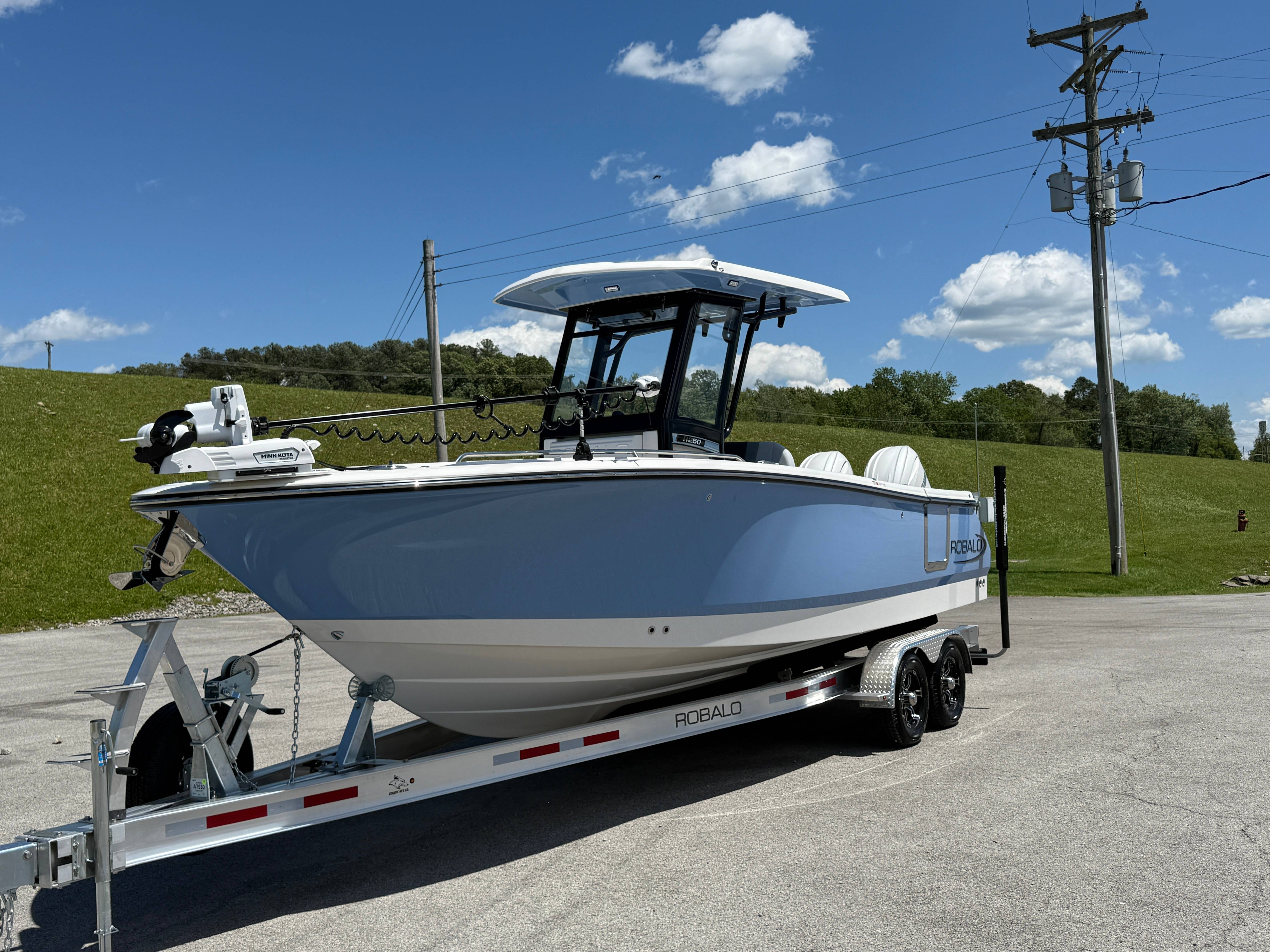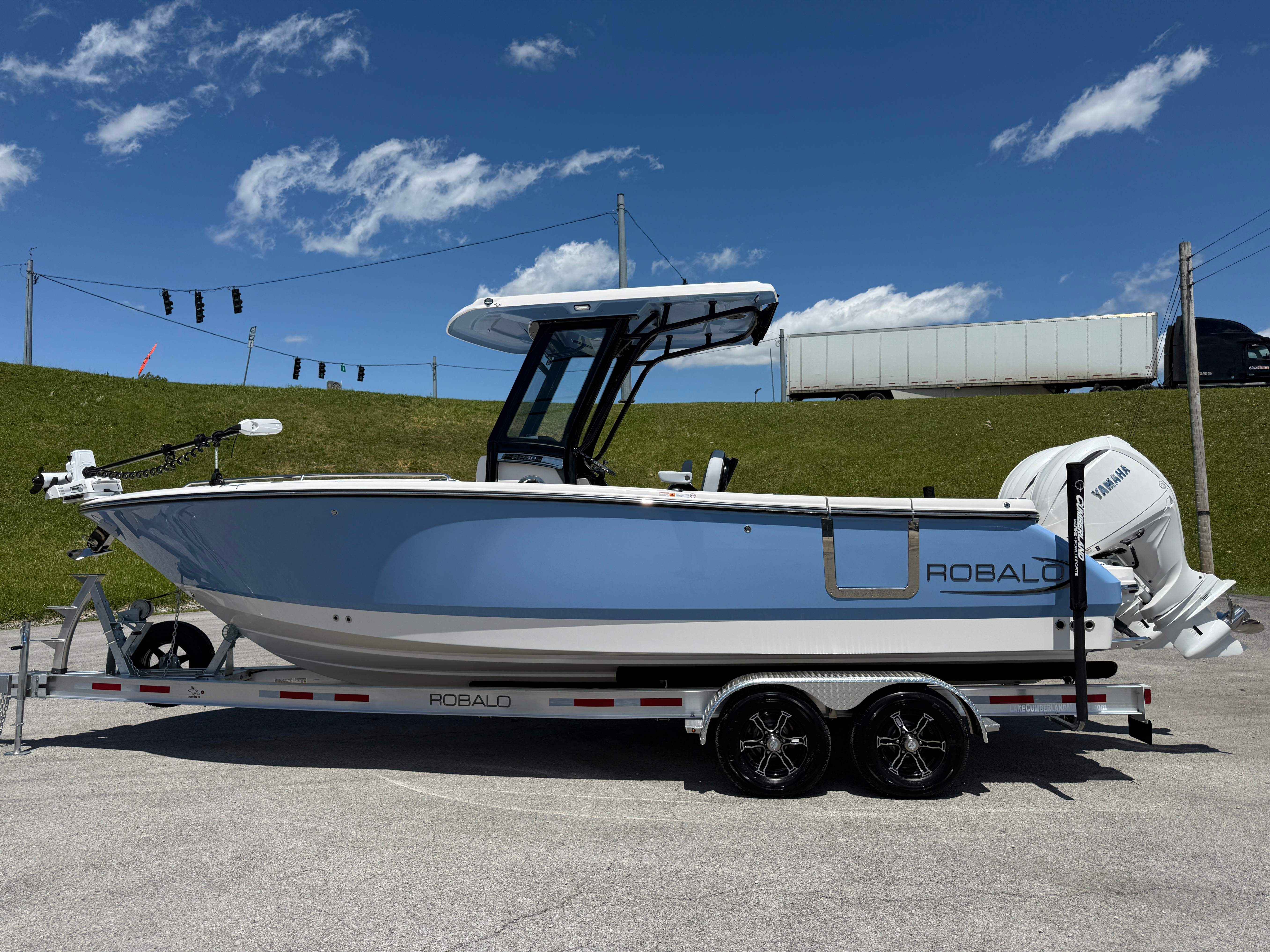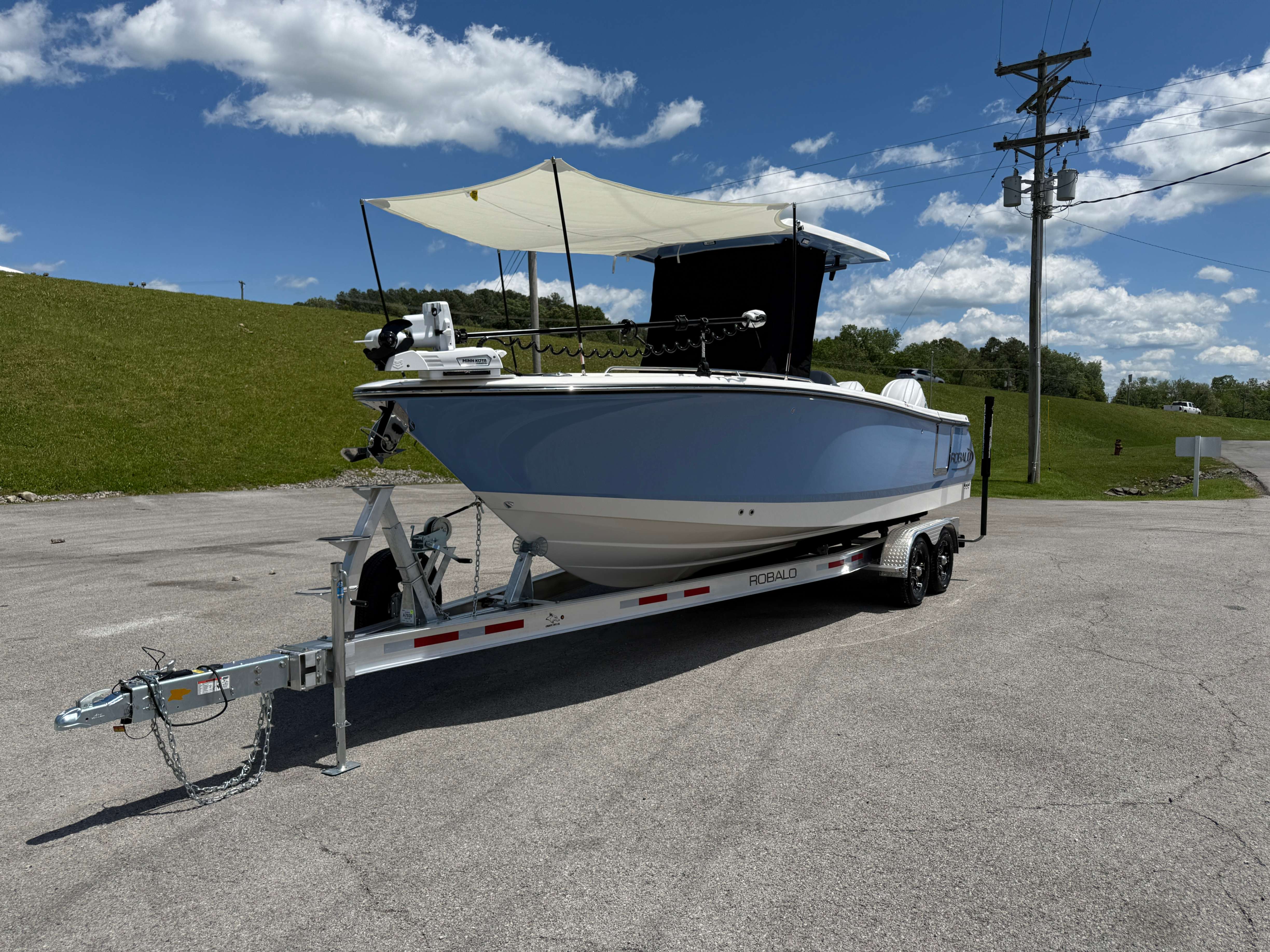 2025 Robalo R250 UNIQUE KEY FEATURES • 20 lb. Galvanized Anchor, 200 Anchor Rope, 15 Chain • 5-Year Premium Level Limited Component Warranty • Cockpit Side Entry Door with Custom SS Frame and Hardware • Digital Gauges • Dual Battery System with Crossover Switch and Voltage Regulating System (VSR) • Fiberglass Hardtop with Powdercoated Frame Includes: Rod Holders, Storage Box, LED Spreader Lights, and Speakers • Freshwater & Raw Water Washdowns/Showers • Full Transom Seat Folds Flush into Transom Wall • In-Floor Storage • Insulated and Overboard Draining Bow Fishboxes • Kevlar Reinforced Hull • Leaning Post Powder Coated with Dual Flip-Up Bolsters, Backrests, Rodholders, and Cooler • Limited Lifetime Hull Warranty • NMMA Certified • Poured Composite Transom Coring • Premium Envision Marine Silicone Upholstery • Transom Livewell • Transom Walkthrough Door • Trim Tabs w/ LED Indicator Lights • Walk-In Head Compartment w/Light & Opening Window • Waterproof Wireless Phone Charging Dock • Wrap Around Cockpit Bolster Padding & Removable Bow Cushions Hull Side Gelcoat - Steel Blue Cockpit Interior - Harbor Mist Hard Top Complete (Black Powder Coated) Hardtop Underside Gel Color - Steel Blue Forward Canvas Fly - White Canvas Leaning Post Cover and Console Cover Twin Simrad NSS12 EVO3S Simrad NMEA 2000 Package with Engine Data and Audio Interface VHF Radio Simrad SS175M Transducer JL Audio Sound System Upgrade Trolling Motor with Triple Bank Charger - Minn Kota Riptide Terrova Quest 36V 115lb Thrust, 87" Gravity Discharge Porcelain Toilet System with 6.5 Gallon Holding Tank and Overboard Discharge Seadek Helm Mat - White Bow Table with Dedicated Storage Bow Filler Cushion Stainless Steel Drink/Rod Holders (2) Leaning Post with Reversible Backrest, 2 Rod Holders and Arm Rest- Black Powder Coated Stainless Steel 20lbs Anchor Stowable Stainless Steel Side Entry Boarding Ladder Windlass Package 5 Year Premium Level Limited Component Warranty Aluminum Tandem Axle Trailer with Aluminum Wheels and Side Guides Spare Tire Kit - Aluminum Wheel