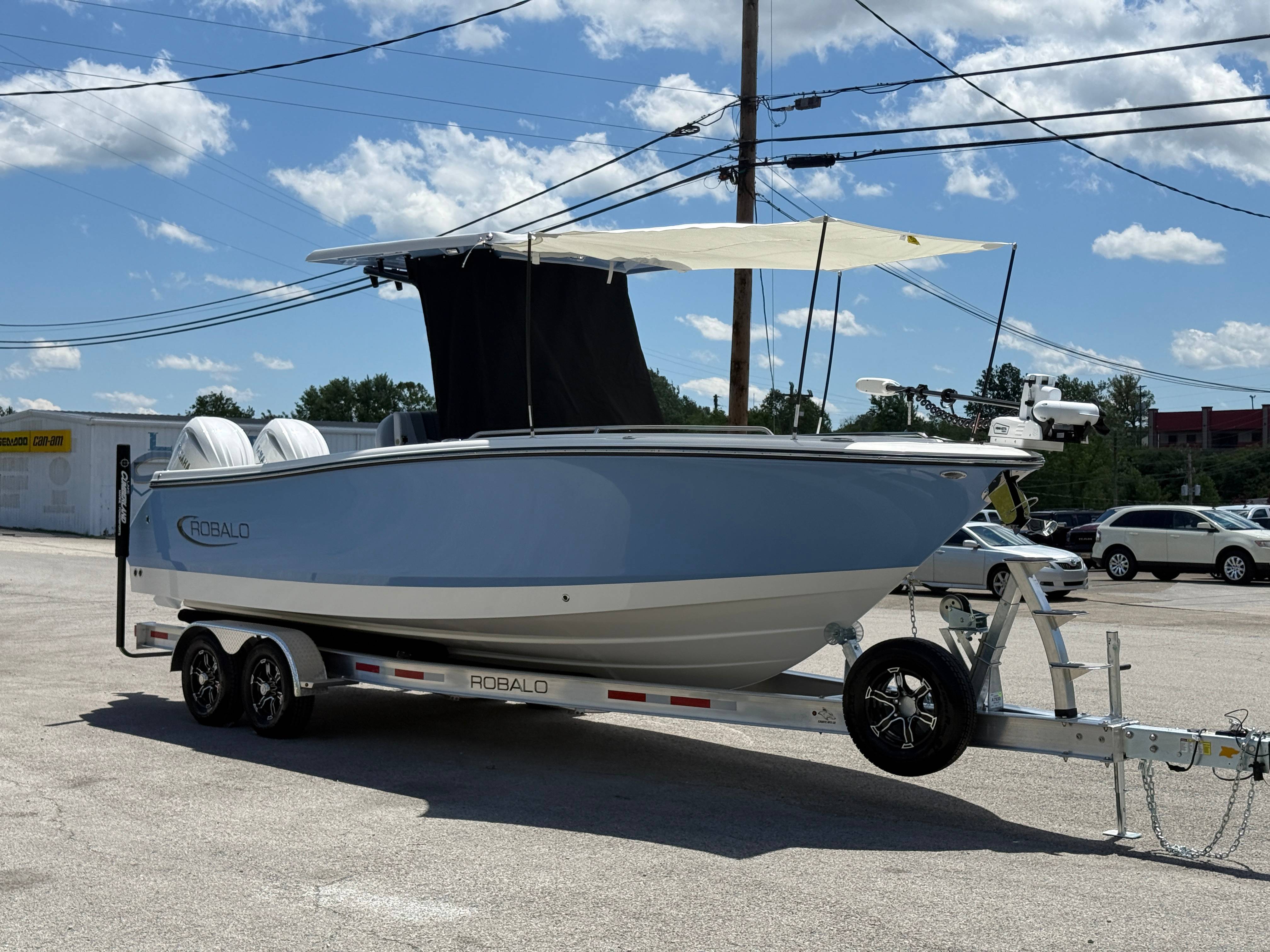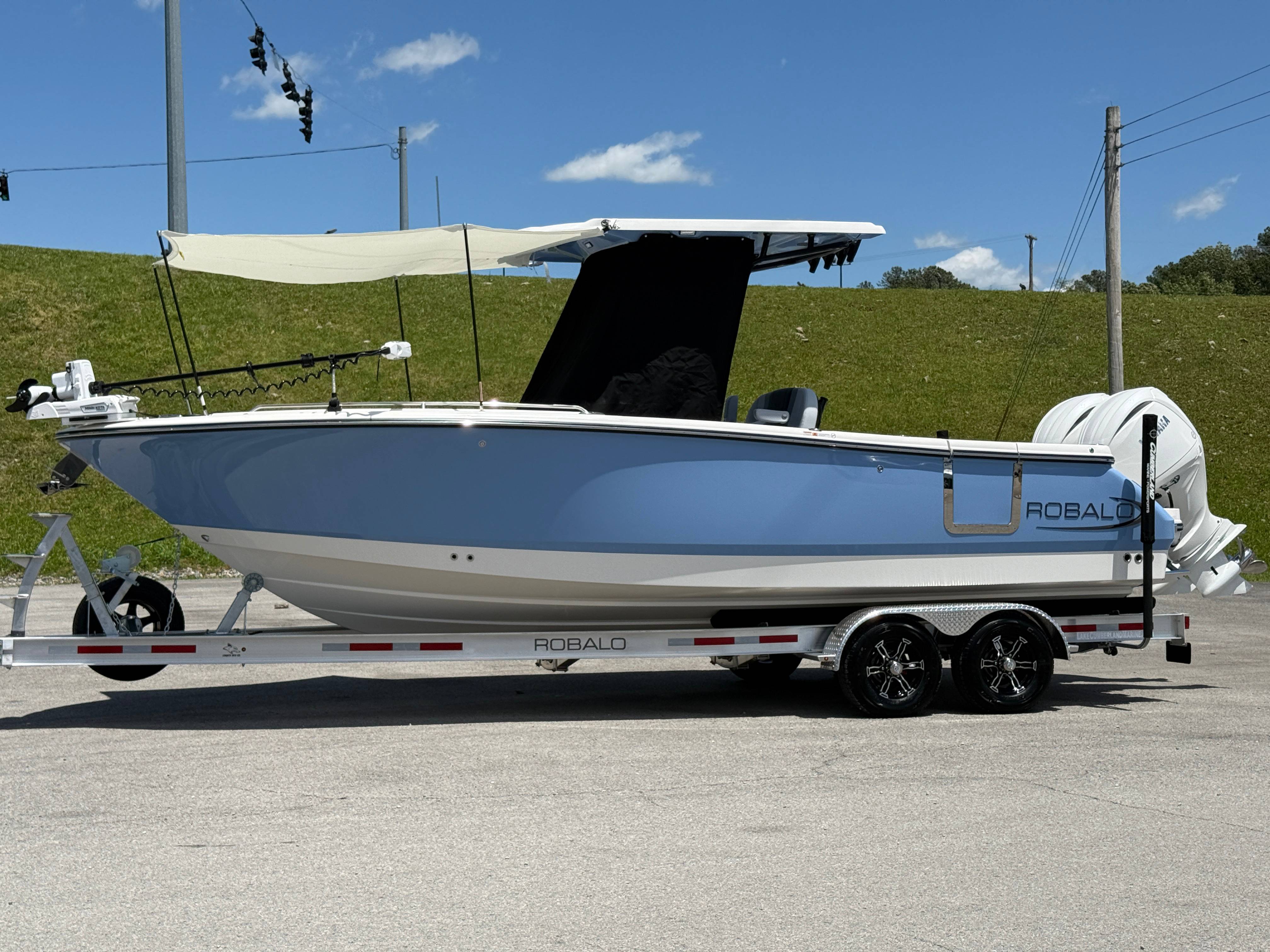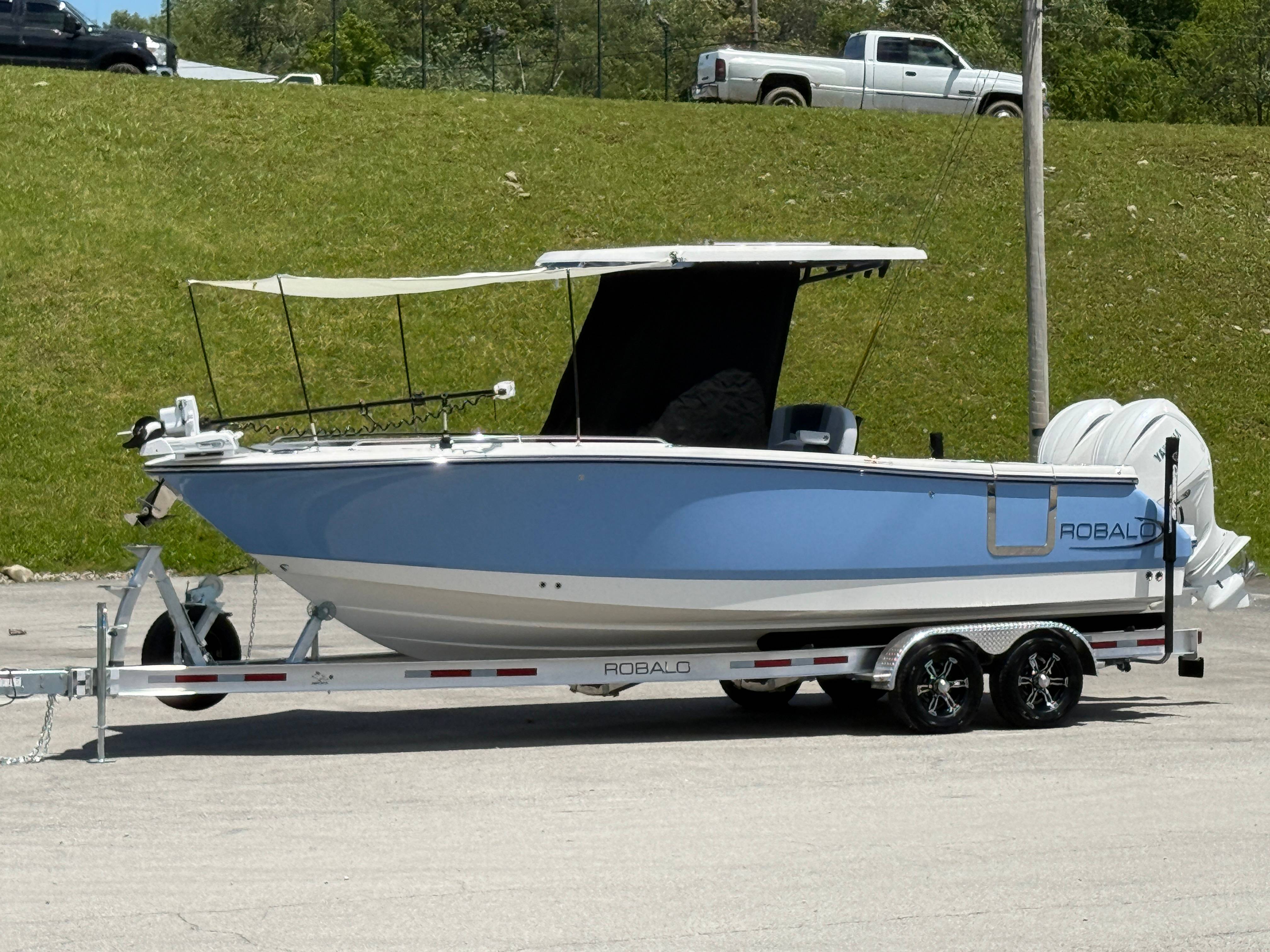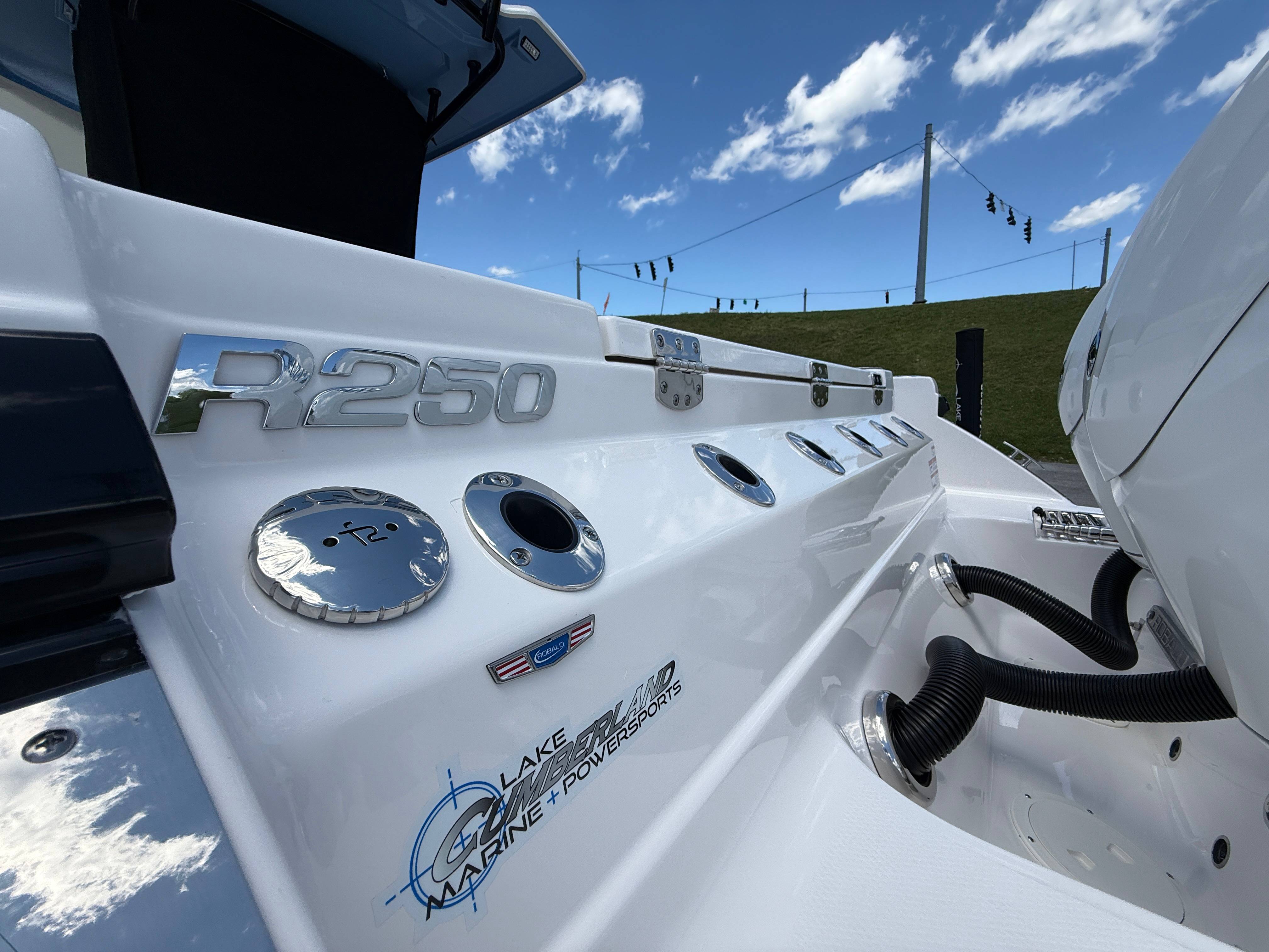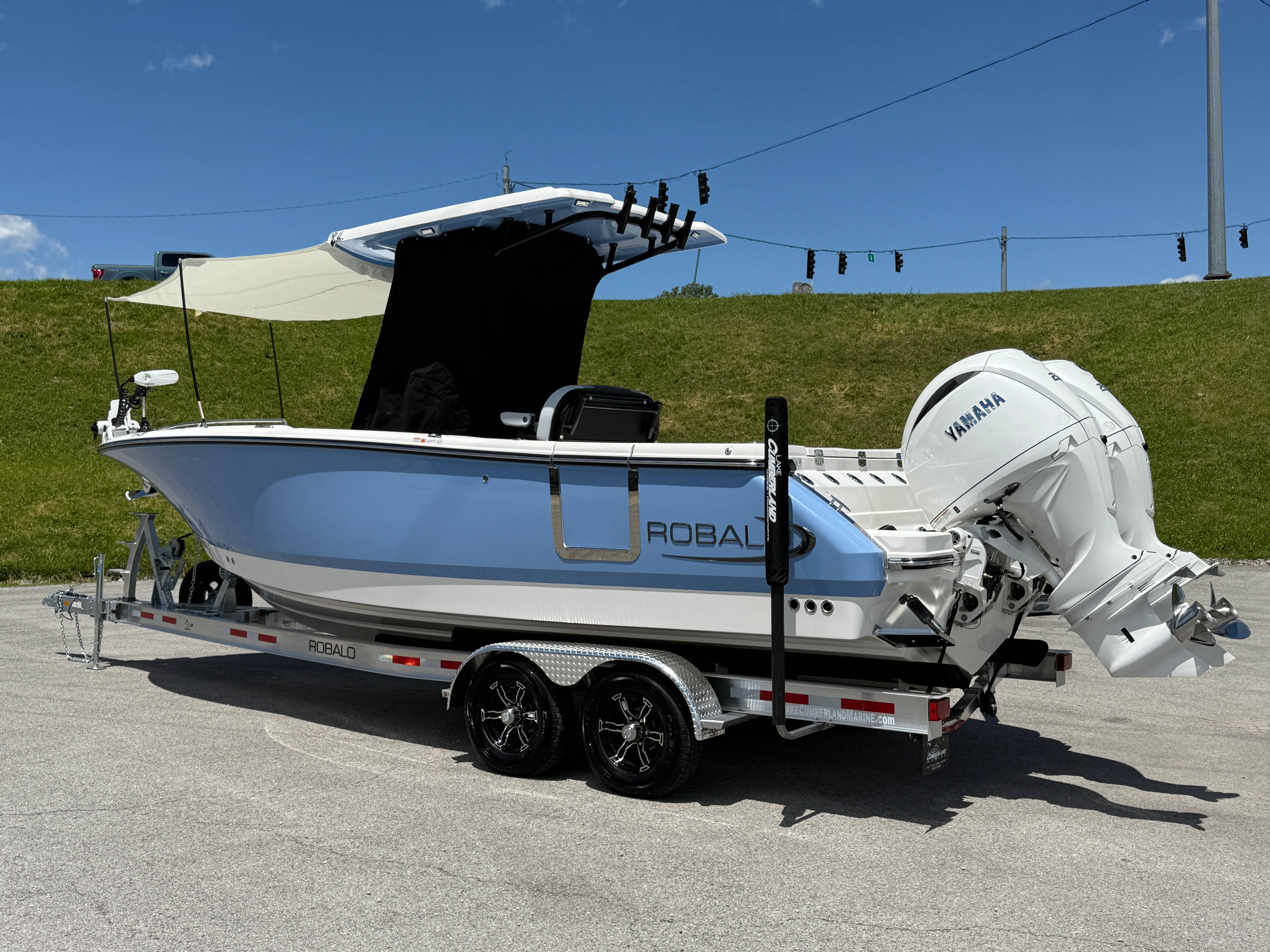 2025 Robalo R250 UNIQUE KEY FEATURES • 20 lb. Galvanized Anchor, 200 Anchor Rope, 15 Chain • 5-Year Premium Level Limited Component Warranty • Cockpit Side Entry Door with Custom SS Frame and Hardware • Digital Gauges • Dual Battery System with Crossover Switch and Voltage Regulating System (VSR) • Fiberglass Hardtop with Powdercoated Frame Includes: Rod Holders, Storage Box, LED Spreader Lights, and Speakers • Freshwater & Raw Water Washdowns/Showers • Full Transom Seat Folds Flush into Transom Wall • In-Floor Storage • Insulated and Overboard Draining Bow Fishboxes • Kevlar Reinforced Hull • Leaning Post Powder Coated with Dual Flip-Up Bolsters, Backrests, Rodholders, and Cooler • Limited Lifetime Hull Warranty • NMMA Certified • Poured Composite Transom Coring • Premium Envision Marine Silicone Upholstery • Transom Livewell • Transom Walkthrough Door • Trim Tabs w/ LED Indicator Lights • Walk-In Head Compartment w/Light & Opening Window • Waterproof Wireless Phone Charging Dock • Wrap Around Cockpit Bolster Padding & Removable Bow Cushions Hull Side Gelcoat - Steel Blue Cockpit Interior - Harbor Mist Hard Top Complete (Black Powder Coated) Hardtop Underside Gel Color - Steel Blue Forward Canvas Fly - White Canvas Leaning Post Cover and Console Cover Twin Simrad NSS12 EVO3S Simrad NMEA 2000 Package with Engine Data and Audio Interface VHF Radio Simrad SS175M Transducer JL Audio Sound System Upgrade Trolling Motor with Triple Bank Charger - Minn Kota Riptide Terrova Quest 36V 115lb Thrust, 87" Gravity Discharge Porcelain Toilet System with 6.5 Gallon Holding Tank and Overboard Discharge Seadek Helm Mat - White Bow Table with Dedicated Storage Bow Filler Cushion Stainless Steel Drink/Rod Holders (2) Leaning Post with Reversible Backrest, 2 Rod Holders and Arm Rest- Black Powder Coated Stainless Steel 20lbs Anchor Stowable Stainless Steel Side Entry Boarding Ladder Windlass Package 5 Year Premium Level Limited Component Warranty Aluminum Tandem Axle Trailer with Aluminum Wheels and Side Guides Spare Tire Kit - Aluminum Wheel