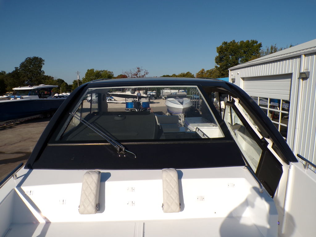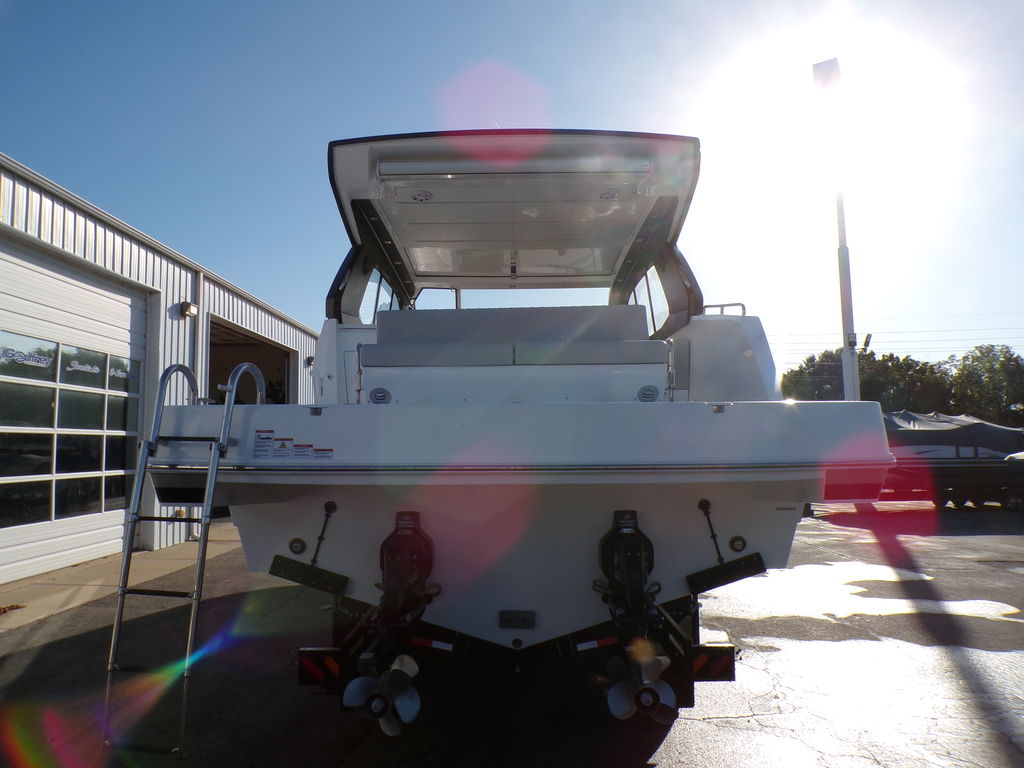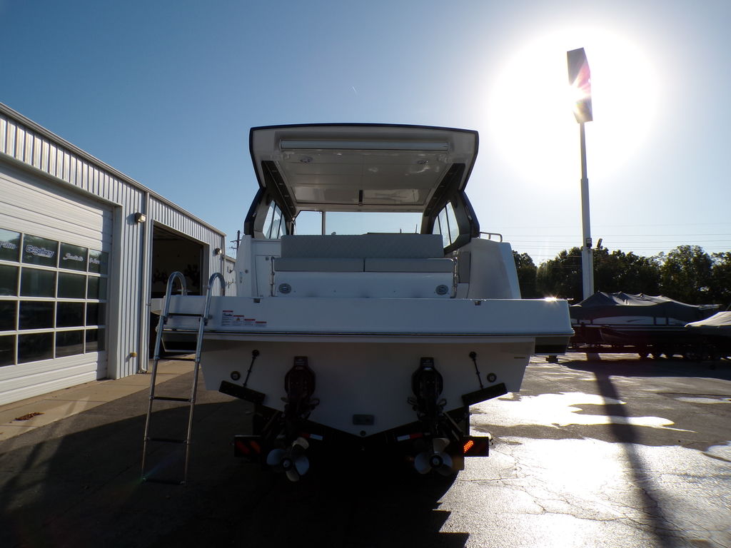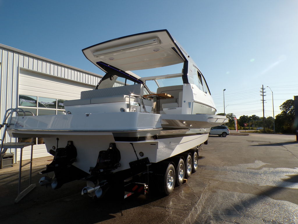 The Schaefer 375 has been redesigned to offer the amenities, sophistication and comfort also found in the larger models. This all-new model is available with either IOs, twin or triple outboards. Flexible deck layouts allow for a gourmet station including a grill at the stern or a sunpad/bench seating. Two balconies are standard on either side, offering more space for relaxing and entertaining. The hard top with its retractable roof offers plenty of sun or protection from the elements. Ample seating throughout the 375 with ease of access to the bow through the windshield walkthrough. The cabin sleeps four with aft and forward berths along with a full head with a separate shower, and a full galley.