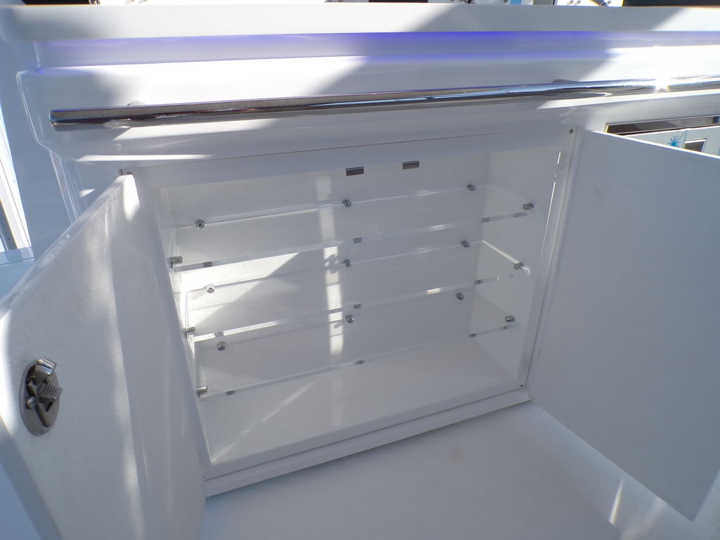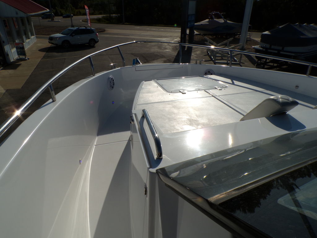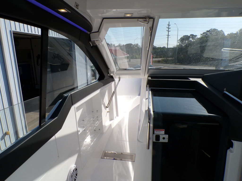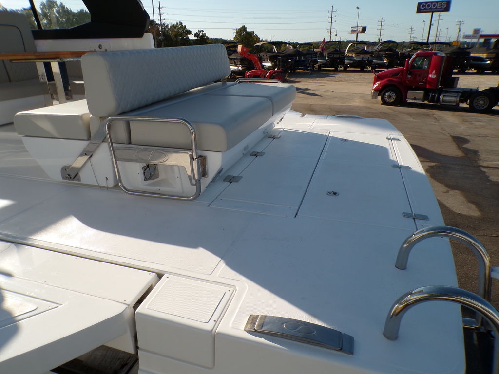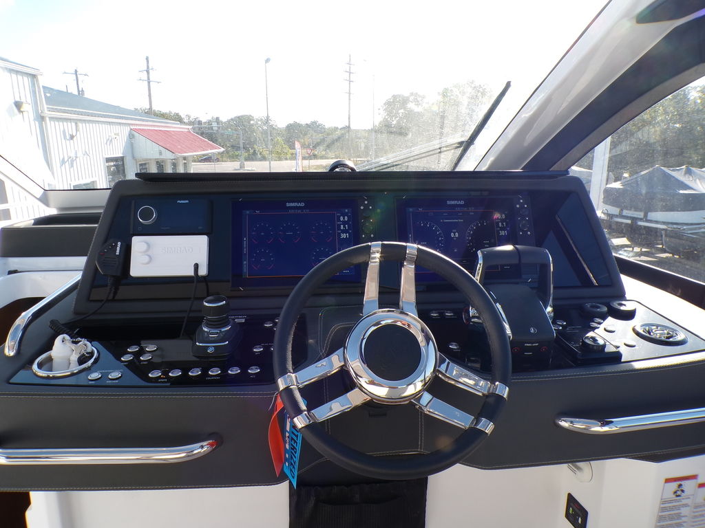 The Schaefer 375 has been redesigned to offer the amenities, sophistication and comfort also found in the larger models. This all-new model is available with either IOs, twin or triple outboards. Flexible deck layouts allow for a gourmet station including a grill at the stern or a sunpad/bench seating. Two balconies are standard on either side, offering more space for relaxing and entertaining. The hard top with its retractable roof offers plenty of sun or protection from the elements. Ample seating throughout the 375 with ease of access to the bow through the windshield walkthrough. The cabin sleeps four with aft and forward berths along with a full head with a separate shower, and a full galley.