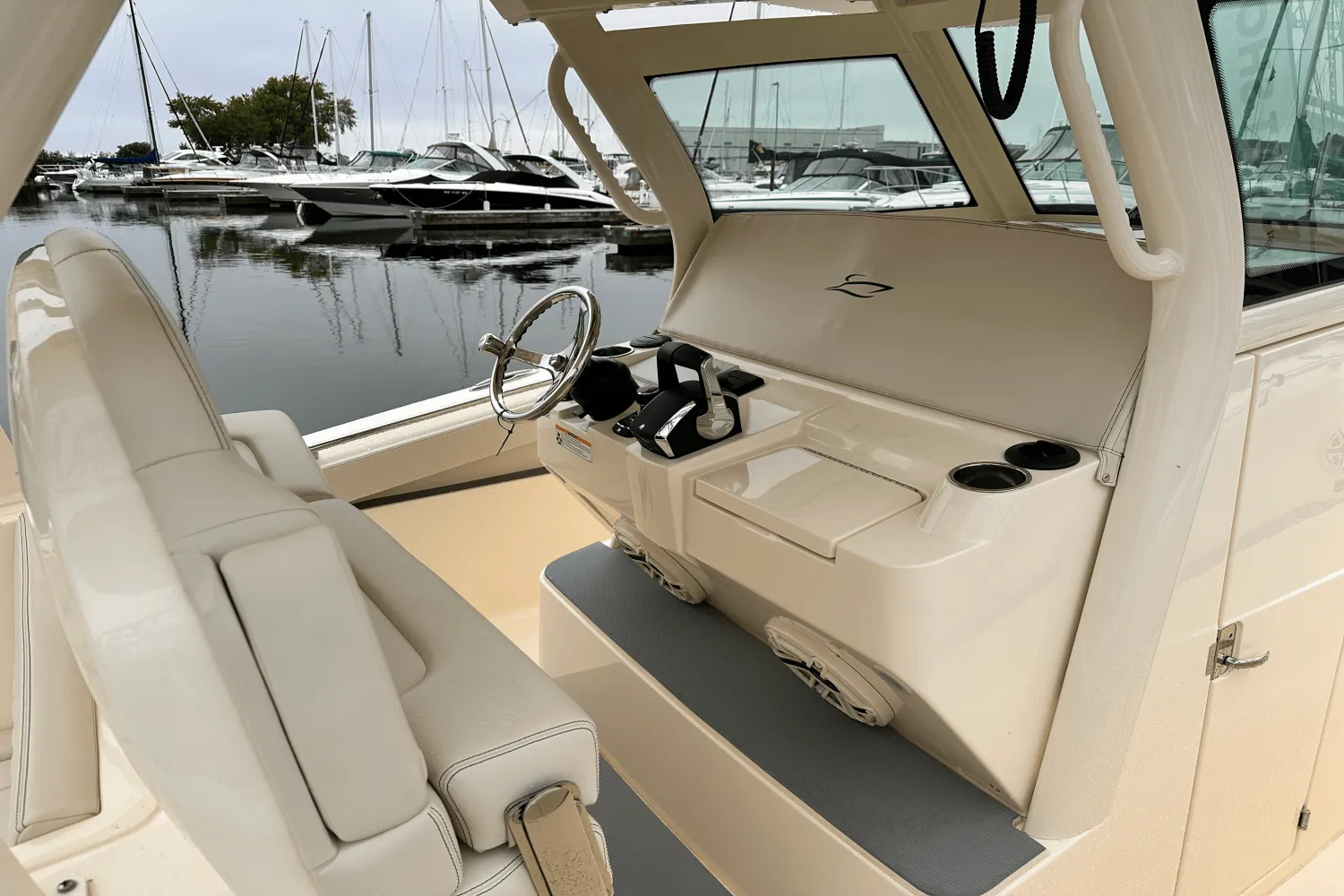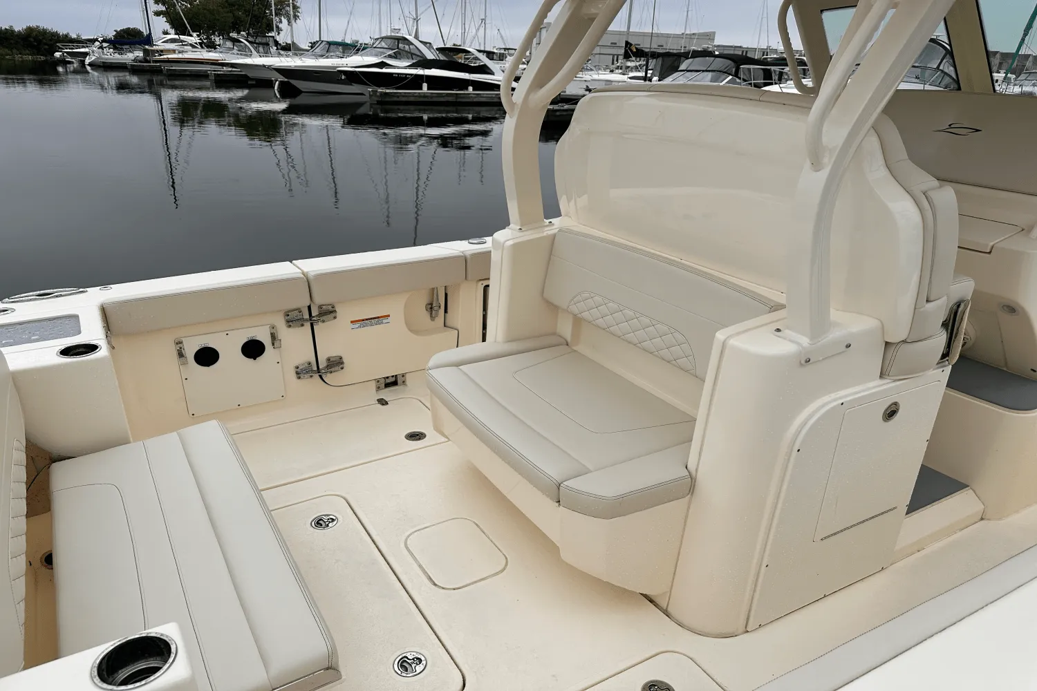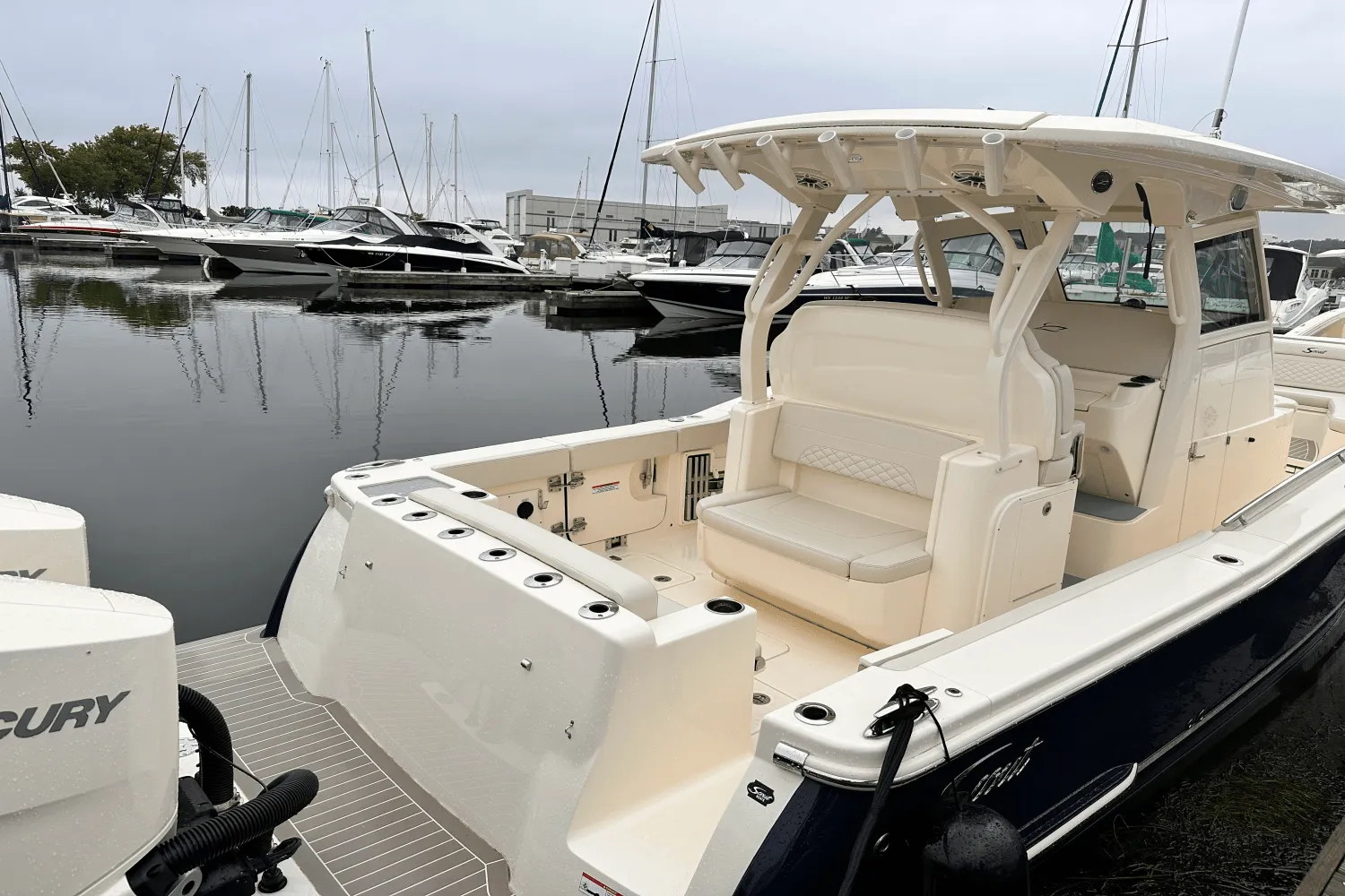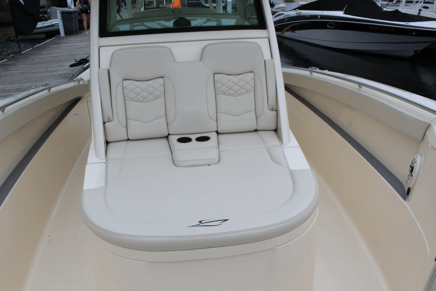 High performance is just one attribute of their incredible 355 LXF model. The deck was designed to accommodate an optional Seakeeper 3DC gryo stabilizer just under the aft facing bench seat, and for protection from the elements, just engage the optional fiberglass cockpit sun shade. Other notable innovations of this models include standard independent heated seats at the helm, a standard integrated forward-facing anchor camera in the bow allowing you to see what's going on in front of you via the helm touch screen displays, and solar panels that provide a trickle charge to AGM batteries when the Seakeeper 3 DC is ordered for a longer battery life. And that's just above deck. Just wait until you step down into the cabin and find all the luxurious appointment, headroom and attention to details this beauty provides.