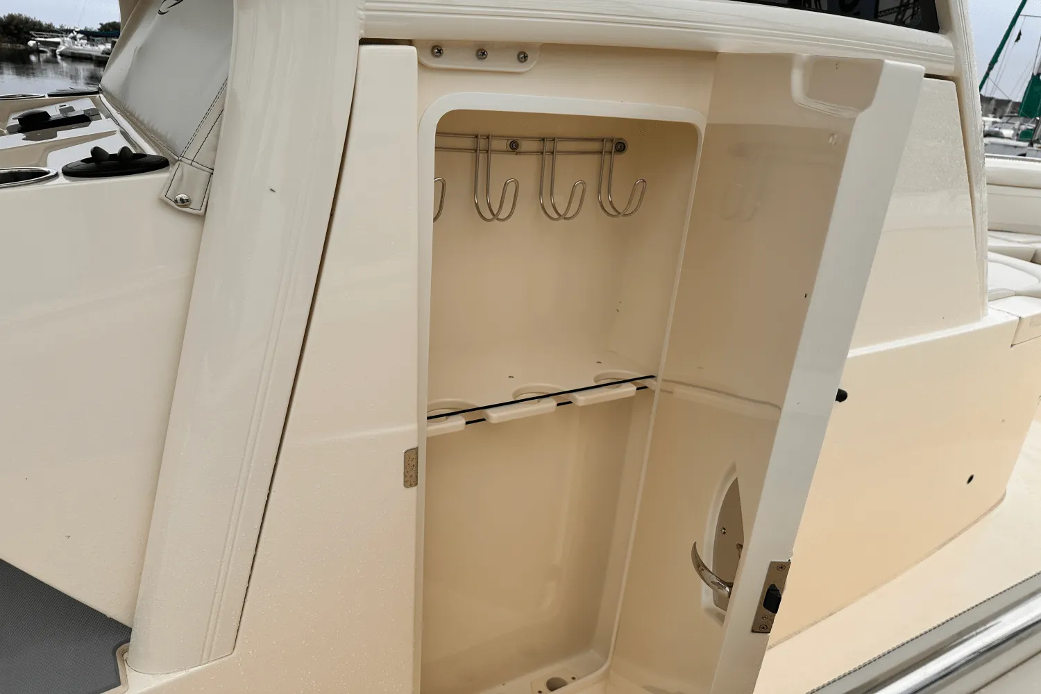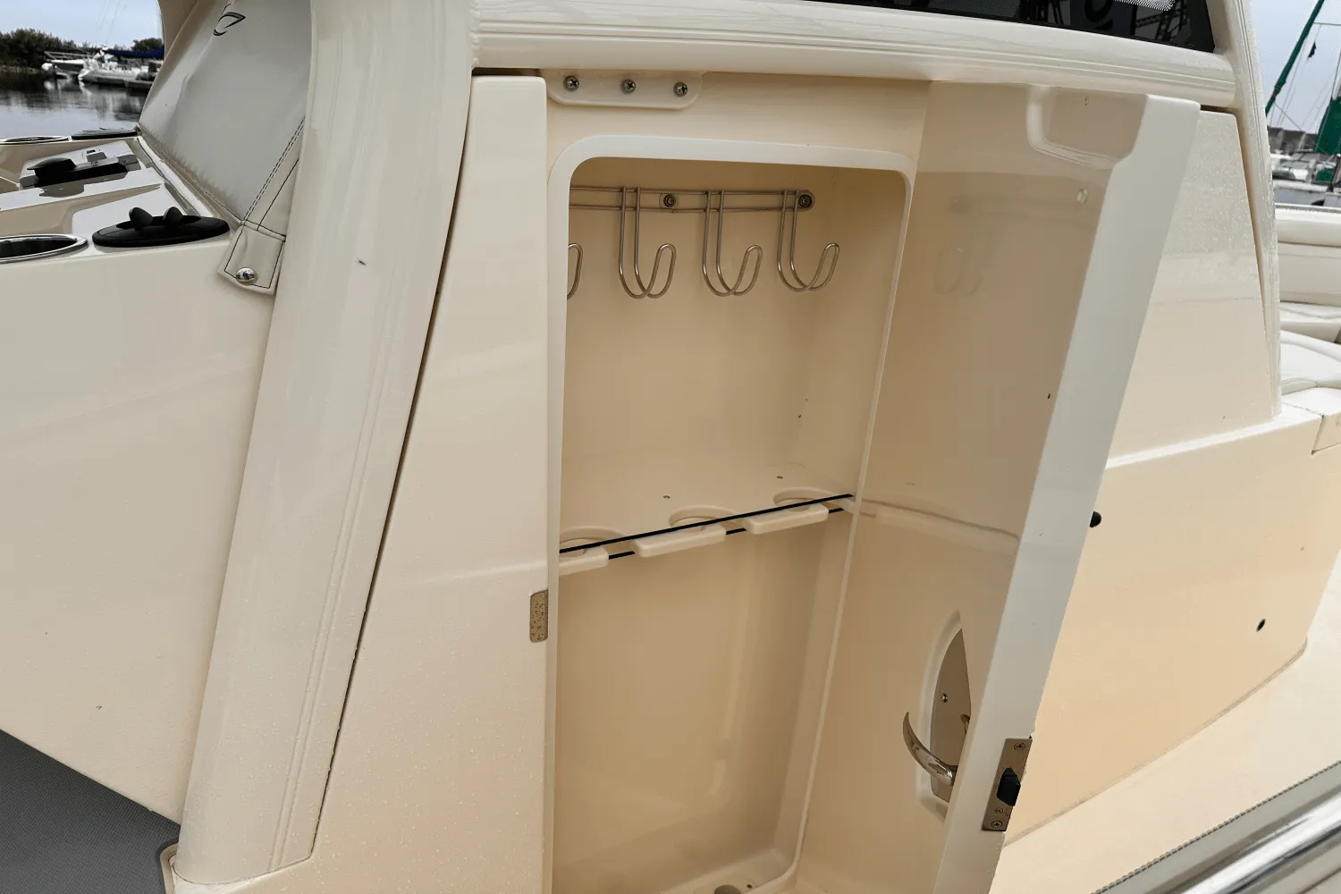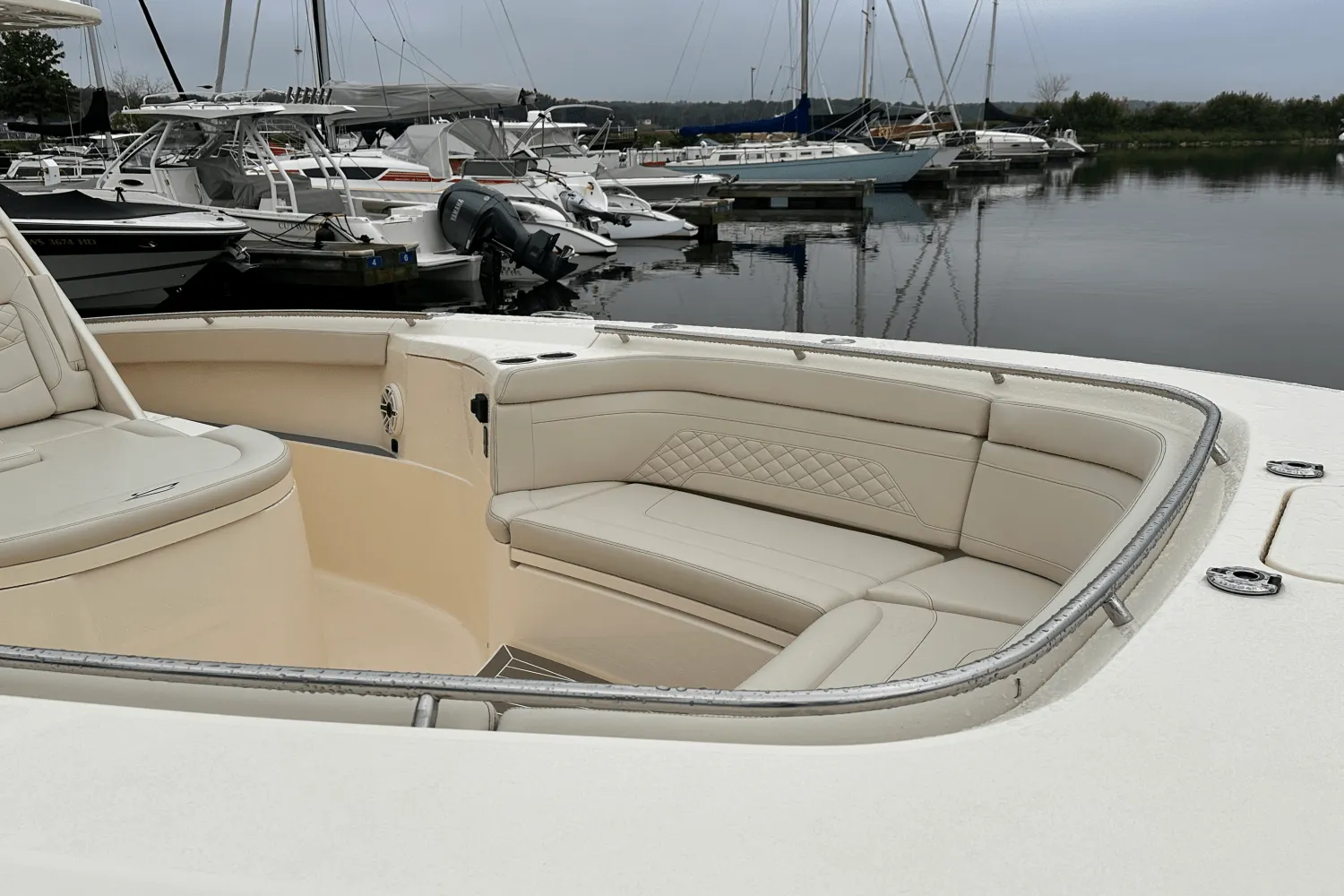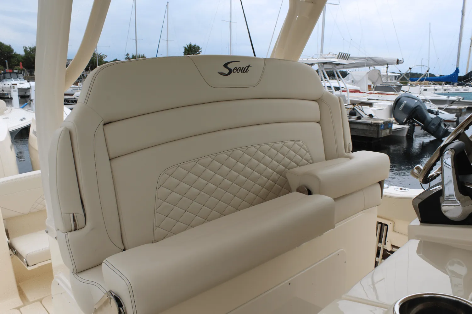 High performance is just one attribute of their incredible 355 LXF model. The deck was designed to accommodate an optional Seakeeper 3DC gryo stabilizer just under the aft facing bench seat, and for protection from the elements, just engage the optional fiberglass cockpit sun shade. Other notable innovations of this models include standard independent heated seats at the helm, a standard integrated forward-facing anchor camera in the bow allowing you to see what's going on in front of you via the helm touch screen displays, and solar panels that provide a trickle charge to AGM batteries when the Seakeeper 3 DC is ordered for a longer battery life. And that's just above deck. Just wait until you step down into the cabin and find all the luxurious appointment, headroom and attention to details this beauty provides.