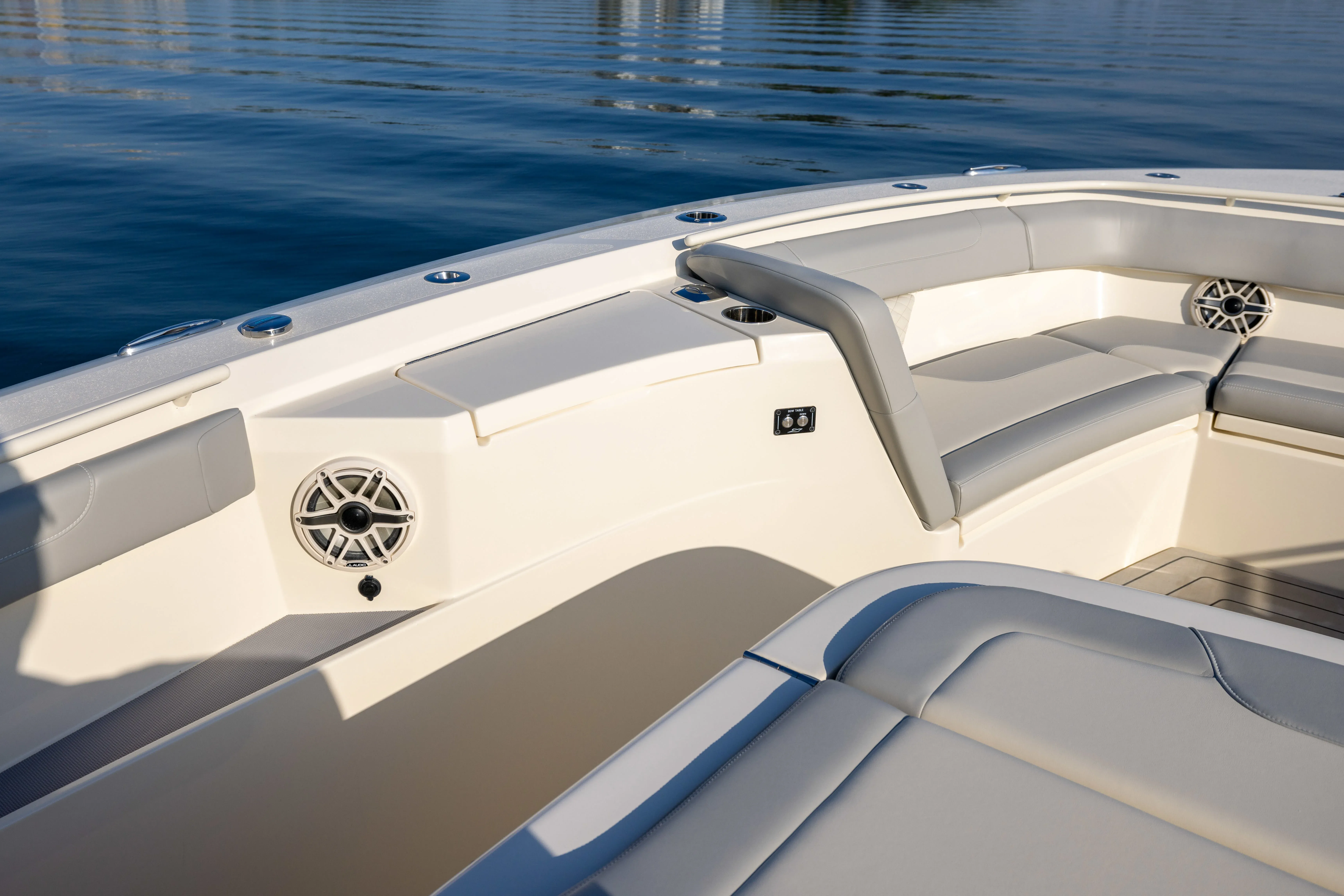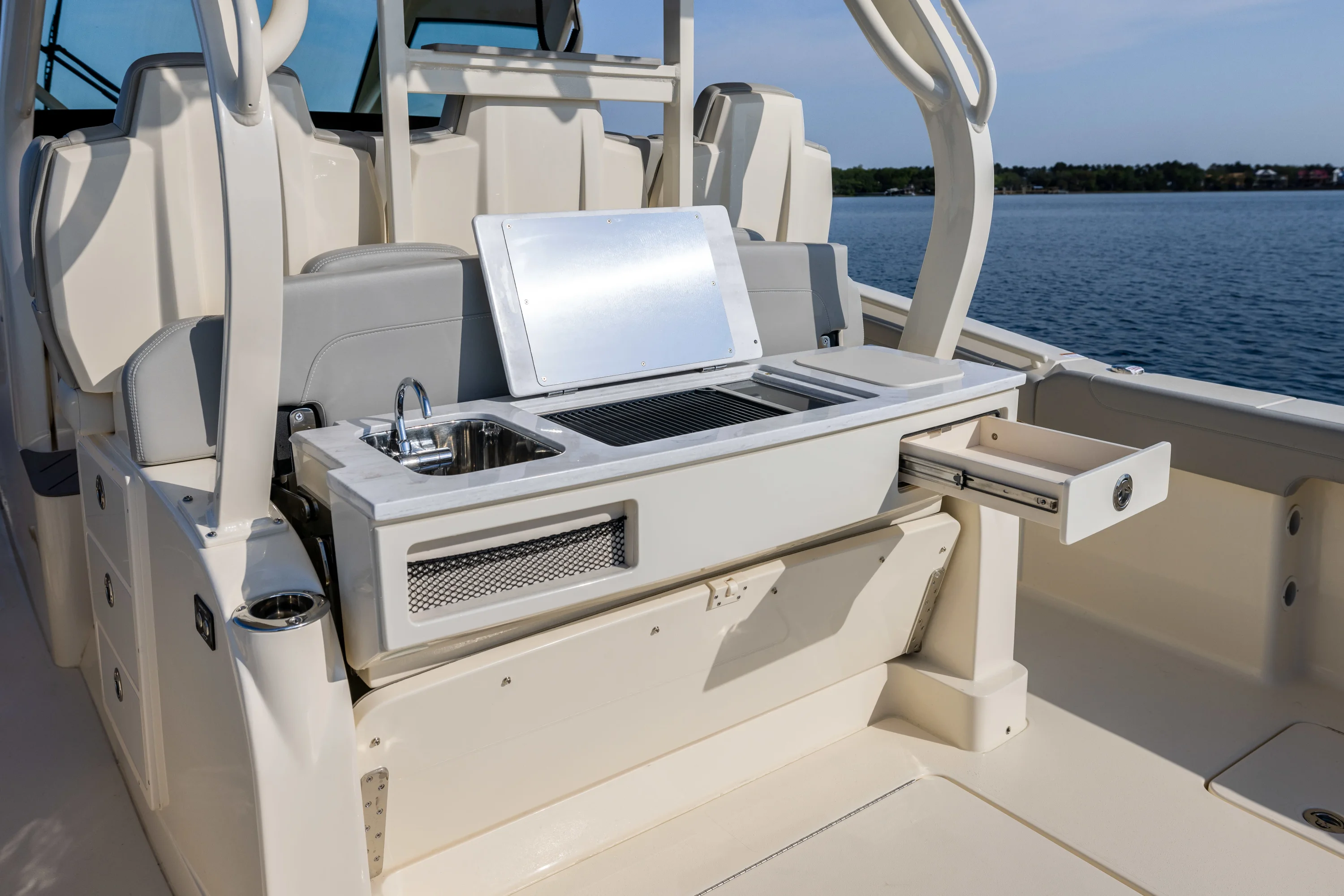 The revolutionary 400 LXF, a true masterpiece of innovation in the world of boating. This stunning model combines exceptional technology, unmatched performance, and luxurious styling in perfect harmony. From the moment you step on board, you will be amazed by the abundance of standard features, including the advanced SeaKeeper Gyro Stabilizer that ensures a smooth and comfortable ride. But what truly sets the 400 LXF apart are the award-winning options available. Prepare to be astonished by the electronically-actuated articulating rocket launchers, a true marvel of engineering. And if that's not enough, the convertible leaning post with a Kenyon grill, sink, and cutting board will take your on-water culinary experiences to new heights. Adding to its allure is the hydraulic port side beach platform, featuring synthetic teak that enhances the boat's aesthetics while providing a perfect spot for relaxing and lounging. Crafted with meticulous attention to detail, the 400 LXF boasts cutting-edge Carbon Epoxy Construction. This advanced technology, combining carbon fiber and E-glass in the epoxy infusion process, ensures a lightweight yet incredibly strong structure. Complementing this is the innovative Scout Stepped Hull Technology, delivering unmatched performance on the water. Step into the world of luxury with the 400 LXF – the pinnacle of our line-up, the epitome of elegance. Elevate your boating experience with the S-Class, where superior design, opulent appointments, and state-of-the-art technologies come together seamlessly. Experience the finest that boating has to offer with the 400 LXF – a true class leader.