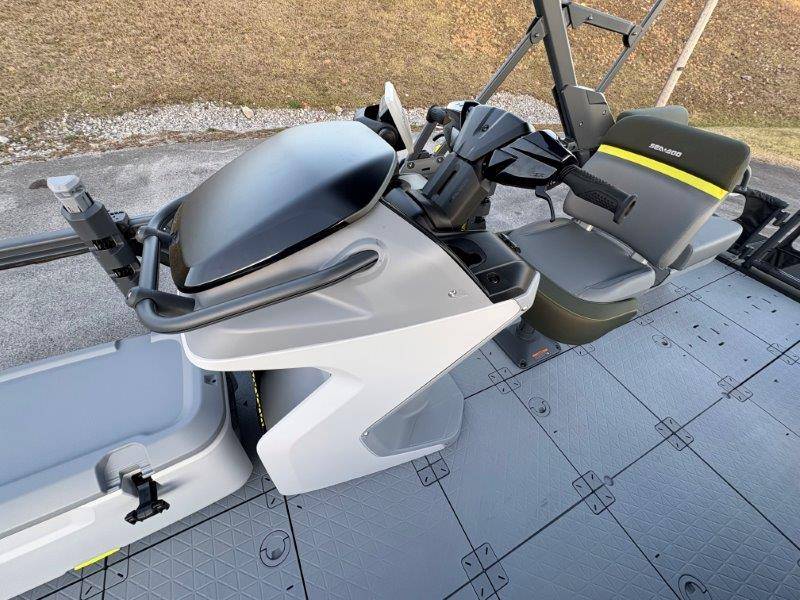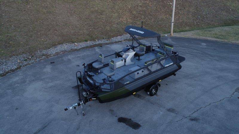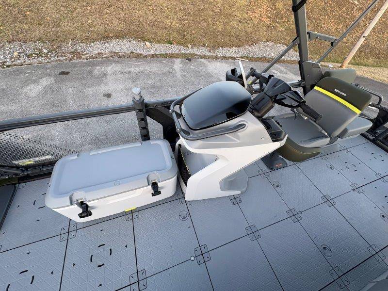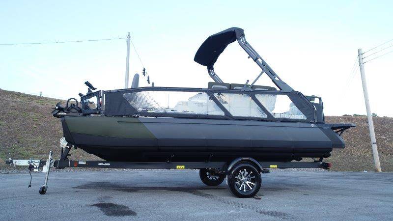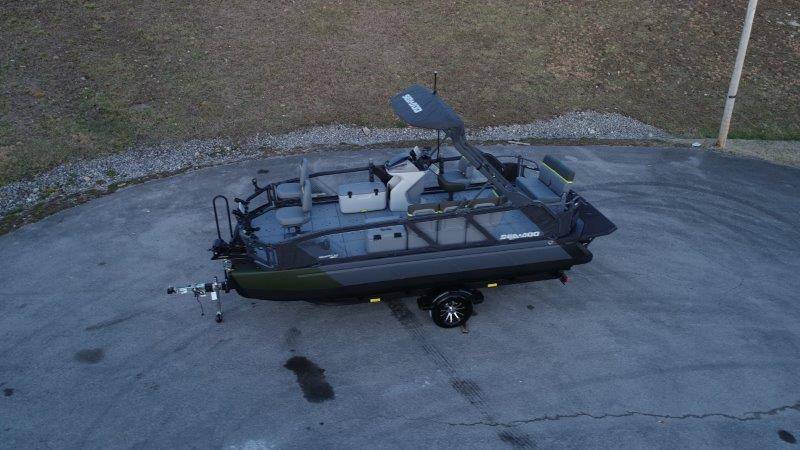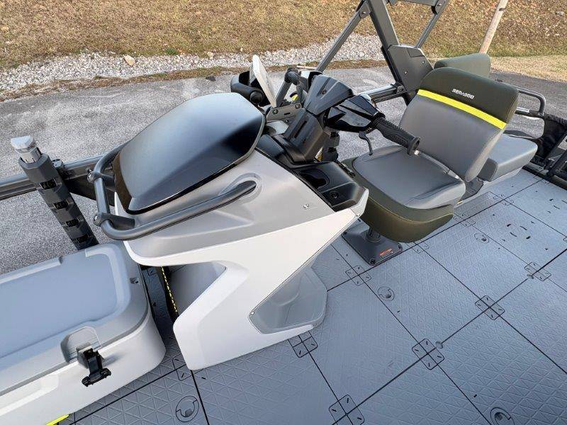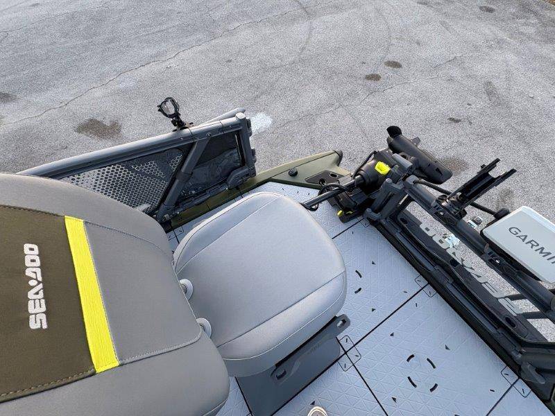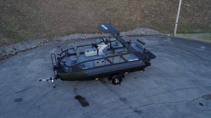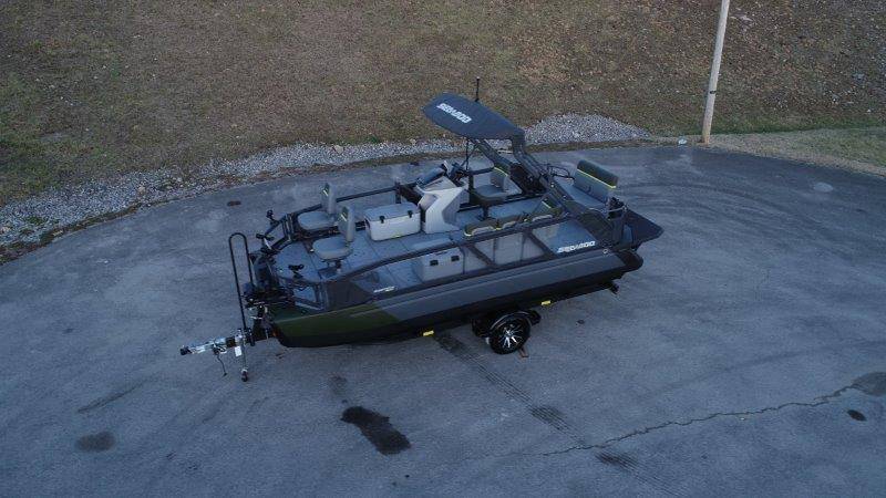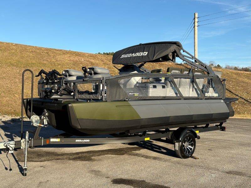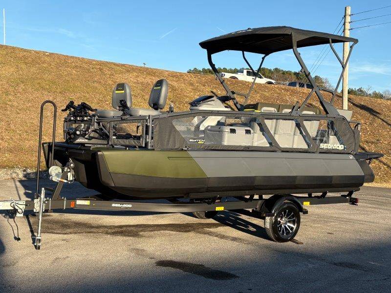 ETA MAY/JUN 2025 Sea-Doo Switch Fish 18' 230HP (Painted Trailer) Sneaky strength Power for the long haul A powerful Garmin Force Kraken trolling motor, yet it’s quiet as a mouse while you're fishing. Its robust battery system doesn’t just provide power, it provides long-lasting power (no need to remove the batteries for charging!). Autopilot features and brilliant UHD sonar makes steering your pontoon and finding the best fishing spots a breeze. Plus, it's suitable for both salt and fresh water. Your fishing throne Best seat in the house Adjust, rotate, attach. The fishing pedestal seats spins 360 degrees, adjusts up and down and moves easily around the boat, quickly attaching and detaching of the quick-attach tiles and pairing up with your LinQ Lite accessories for a top-notch fishing experience. Stayin’ alive Live well, fish better A cooler that doubles as a livewell using an integrated pump to constantly feed water into the reservoir to keep your catch and bait alive. It’s easily and securely installed onto the pontoon using quick-attach tiles. Pro tip: Use the top of the lid to measure your catch! Open New Doors Easy onboarding experience within the rear and bow corner doors With two corner doors at the back of the pontoon, hopping on and off for a swim is effortless. For fishing, use the bow corner doors for easy catch-and-release or to quickly rinse your hands. That makes four corner doors! Tools of the trade Your rod at a moment's notice Store up to four fishing rods safely and easily on board the pontoon with quick-access rod storage. Lock them up when you leave the boat so when it’s time to cast a line, you’ll find them exactly where you left them. Rearrange the ride Power that’s ready when you are Fishing to family and back in the snap of a finger. Deploy the trolling motor at a moment’s notice, then securely store it along with the remote, control pedal and more fishing gear. The top of the storage box doubles as a side table. Reliable Rotax Big boat, outsized fun Every Switch Fish comes with proven, reliable power thanks to a Rotax 1630 ACE engine. The jet propulsion system offers an outsized fun factor with an unprecedented level of maneuverability for a pontoon boat. Fish from anywhere Multiple screens, plenty of fish Fish at the front or fish at the back. With two Garmin fish finders on board — one at the console, one at the bow — you can see what you want wherever you are. The screens wirelessly connect to one another allowing both screens to read both in-hull and trolling motor transducers signals. Captain Comfortably Pick your perfect position A tilting handlebar allows each captain to find their favorite riding posture and adjust on the fly, making an already agile pontoon even more comfortable for drivers while maneuvering tight spaces and docking. Softer Landing Comfort in, comfort out More comfort, everywhere. The new Swim Platform Carpet provides a cushier landing for climbing back in and a softer seat for lounging with your feet in the water.