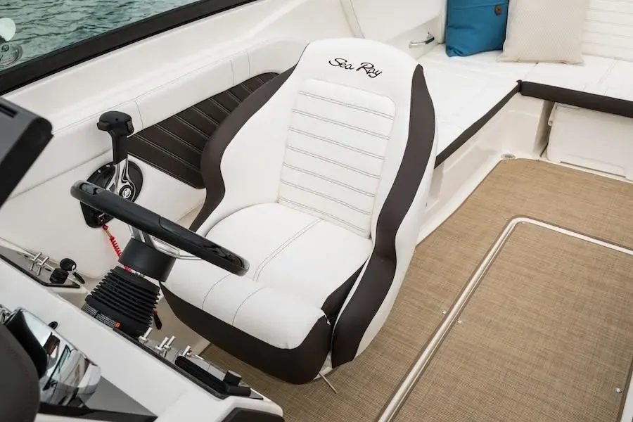 Sink into the plush and lavish upholstery found throughout the boat, showcasing top-notch materials and attention to detail. The ergonomic helm station grants easy access to all controls, while the expansive swim platform at the rear beckons you to relax and enjoy a refreshing swim in the clear waters.