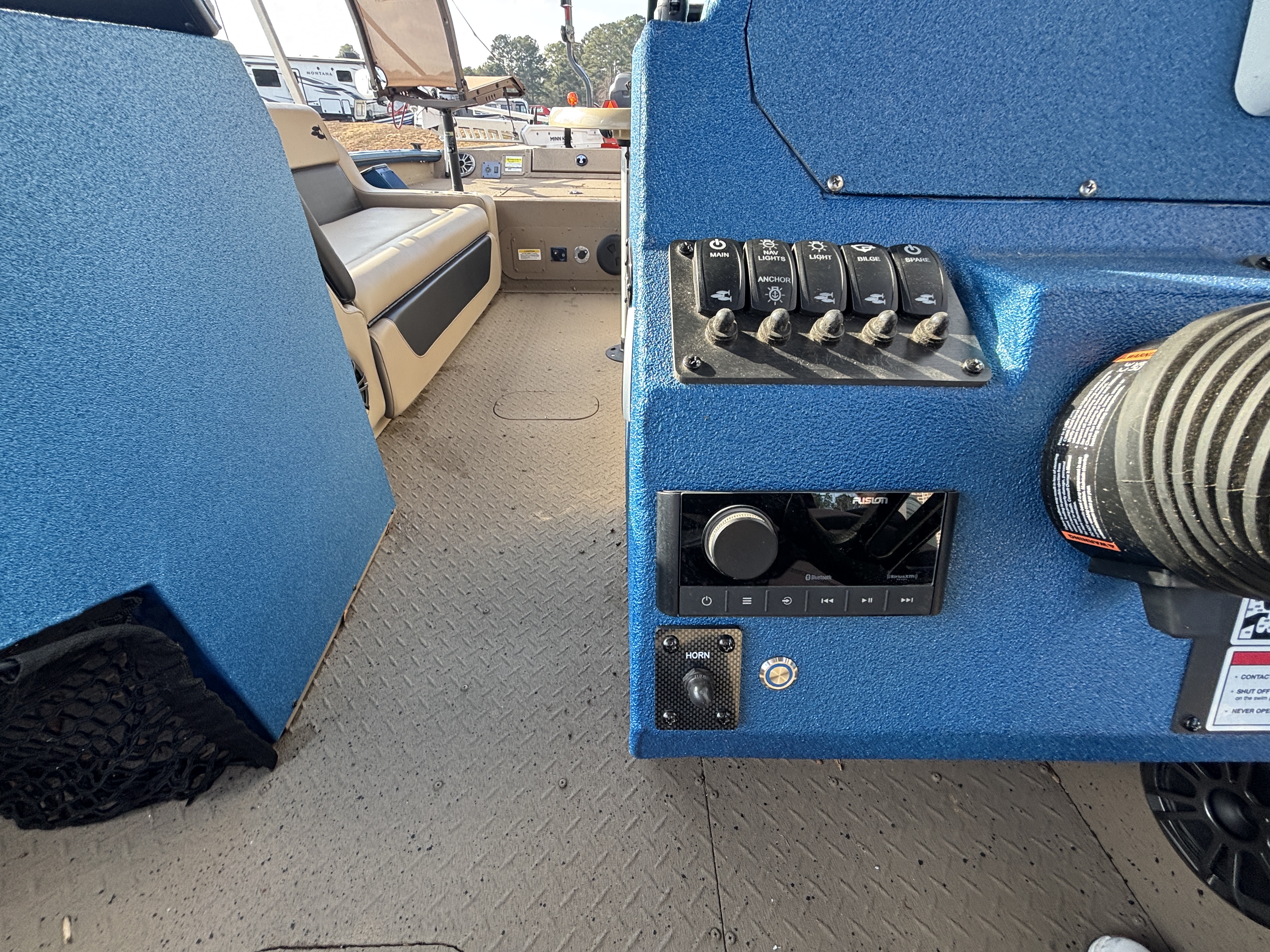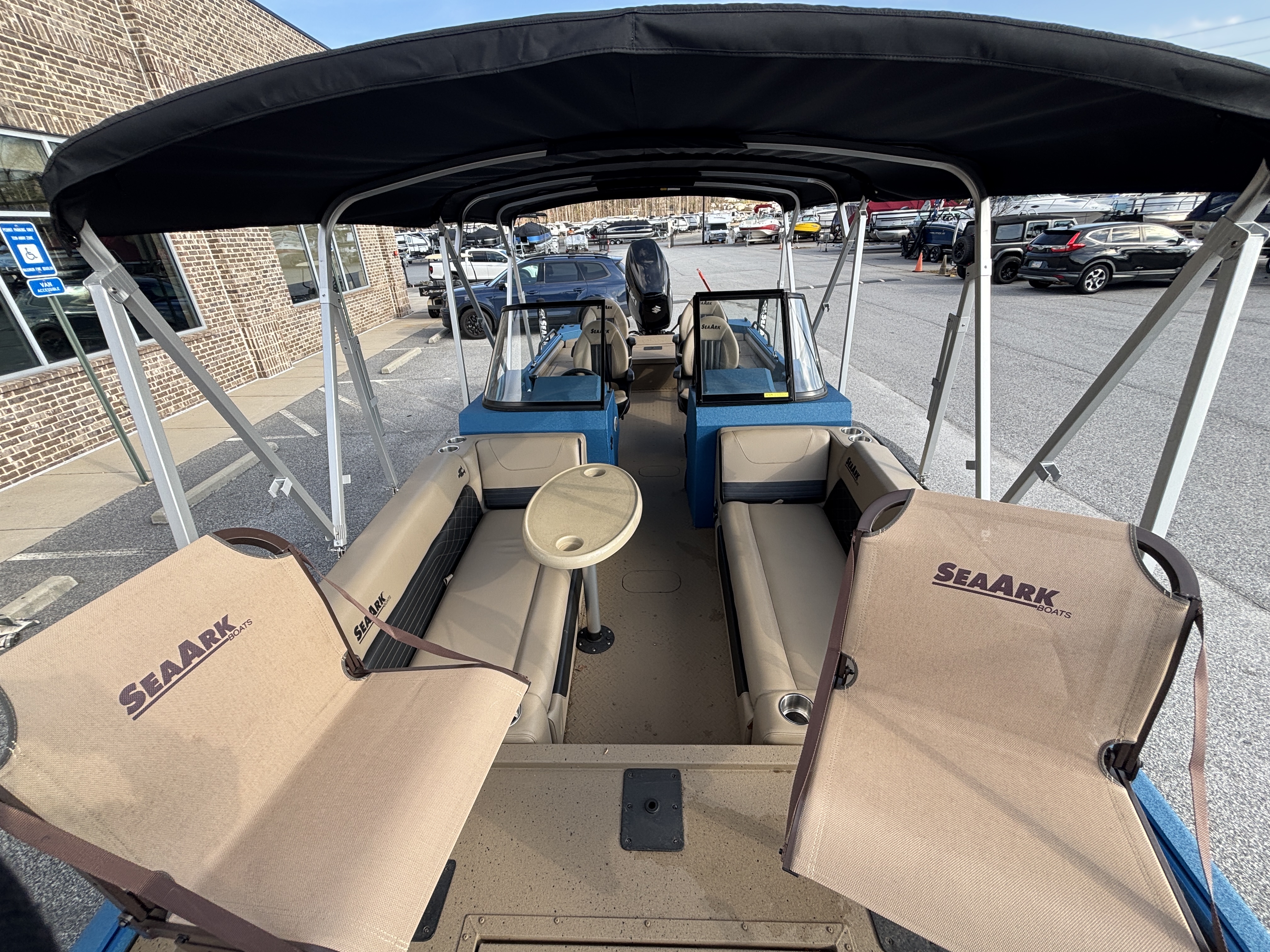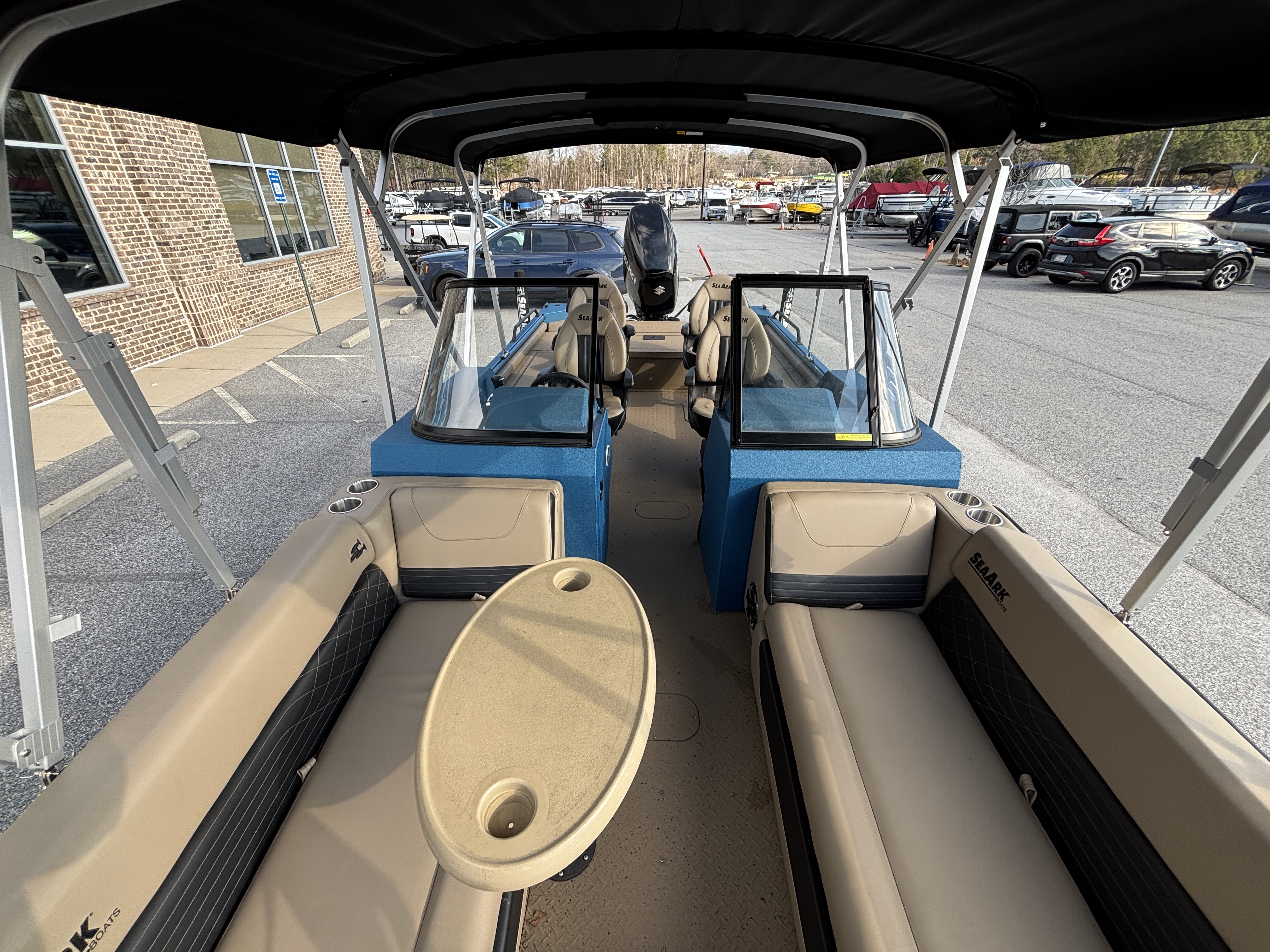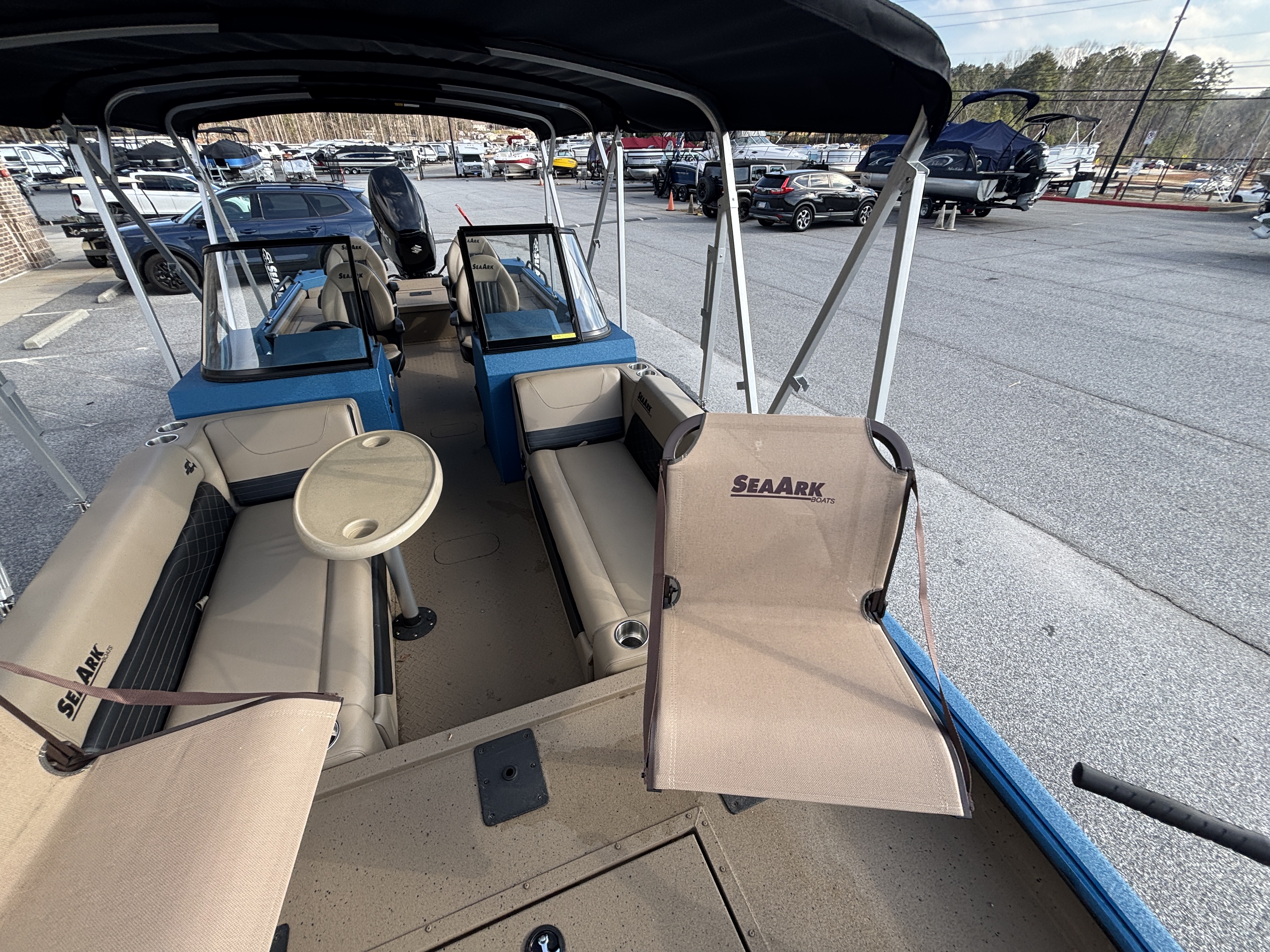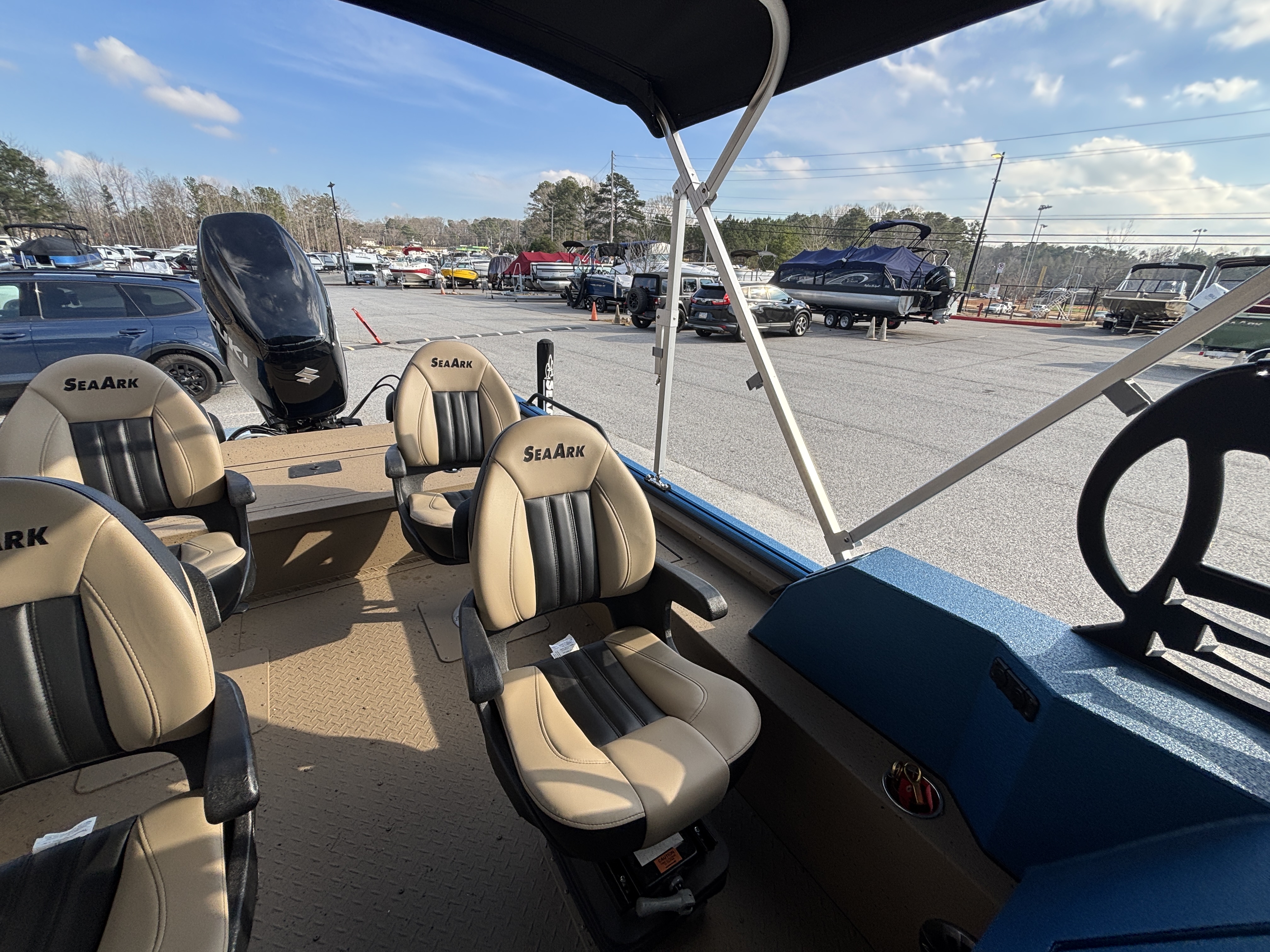 Color Scheme - Dynamic Blue & Tan w/Tan Seating and Interior Splatter Pattern w/ Black Bimini Top