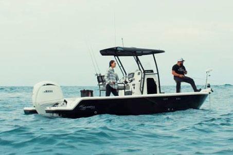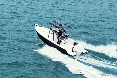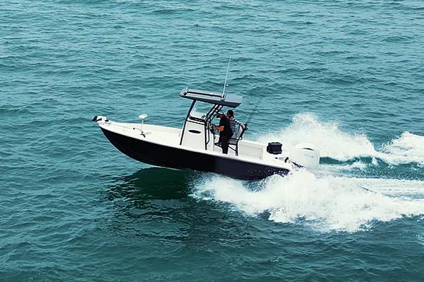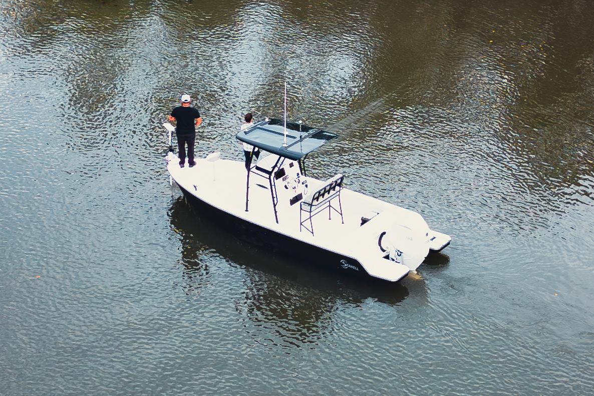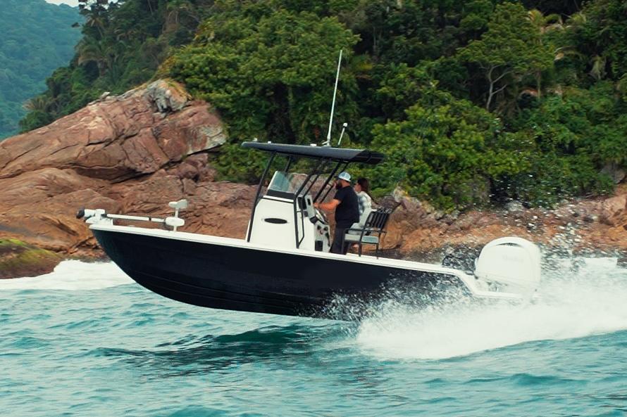 Sandwich-core fibreglass/PVC hull • Beam 8 ft 2 in • Draft 1 ft 3 in • Deadrise 17° • Dry wt 1 830 lb • Fuel 72 gal • Water 13 gal • Headroom 5 ft 7 in • Capacity 6 • Self-draining deck & storage lockers • Fibreglass hardtop with 4 rod holders • Central console w/ acrylic windshield, head compartment, cup holders & rod-holder storage • Stern livewell (19 gal) • Electric toilet • Three bilge pumps (1 100–1 500 gph) • Hydraulic steering • Stainless-steel hardware throughout • Six deck cleats