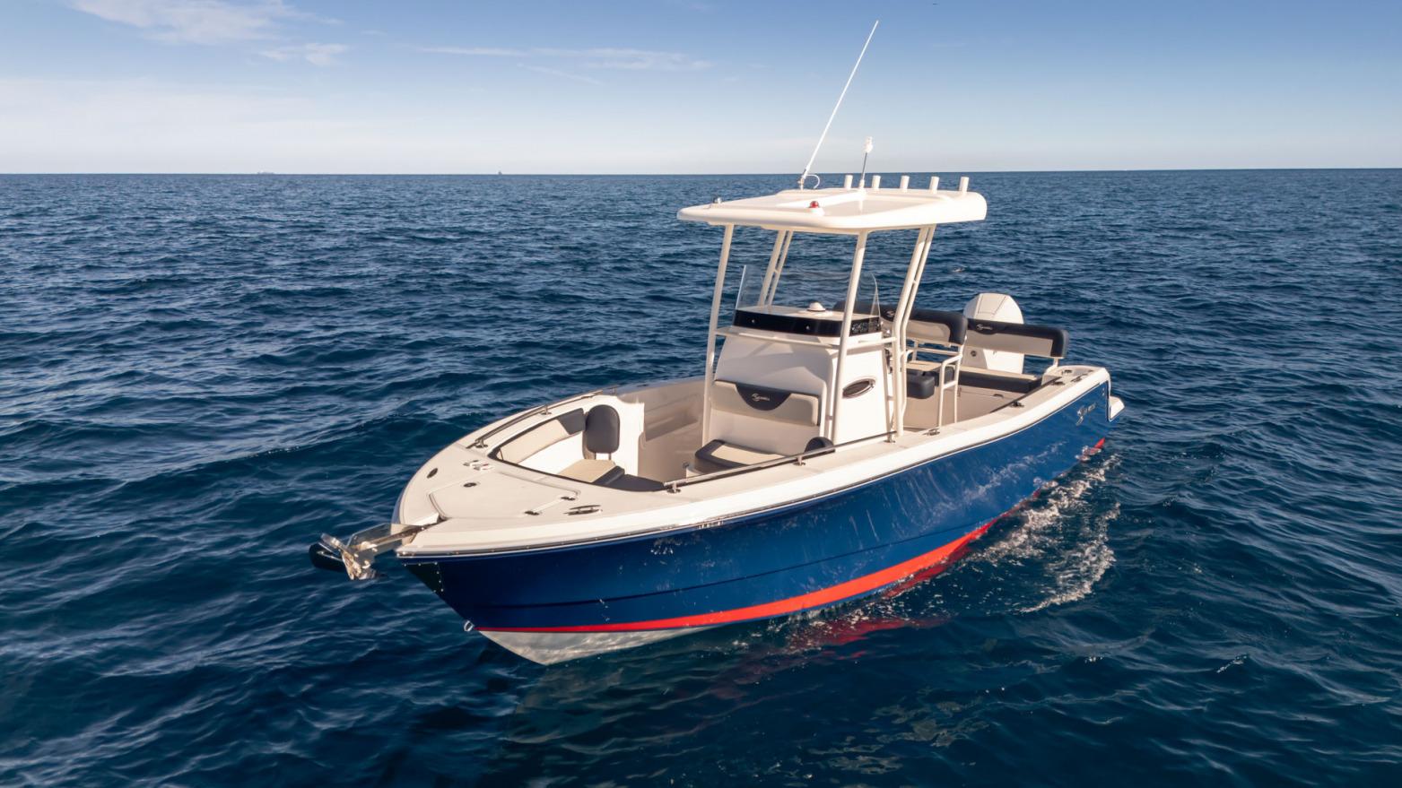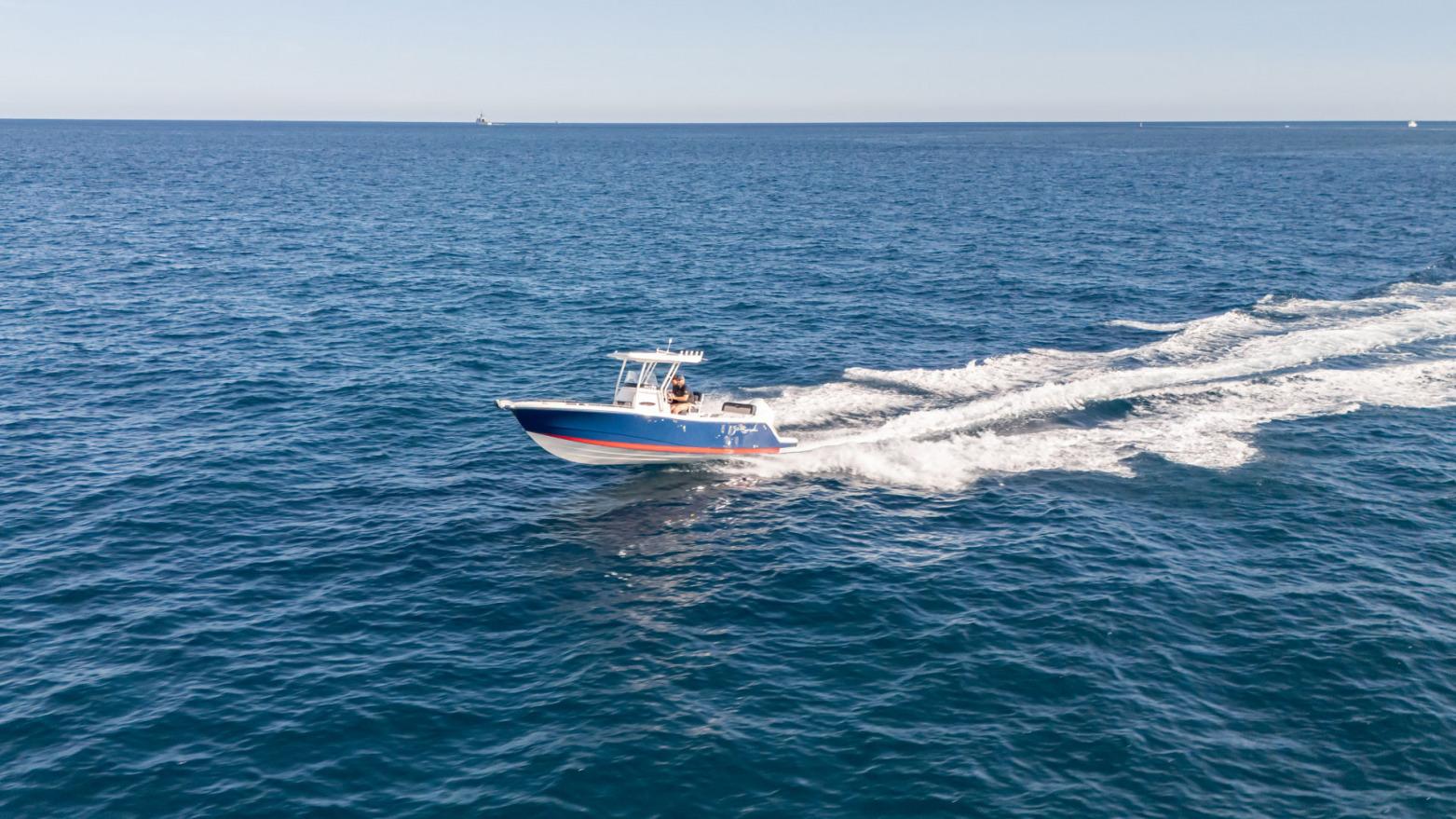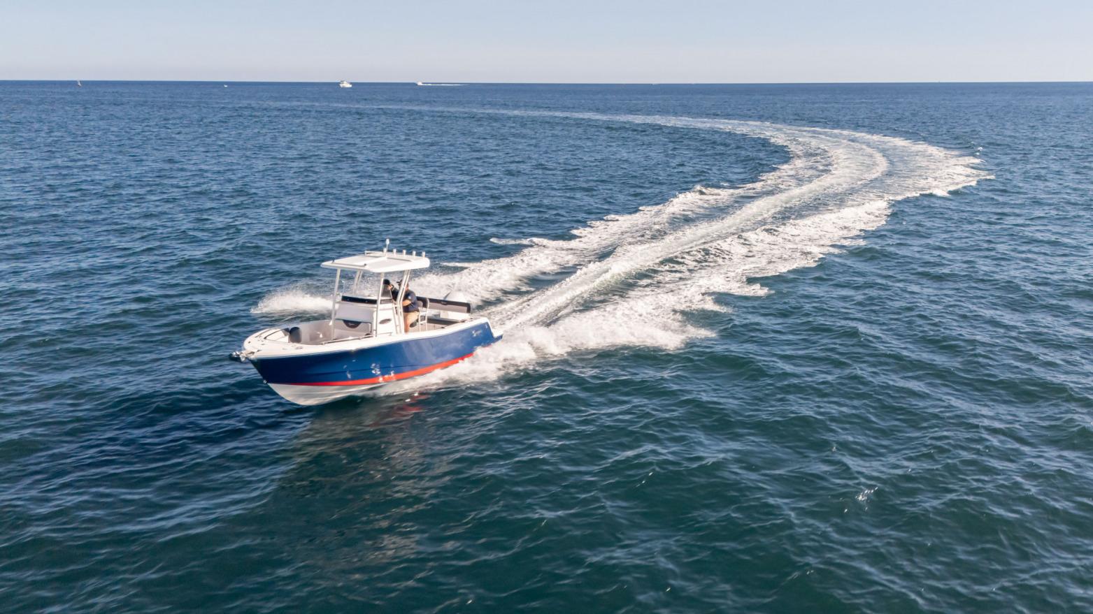 Sandwich fiberglass/PVC-foam hull • Beam 8′6″ • Draft 1′3″ • Dry wt 2,050 lb • Fuel 72 gal • Water 16 gal • Headroom 5′7″ • Deadrise 17° • Capacity 8 • Range up to 204 nmi at 25 kn • Self-draining deck • Integrated head compartment • Stern livewell • Three bilge pumps • Fiberglass hardtop with 4 rod holders • Stainless cleats, grab rails & ladder