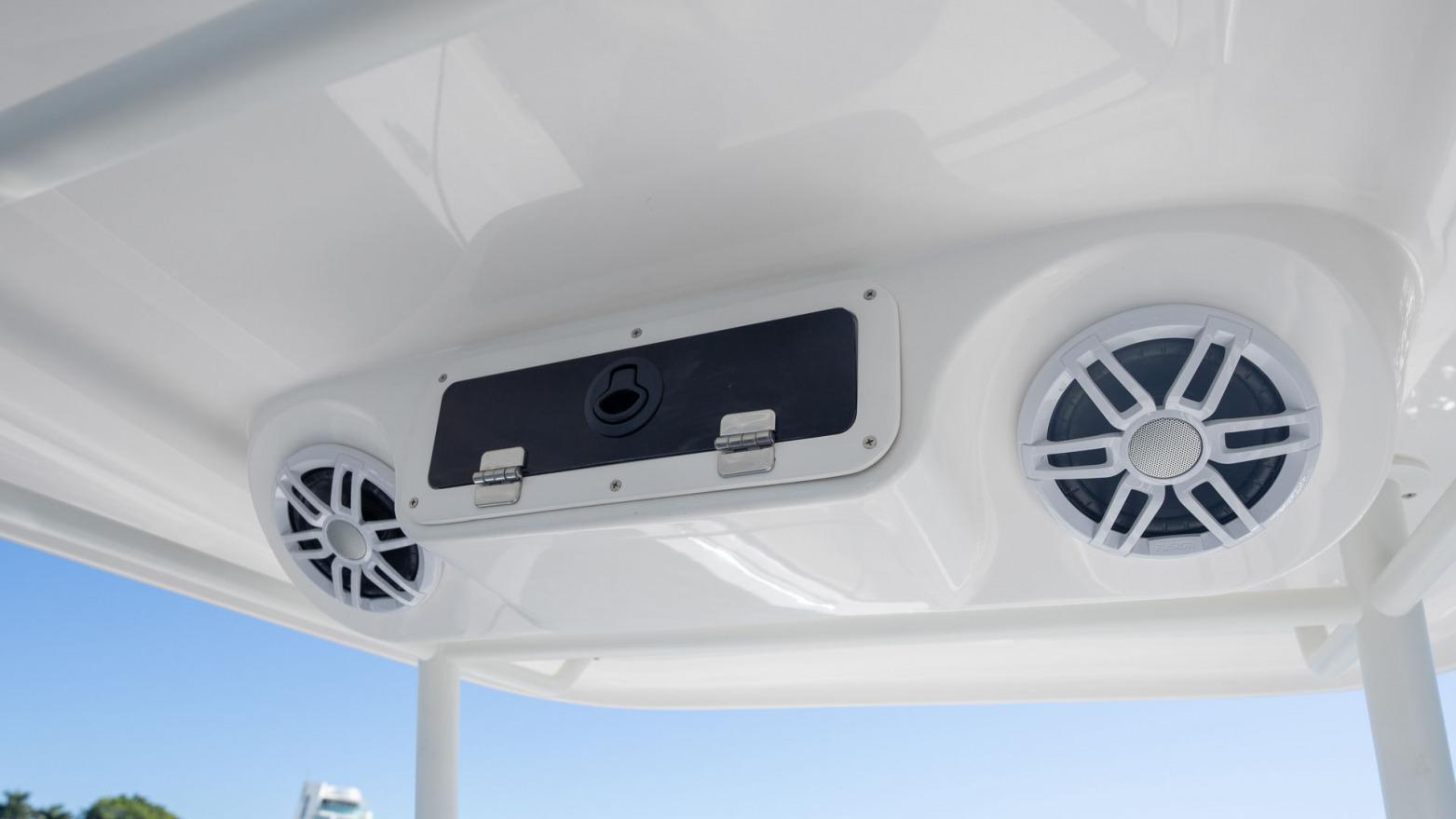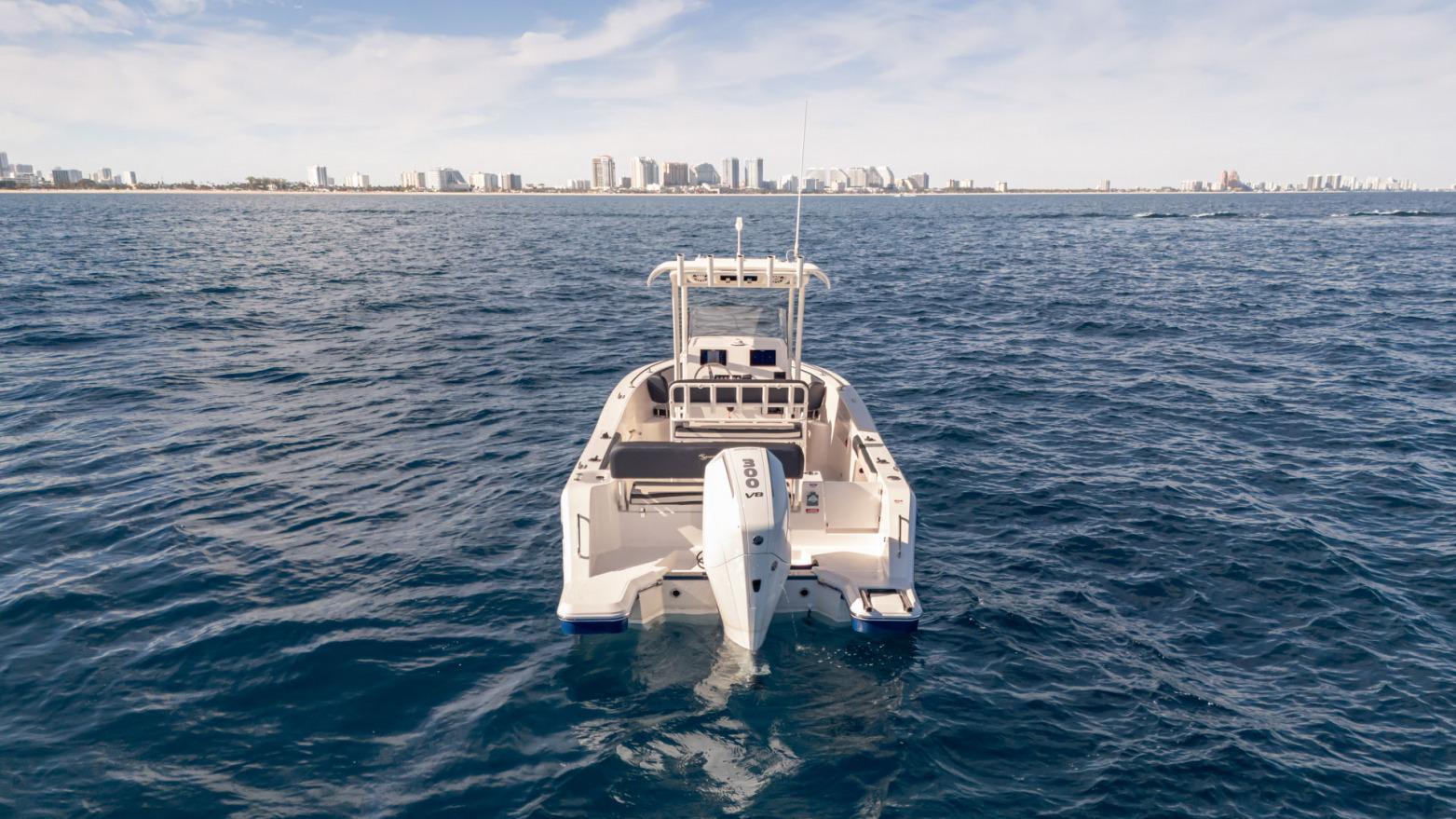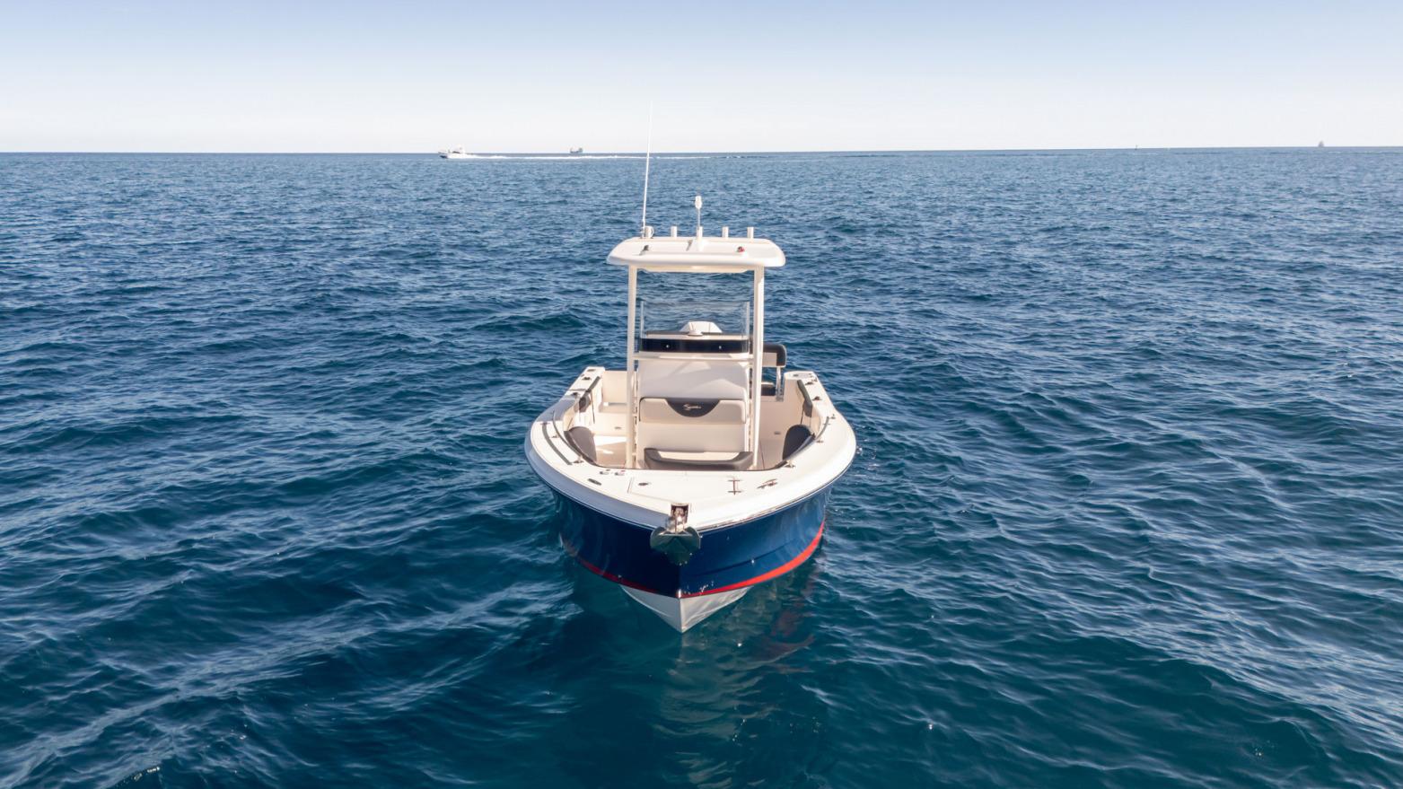 Sandwich fiberglass/PVC-foam hull • Beam 8′6″ • Draft 1′3″ • Dry wt 2,050 lb • Fuel 72 gal • Water 16 gal • Headroom 5′7″ • Deadrise 17° • Capacity 8 • Range up to 204 nmi at 25 kn • Self-draining deck • Integrated head compartment • Stern livewell • Three bilge pumps • Fiberglass hardtop with 4 rod holders • Stainless cleats, grab rails & ladder