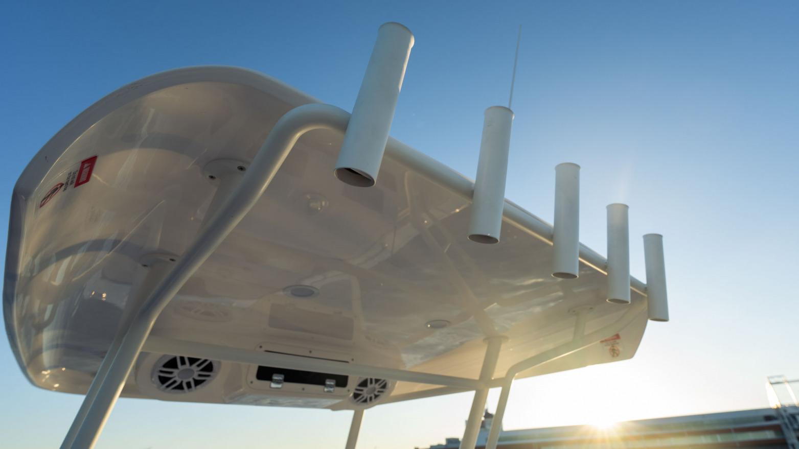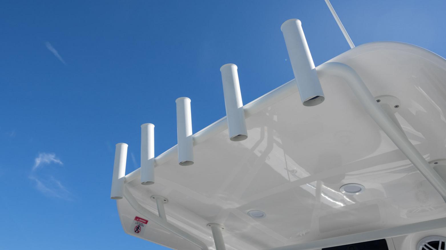 Leaning post with rod holders • Hydraulic steering & trim tabs • Cup holders • Fender storage • USCG safety kit