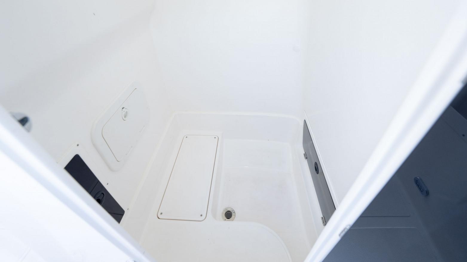 Deck space centers on versatility: a full walk-around layout, ample storage lockers and a stern livewell keep gear organized and fish fresh. The center console hides a compact head for quick stops, and the fiberglass hardtop with built-in rod holders keeps you shaded during long days.