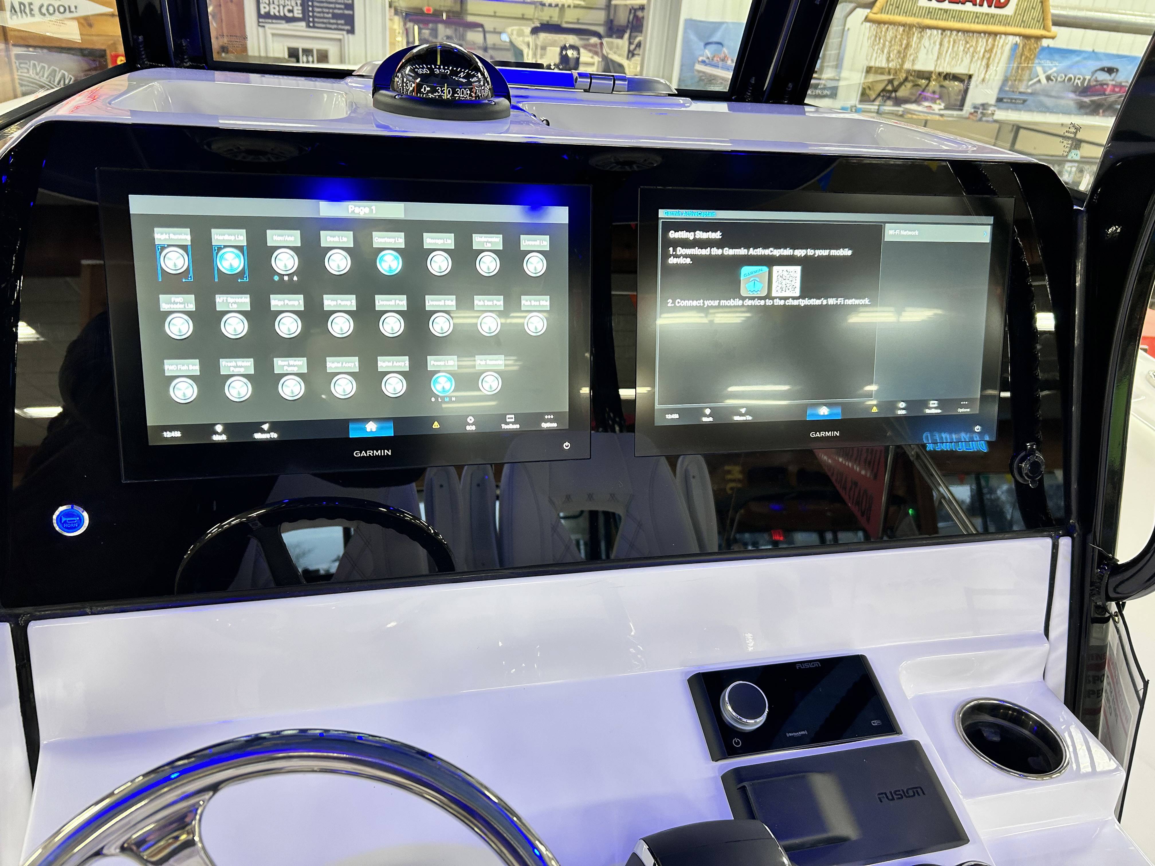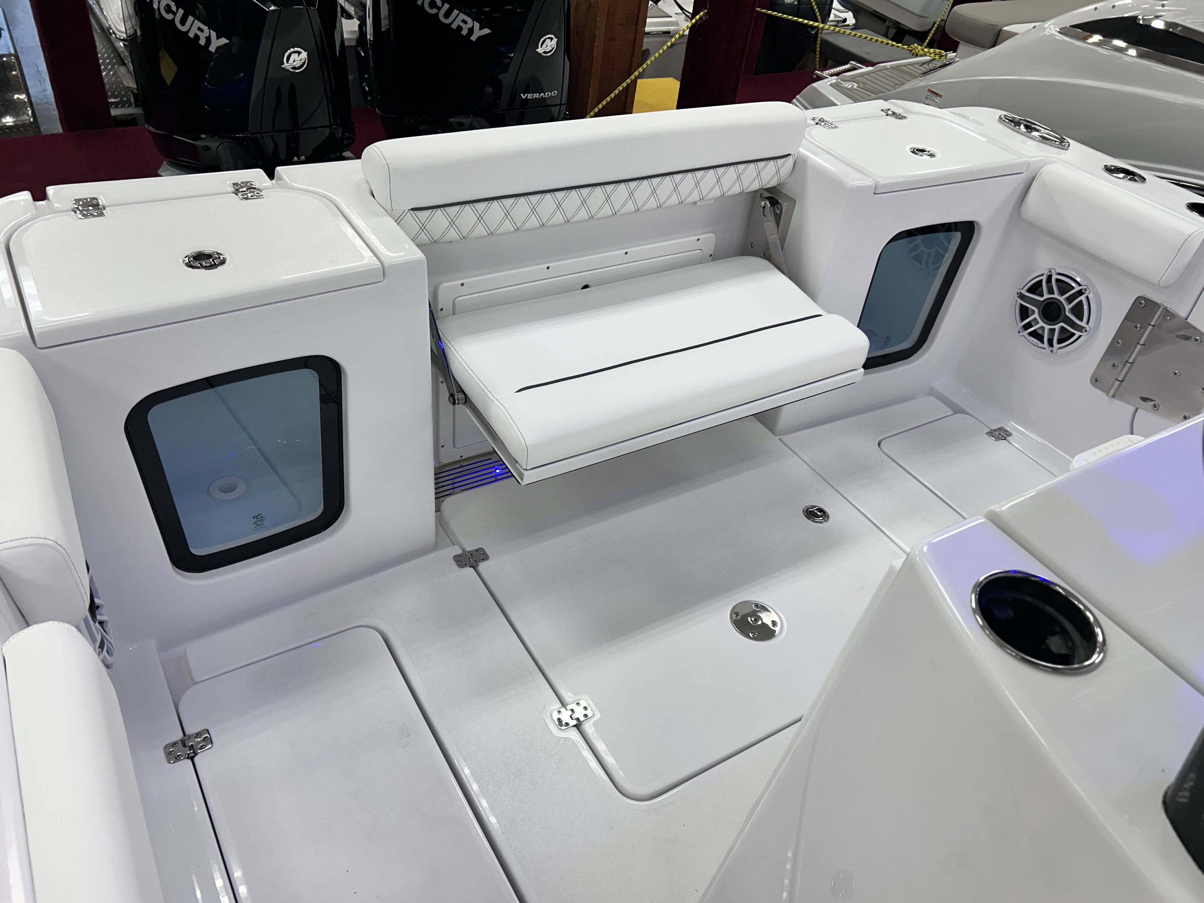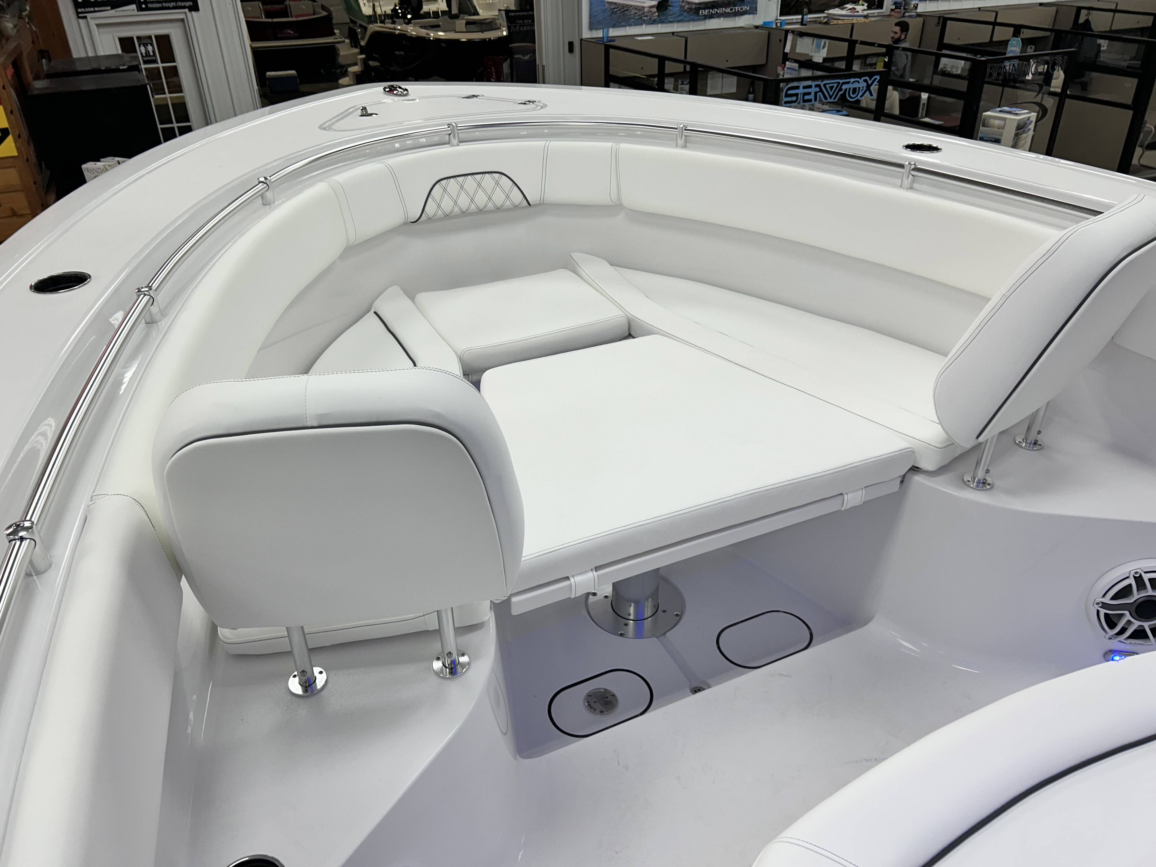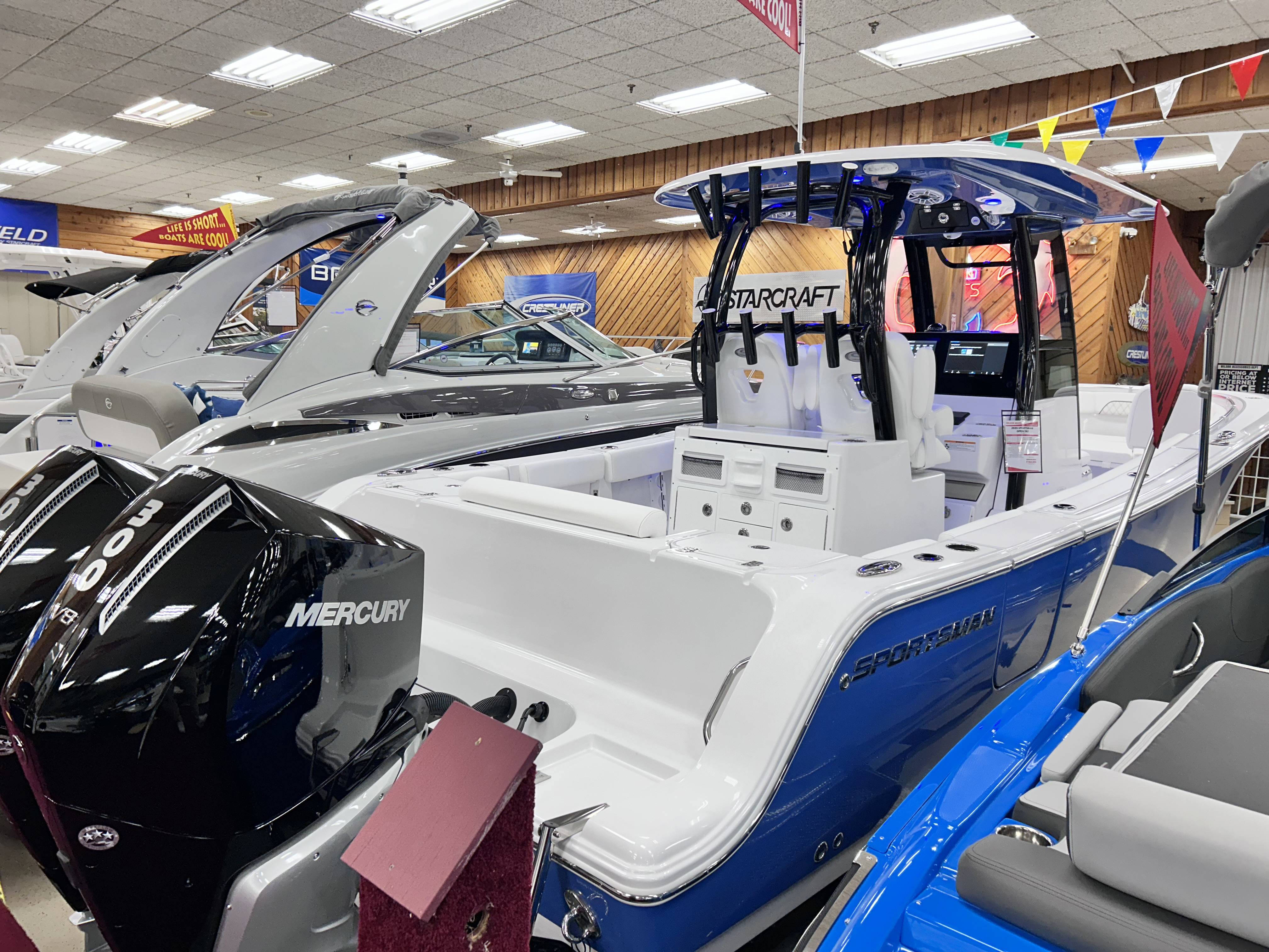 2025 Sportsman Open 282 powered by twin Mercury 300s!Factory Installed Options:Exterior- explorer blue hull sides with white bottomInterior- sileather polar whiteFiberglass console with liner and cooler seatFiberglass hard top with LED lightingExplorer blue hard top underside colorBlack powder coatingSundeck/table cushionFiberglass leaning post with tackle center & sink2 Garmin 16" GPS screens with built in WIFIGarmin GMR Fantom 18X RadomeFiberglass cockpit tableEdson 13SS comfort grip steering wheel with powere knobOn board battery charging system (4 bank)