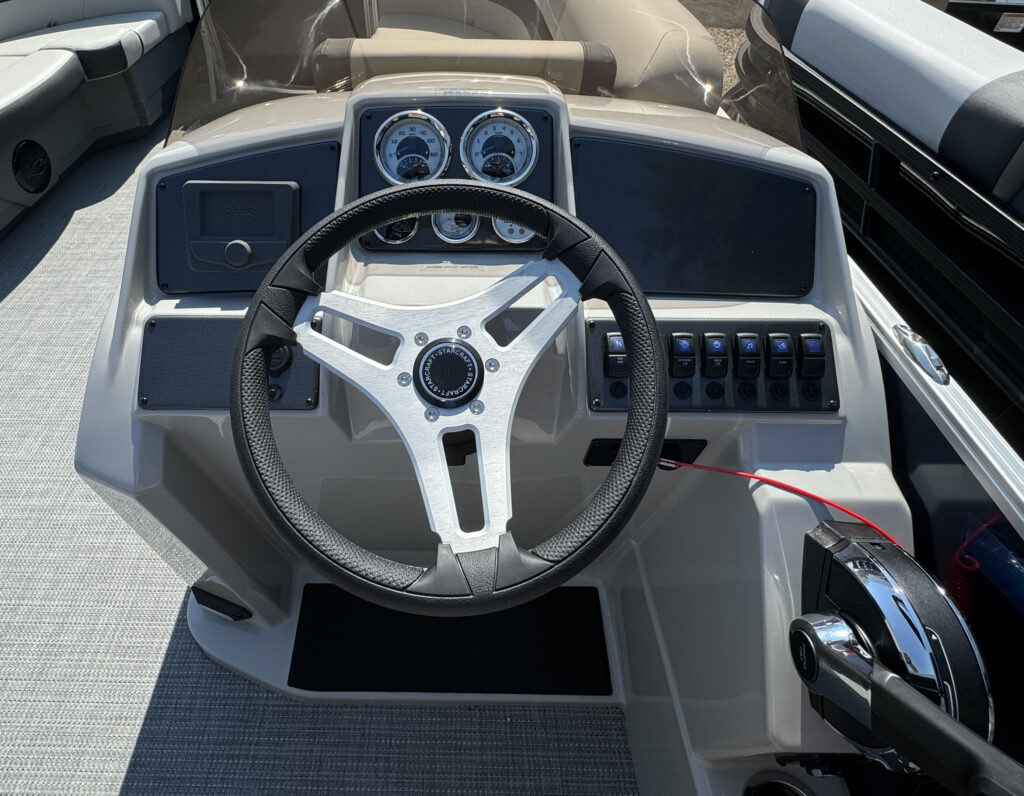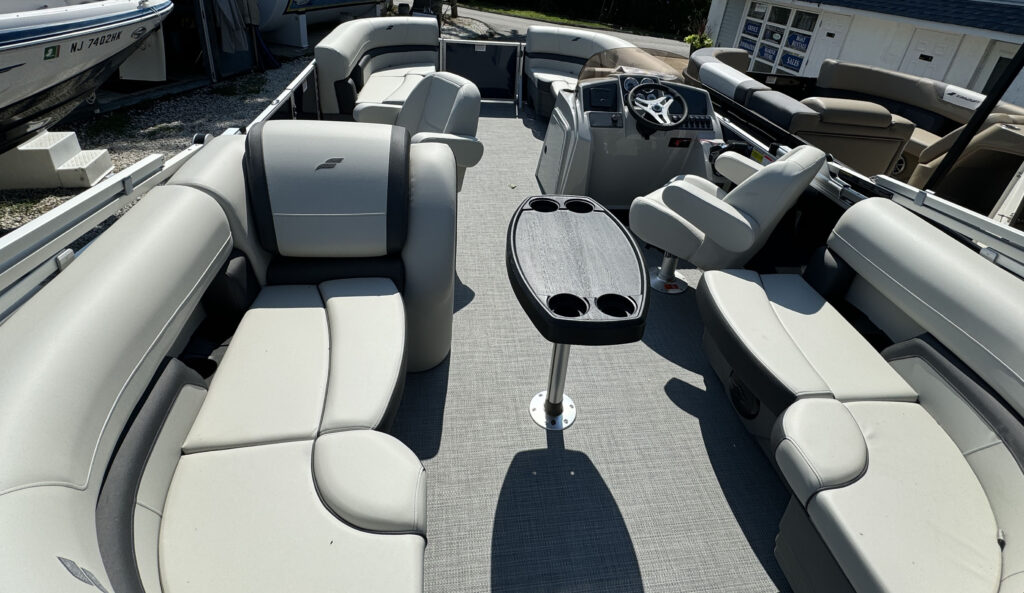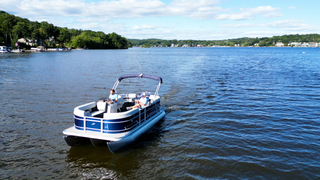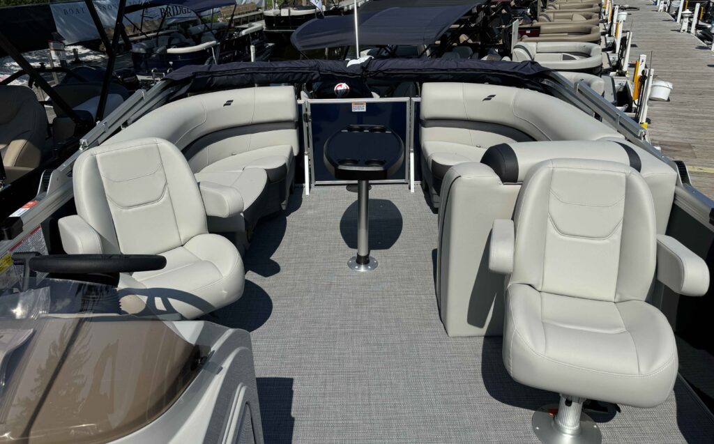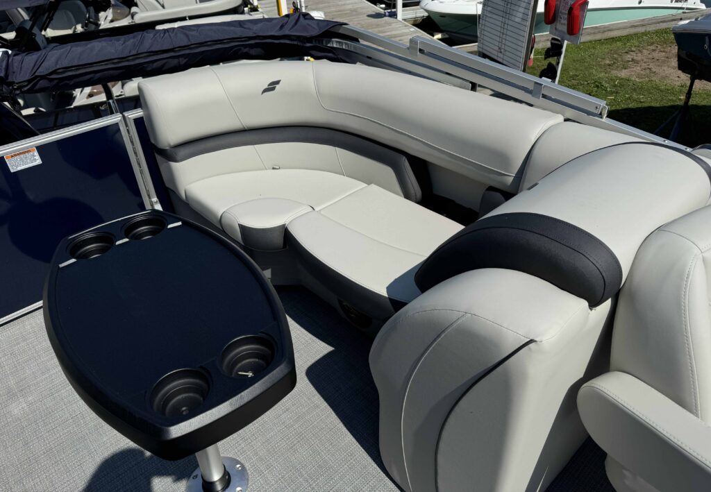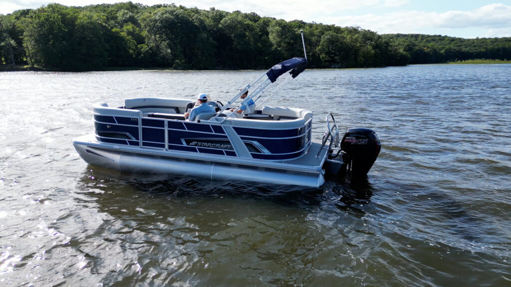 The Starcraft EX 20 R pontoon boat’s focus on comfort, conversation, and convenience makes this boat an ideal choice for creating unforgettable memories on the water. We love the complimentary combination of the sleek blue panels with the gray console and furniture.