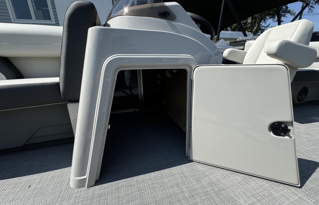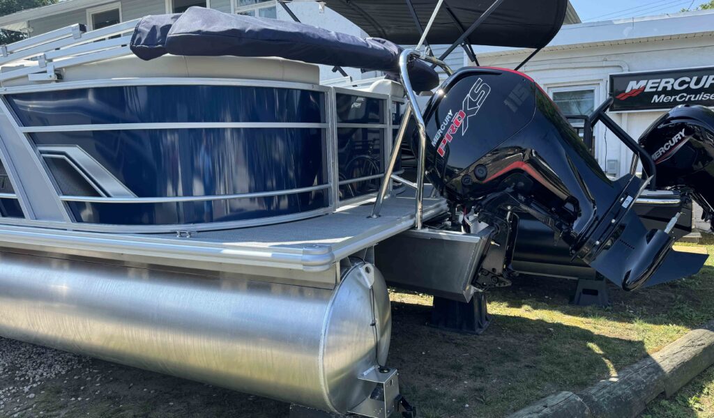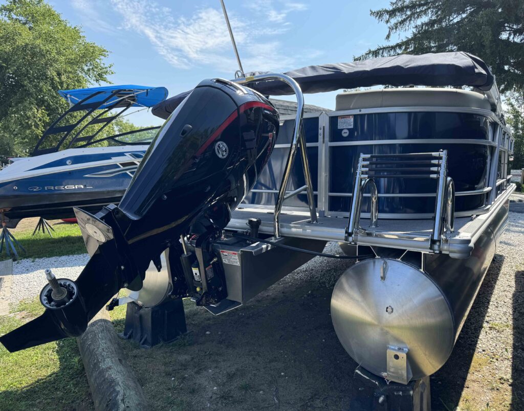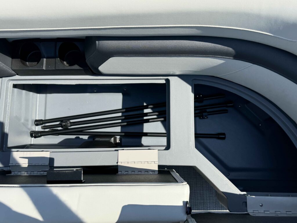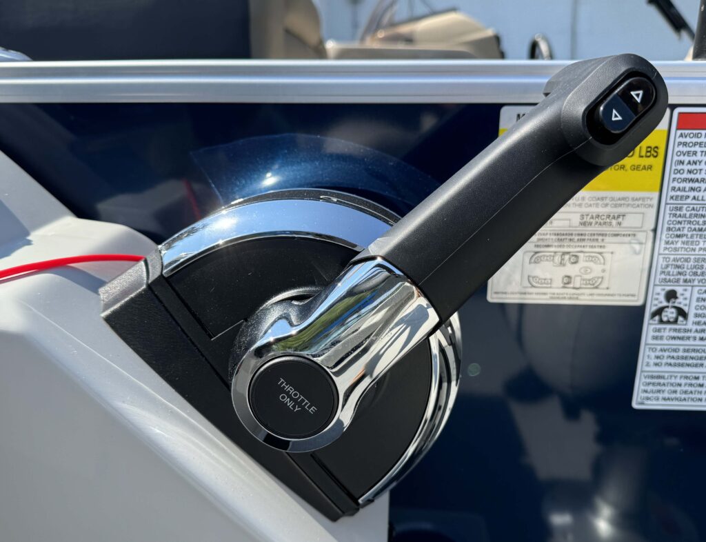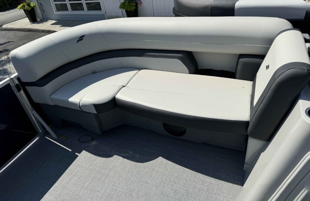 The Starcraft EX 20 R pontoon boat’s focus on comfort, conversation, and convenience makes this boat an ideal choice for creating unforgettable memories on the water. We love the complimentary combination of the sleek blue panels with the gray console and furniture.