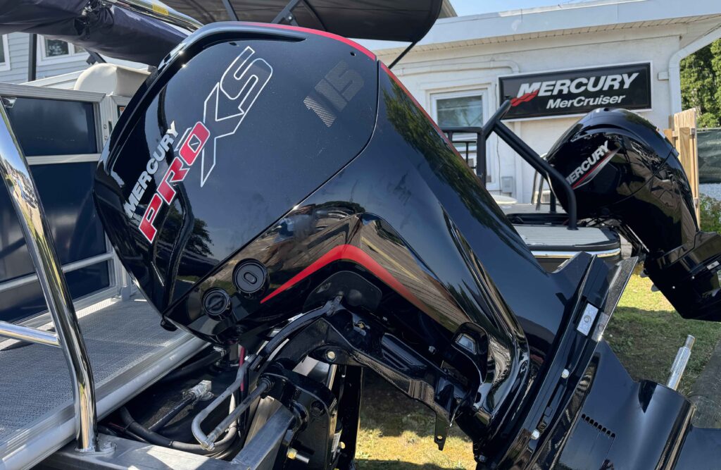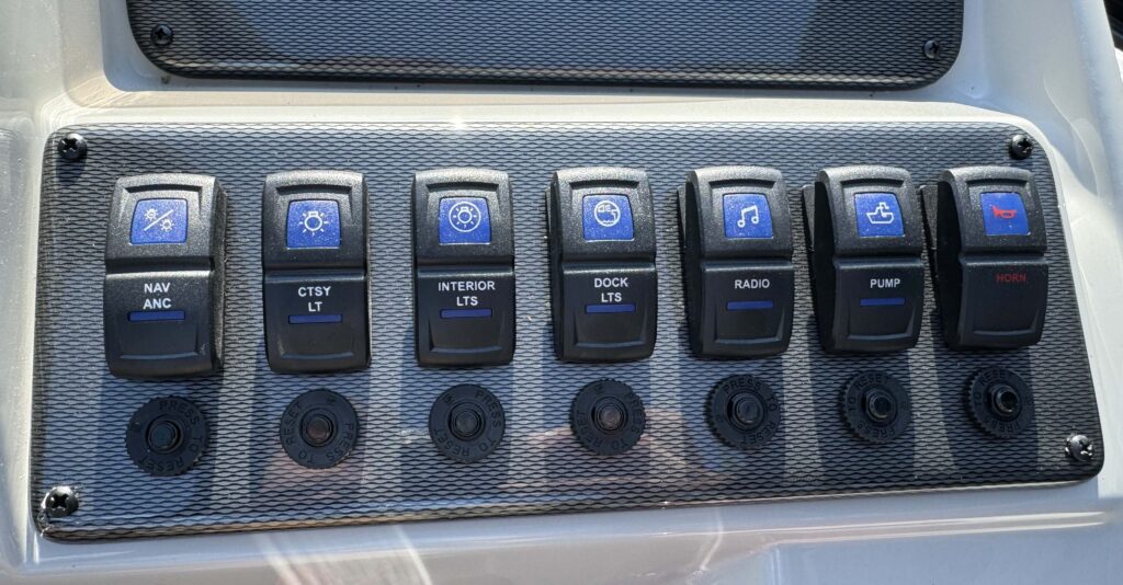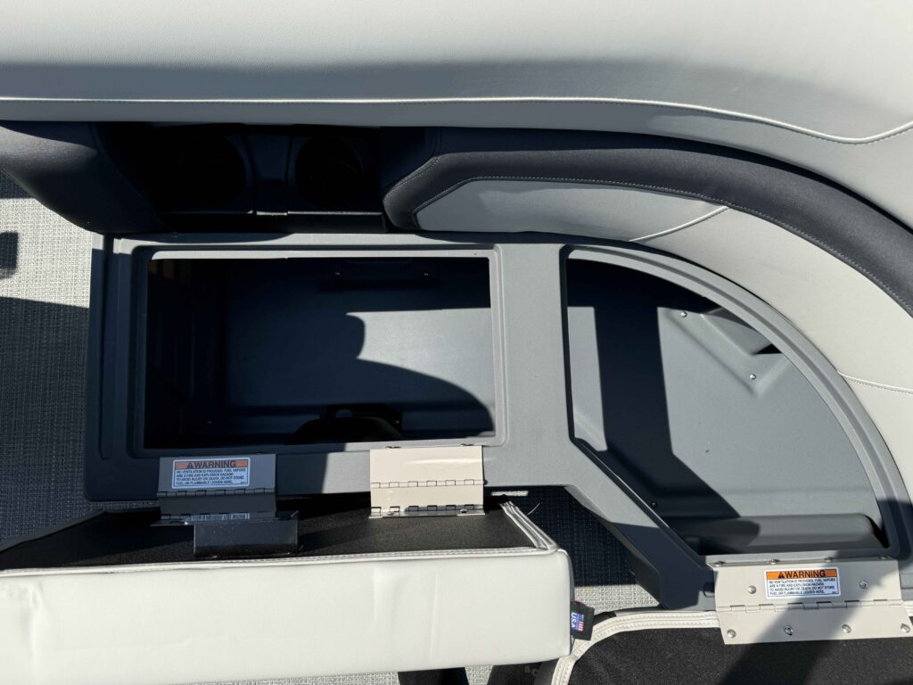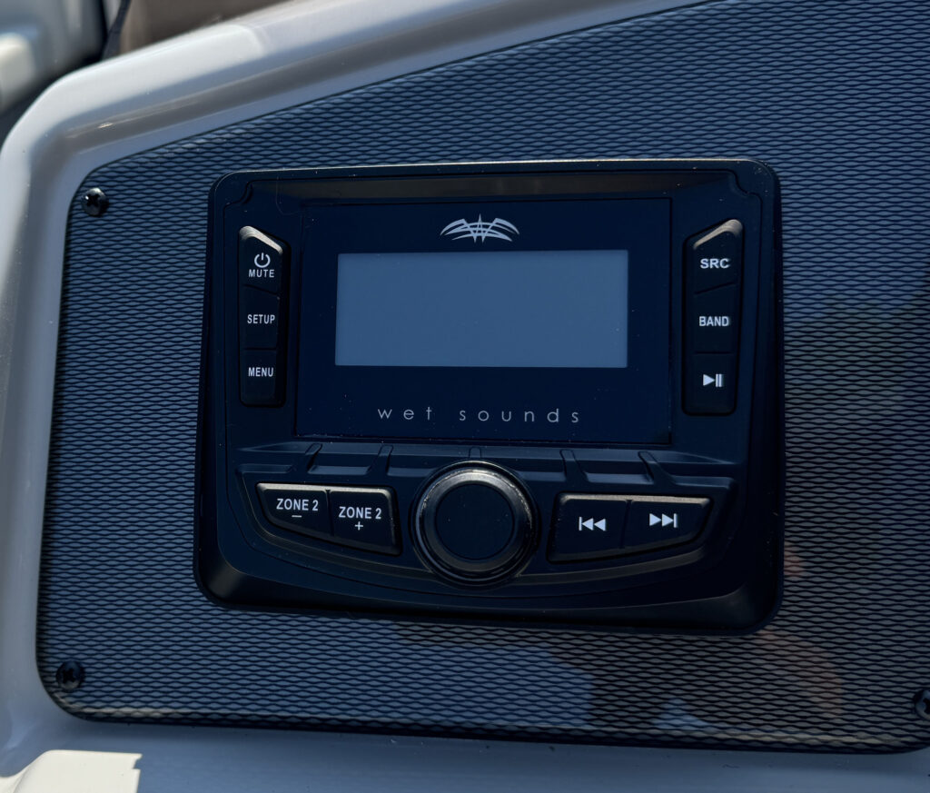Features include power bimini with blue canvas top and playpen cover, full sea weave flooring in gray, captain and co-captain’s chairs, tilt steering, Wet Sounds MC5 radio with four speakers, depth gauge, GPS, transom mount ski tow, and more!