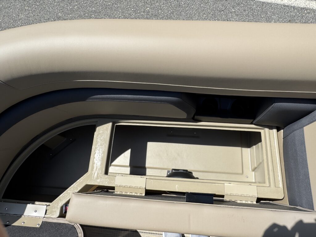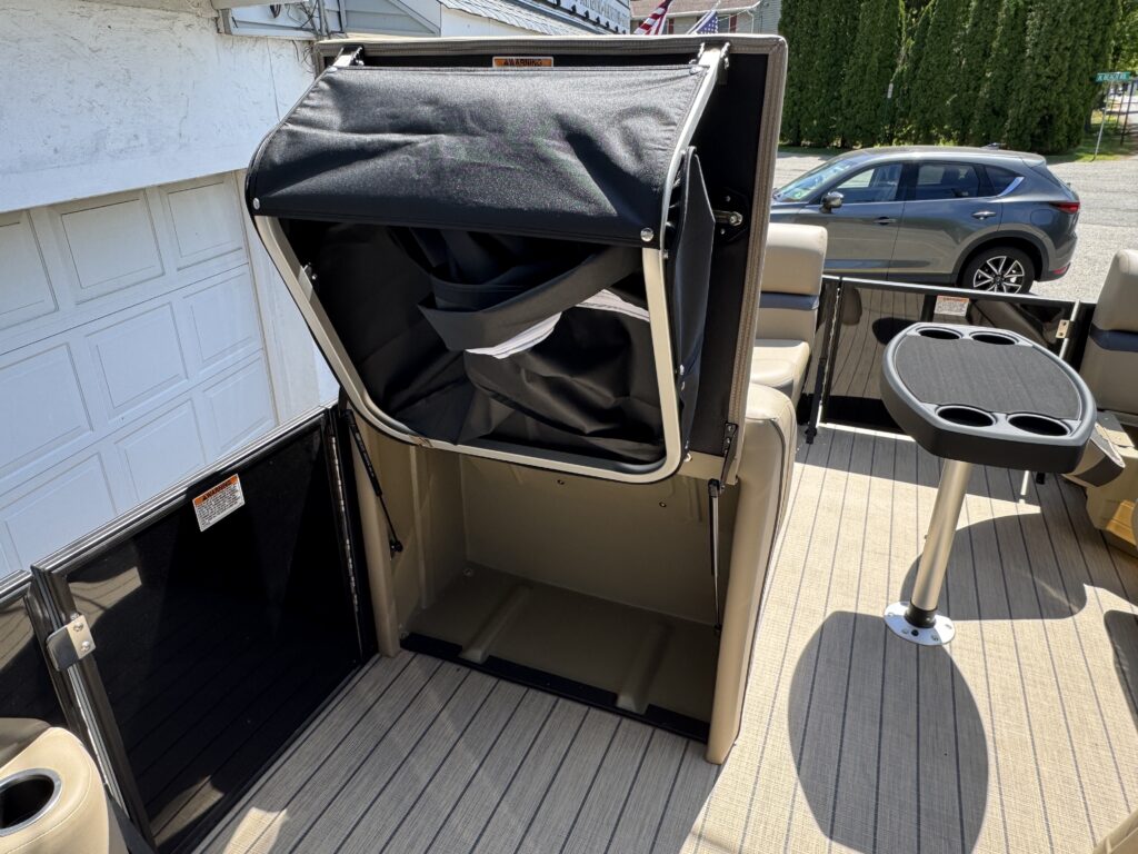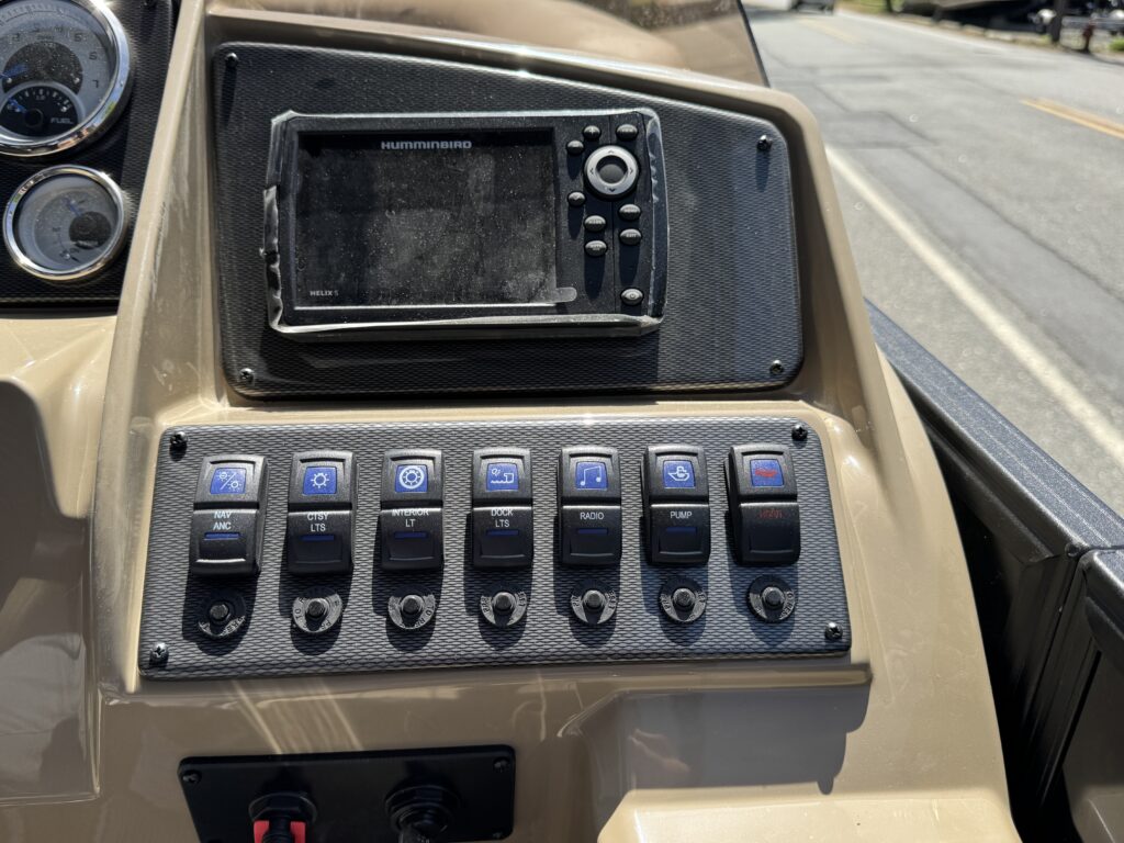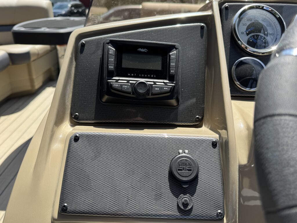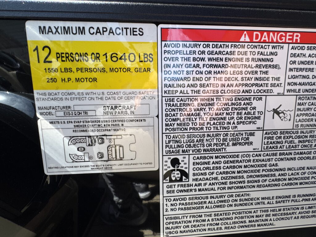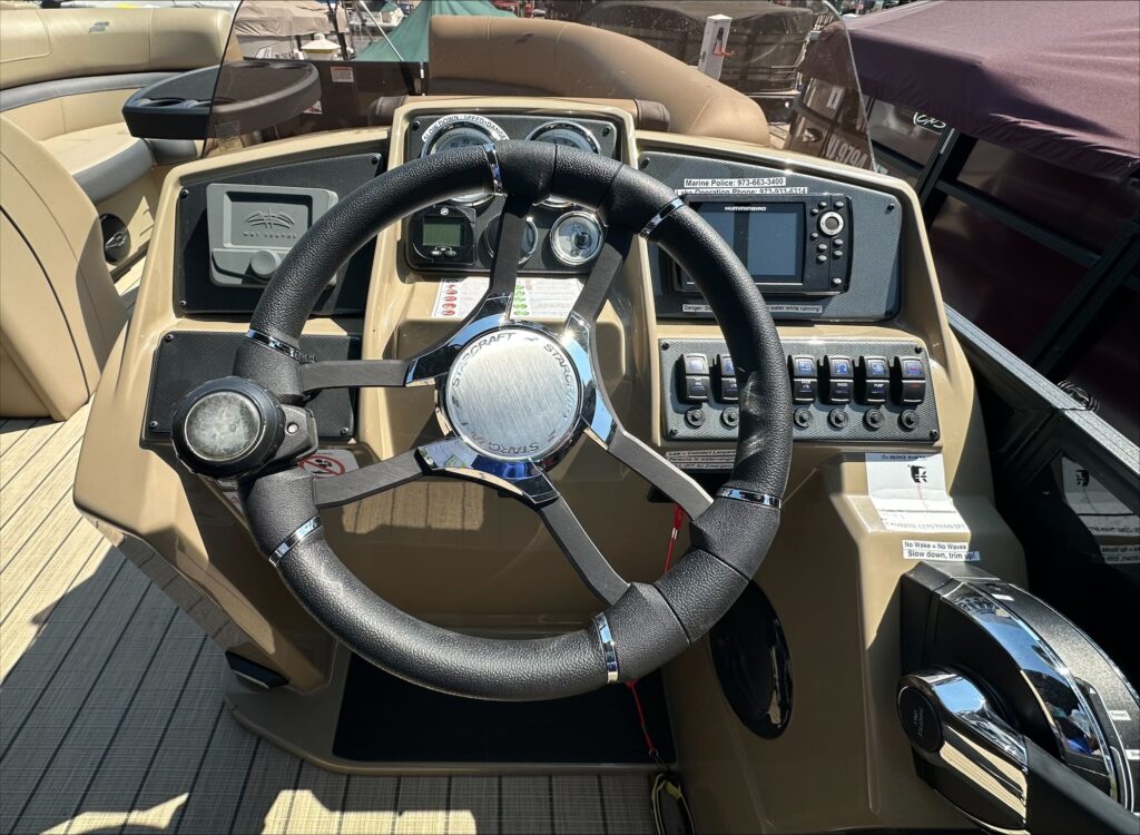 Features on this 2025 Starcraft EXS include a black power bimini top and playpen cover, full teak weave flooring in brown, two High Back helm chairs in mocha and tan, one fixed helm pedestal and one power helm pedestal, Wet Sounds MC5 radio and sound system, GPS, pylon ski tow, Lillipad REVO ladder with handles, and more!