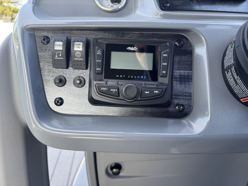 Features on this GX 22 R DH Sport include a black power bimini top and playpen cover, full teak weave flooring in grey, two fixed helm pedestals, Wet Sounds MC5 radio with sound system, Luna mood lights, transom mount ski tow, five-step aluminum ladder in black, and more!