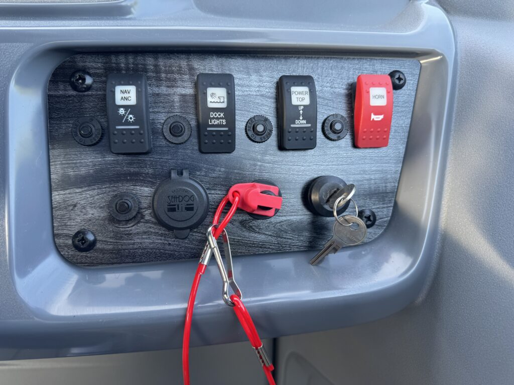 Luxury package includes two High Back helm chairs in platinum and grey, concealed mood lighting, Malera steering wheel, Helix 5 GPS, and power bimini top.