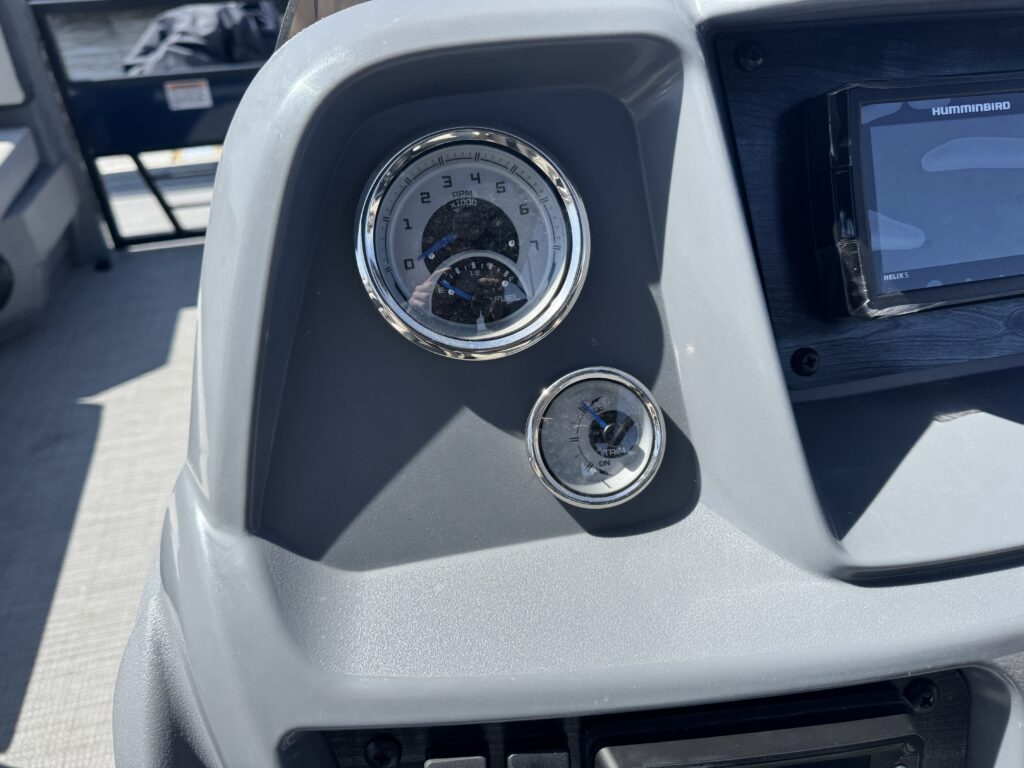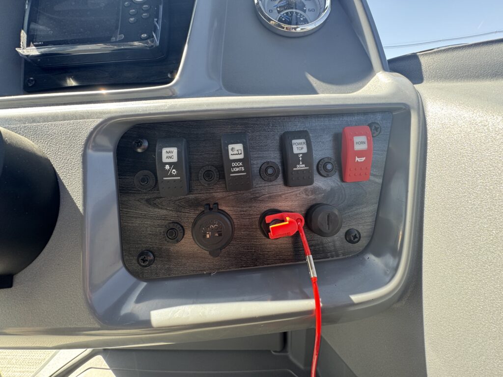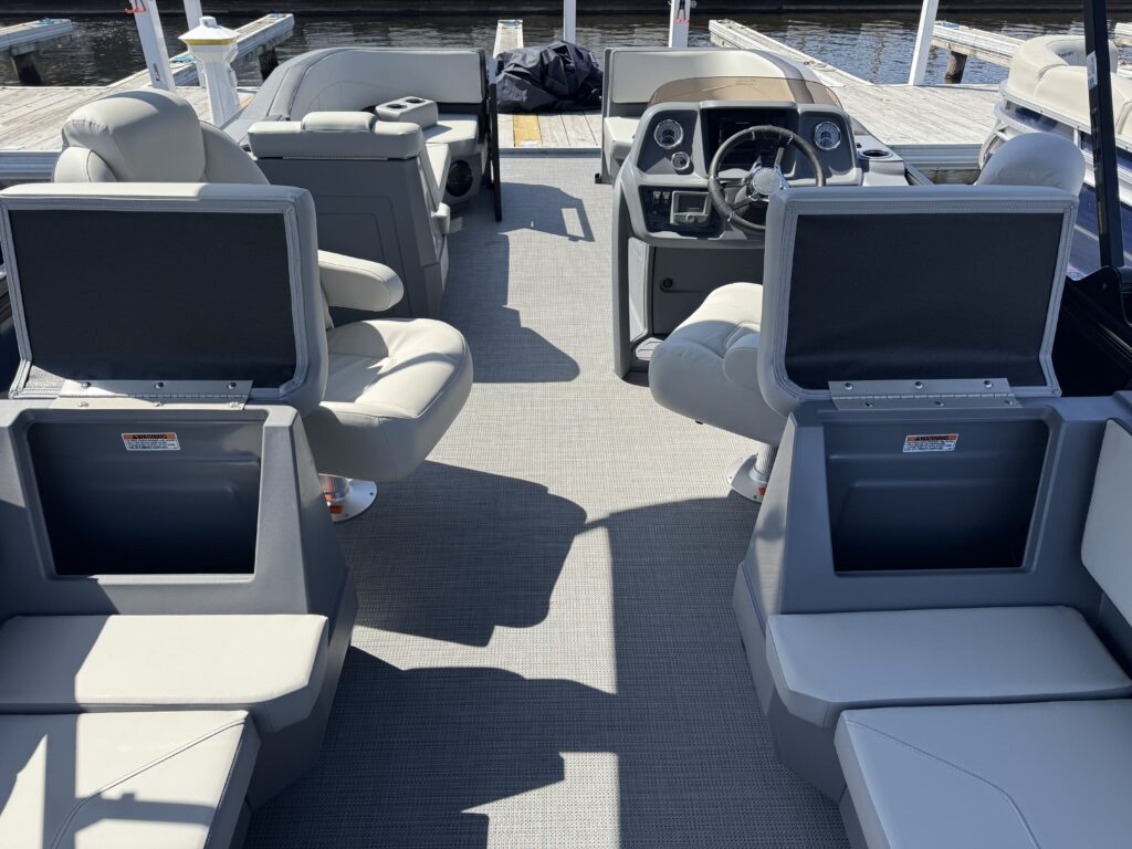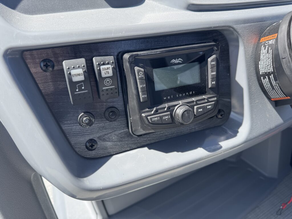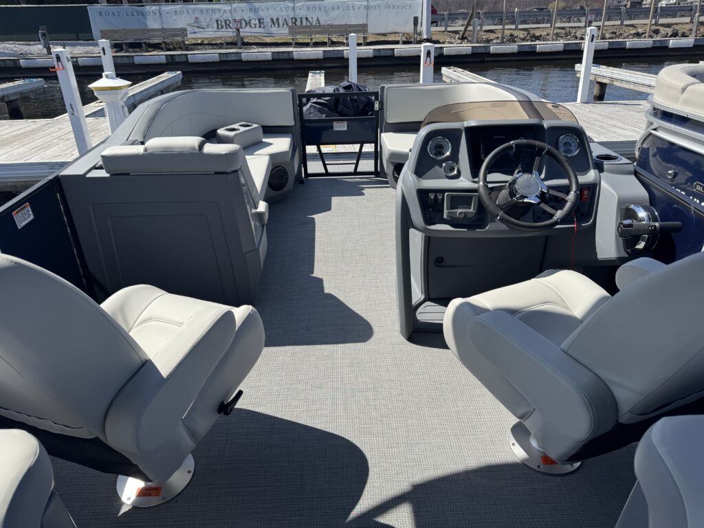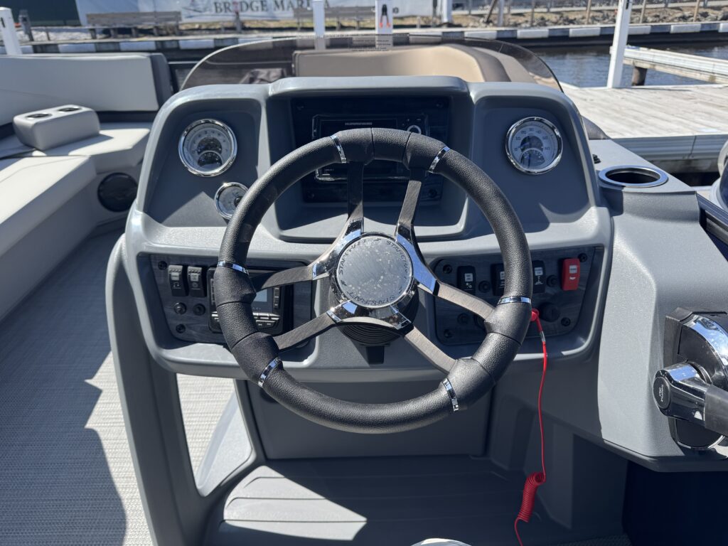 Luxury package includes two High Back helm chairs in platinum and grey, concealed mood lighting, Malera steering wheel, Helix 5 GPS, and power bimini top.