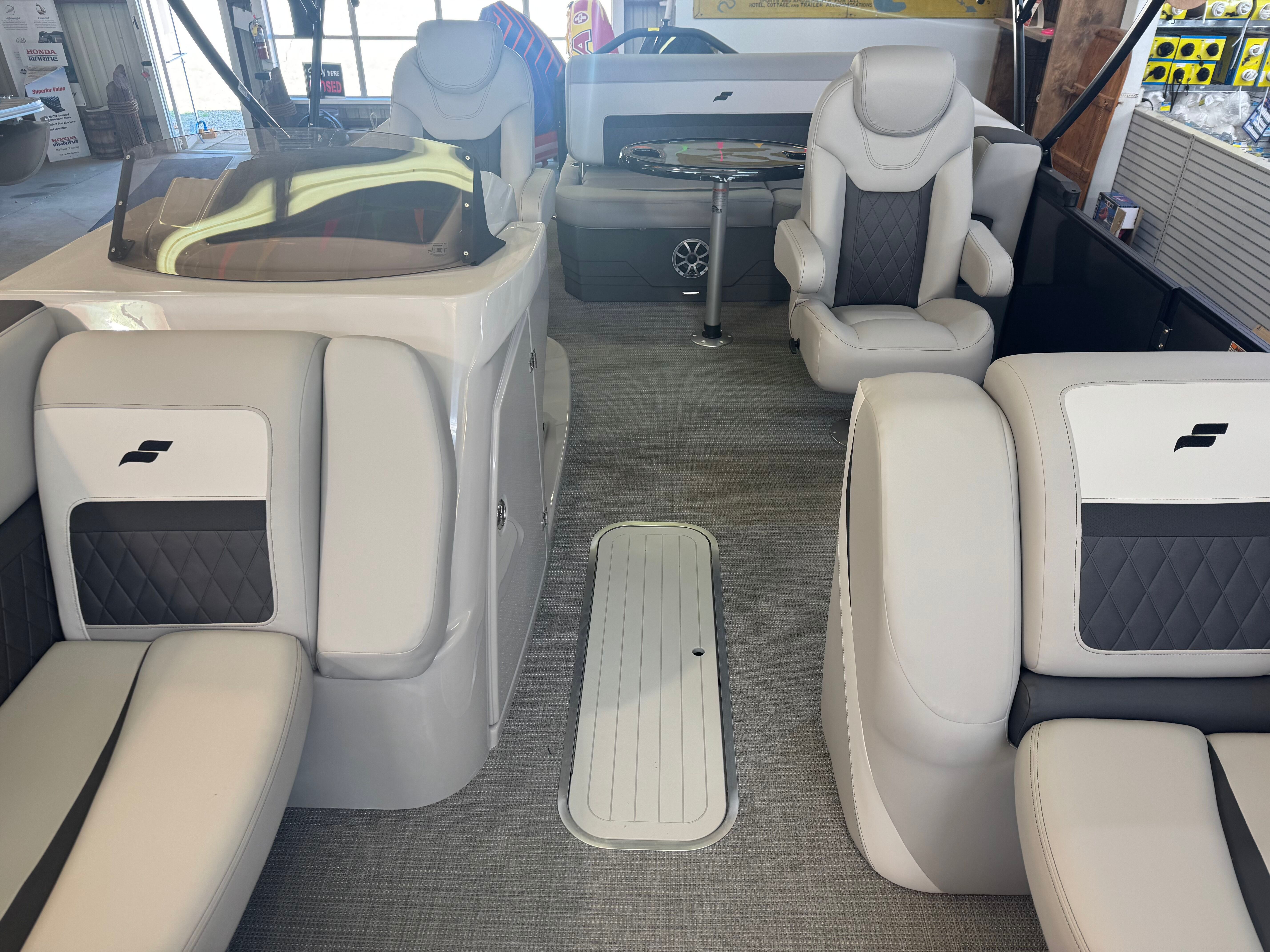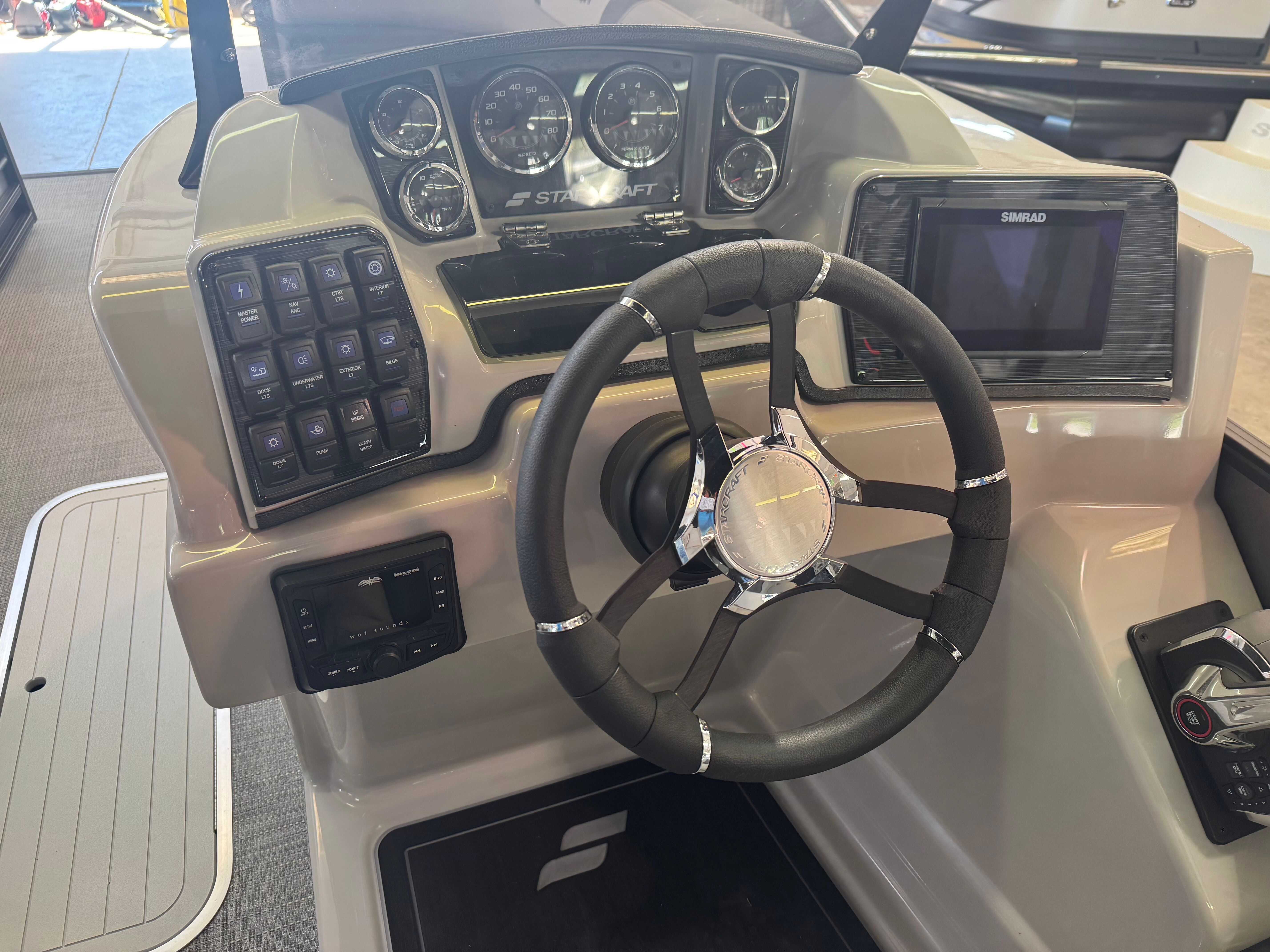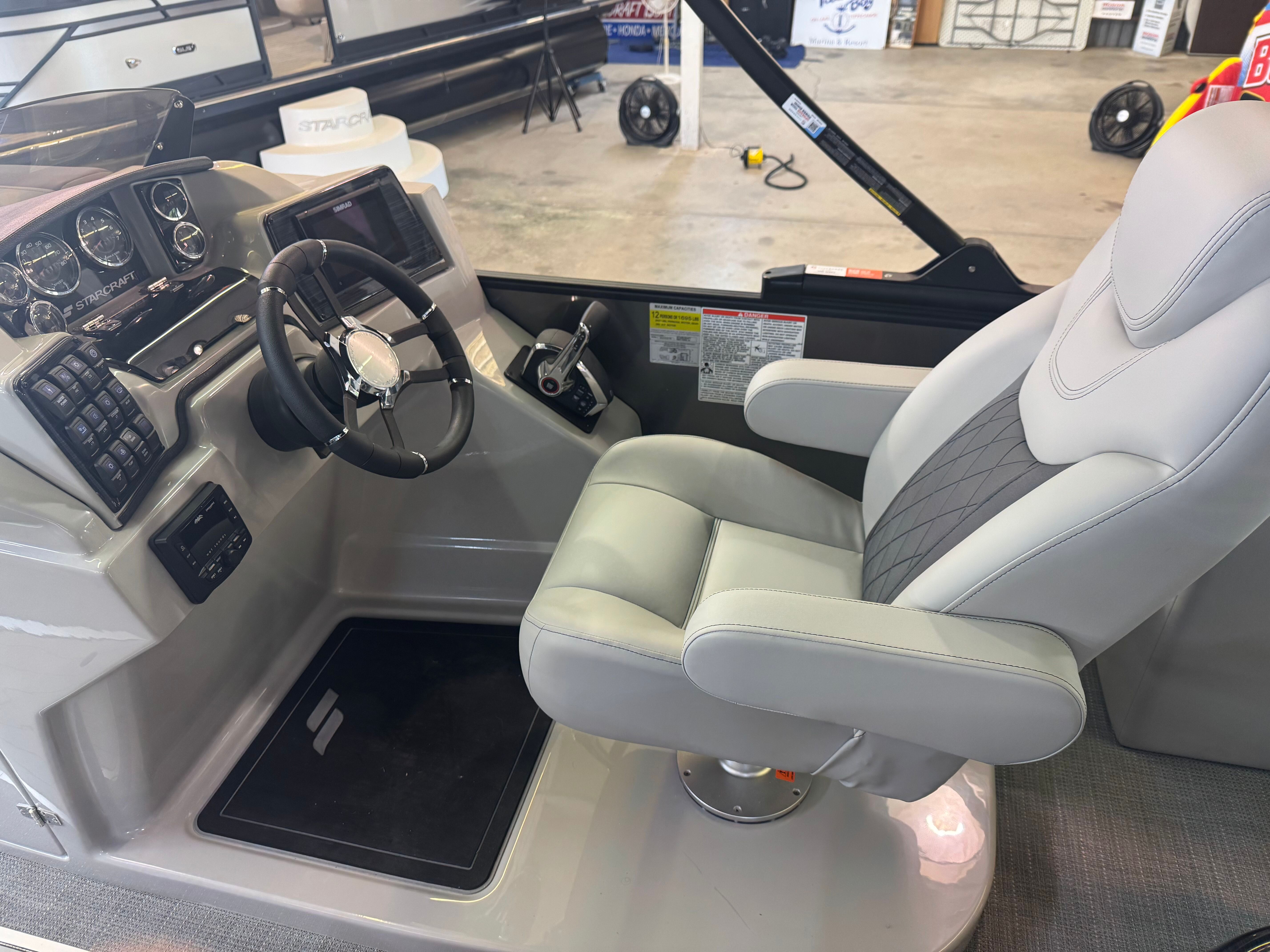 OPTIONAL EQUIPMENT INCLUDED WITH THIS UNIT INCLUDE: AUDIO PLUS 225 RADIO UPGRADE W/ REAR FACING SPEAKERS, IN FLOOR STORAGE, RAISED HELM PLATFORM, STAINLESS STEEL WINDSCREEN BRACKETS, POWER ASSIST STEERING, POWER BIMINI TOP UPGRADE, DUAL BATTERIES W/ SWITCH, SIMRAD GO7 W/ ENGINE INTERFACE, UNDERDECK LIGHTS, LILLIPAD REVO LADDER, MERCURY 200XL MOTOR W/ DTS CONTROLS.