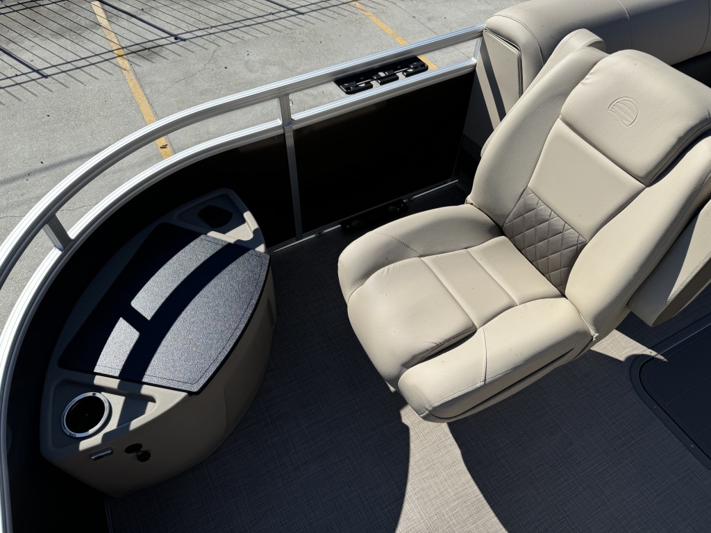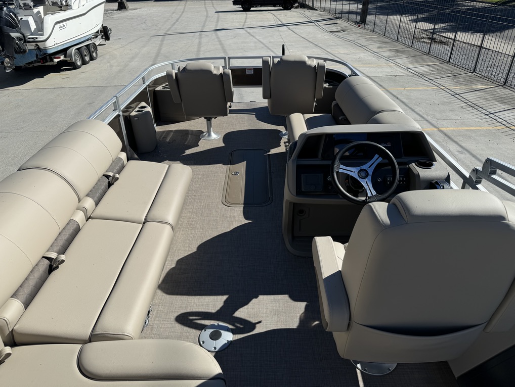 This SUN TRACKER® pontoon boat's 24' deck stays stable thanks to 3 pontoon logs with lifting strakes. Be ready to wet a line at any moment with the lockable rod box. From the bow casting deck’s dual removable and folding fishing chairs, anglers can take advantage of rail-mounted rod holders, an aerated livewell, the tackle storage compartment, and more.