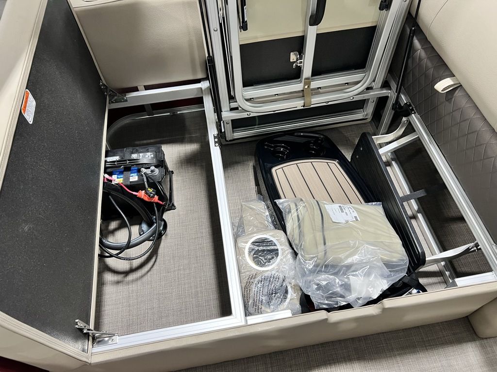 - 10' (3.05 m) SUN TRACKER® QuickLift™ Bimini top w/LED courtesy lights, storage pockets & protective boot (color-coordinated Black w/Charcoal fencing or Sand w/Copper Red fencing)