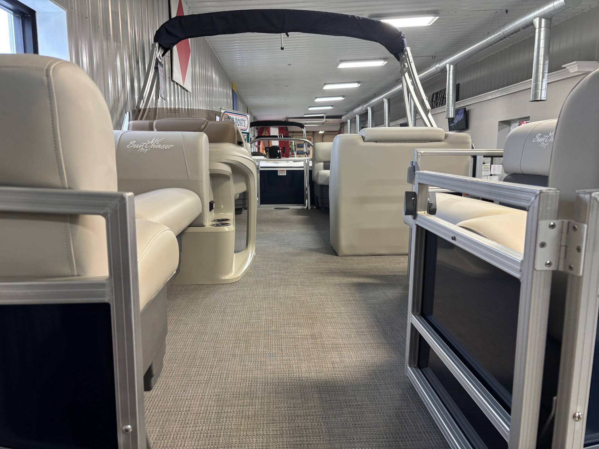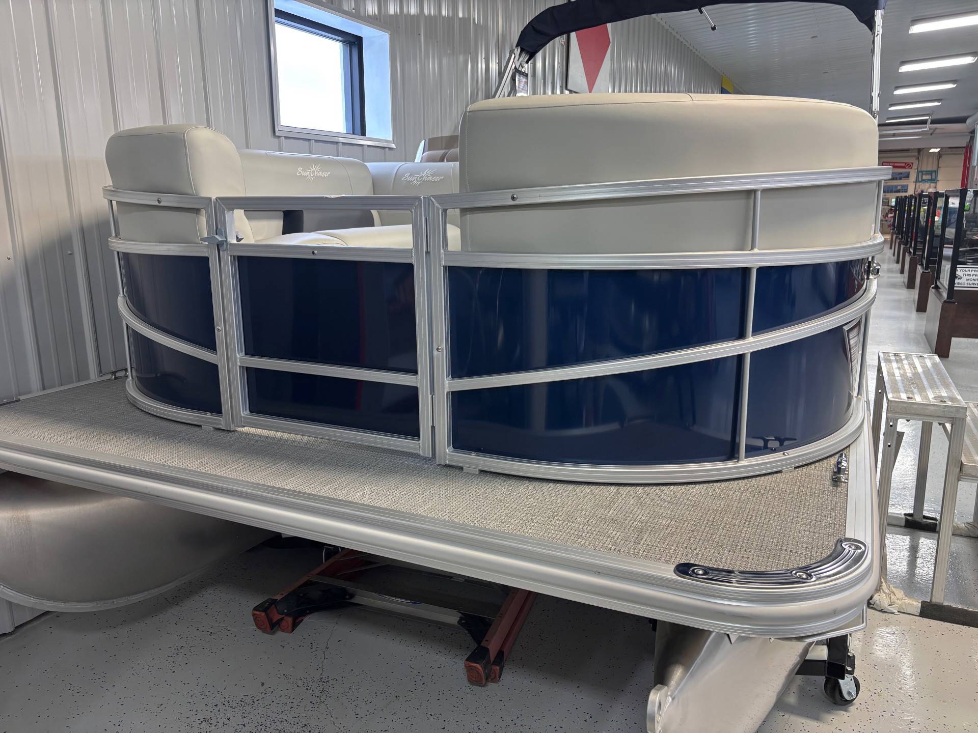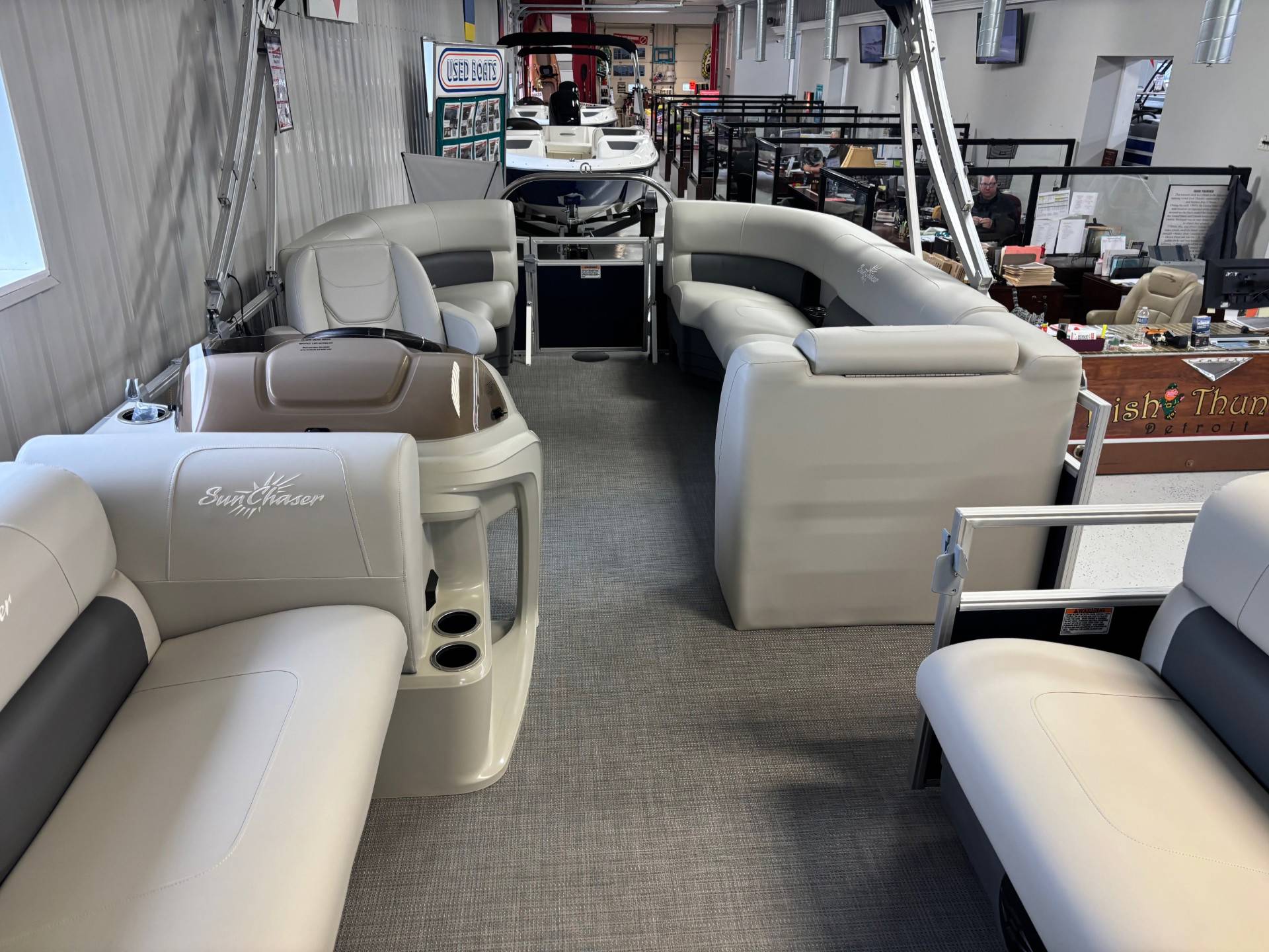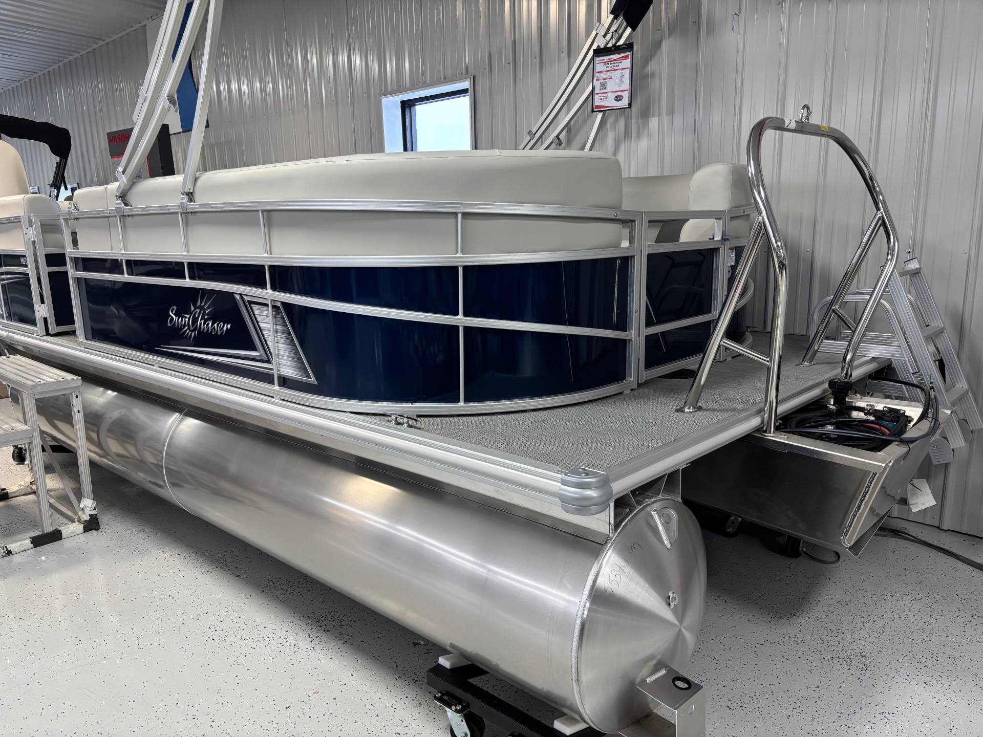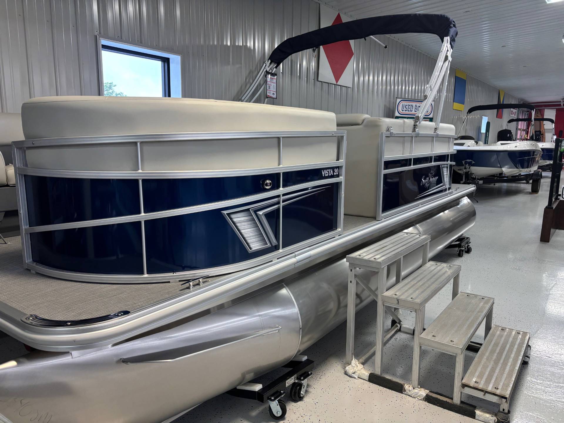 2025 SunChaser Vista 20 LR powered by a Yamaha F90LB EngineFactory Installed Options:Exterior- blueInterior- grayTube upgradeWindscreenSea weave gray flooringFull front gateLow back helm seatTilt steeringBlue bimini topBlue playpen coverWet sounds MC5 radioTransom mount ski towSelva steering wheel5 step aluminum ladderGray table kit