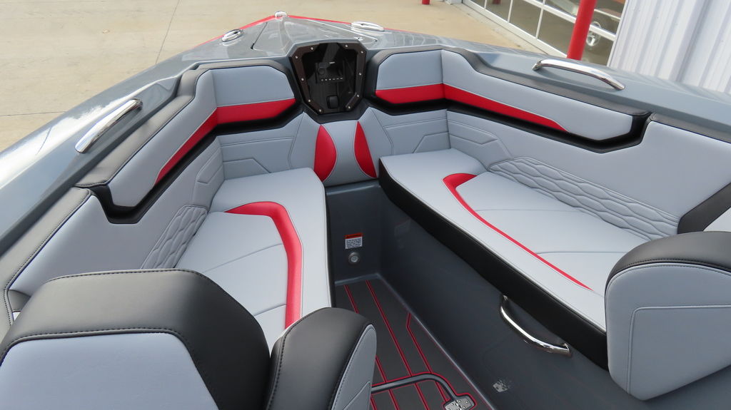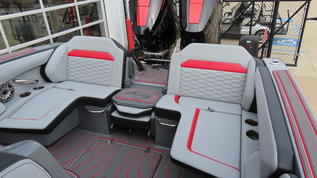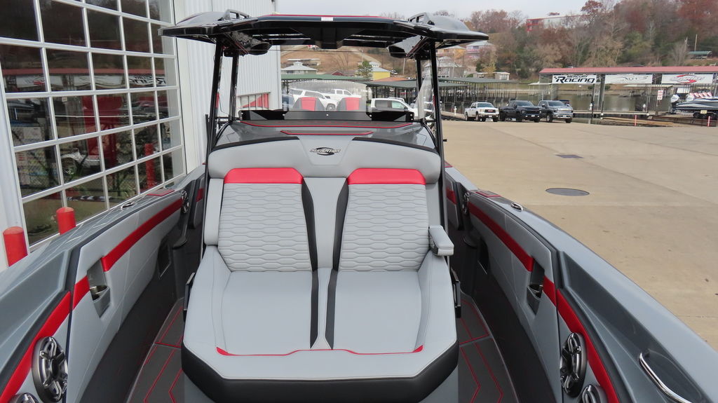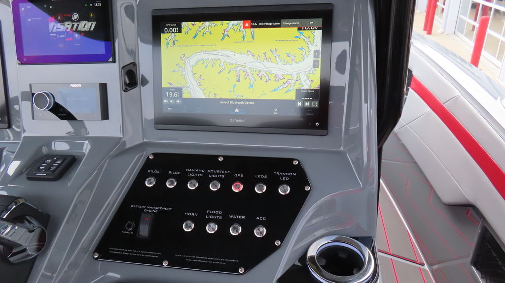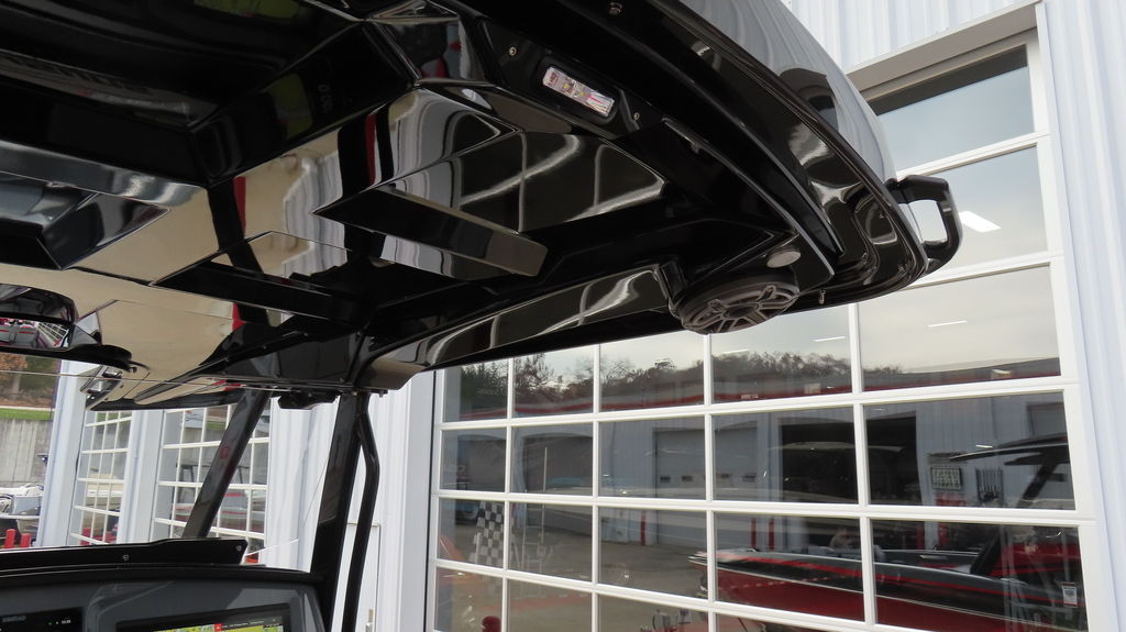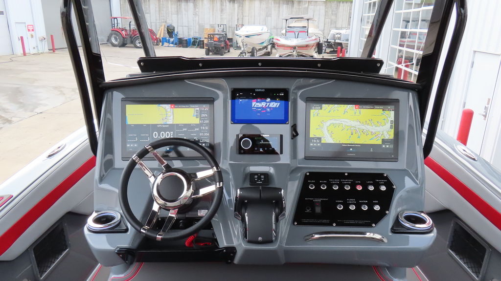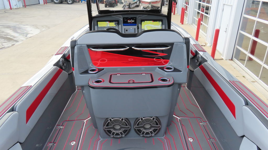 powered by twin Mercury Racing V10 400R Verado. Additional battery with onboard charger and electric switch on dash, dual Garmin 8616s. Mercury Vessel View 903, Stage 2 JL Audio stereo upgrade with remote in bow, depth sounder, LED RGB color changing cockpit lights, Hydro Foam flooring, Isotta steering wheel with tilt, LED trim tab indicators, pump out porta potty, and windlass anchor. Grey dash, black hard top, Mitcher T custom paint, canvas package; includes TTop cover, Stern manual sunshade, and high pressure washdown.