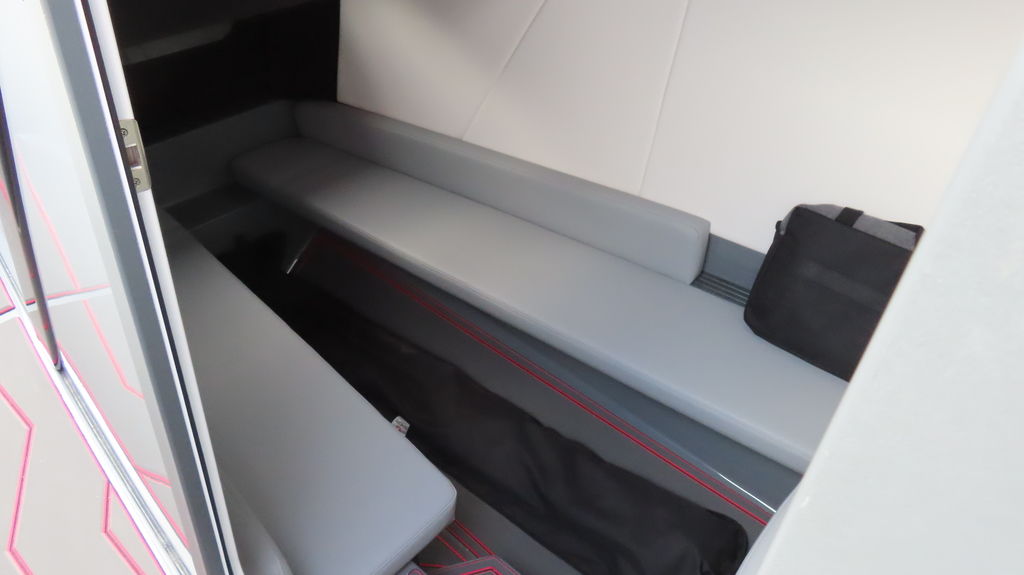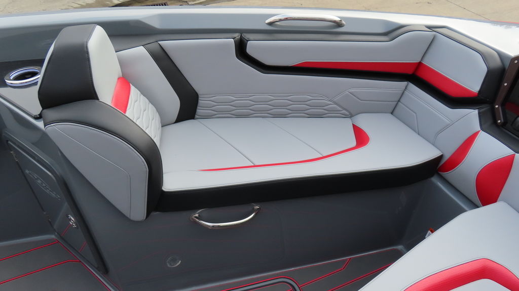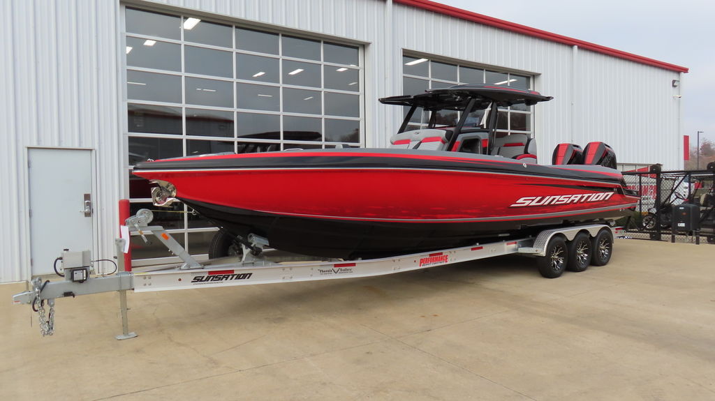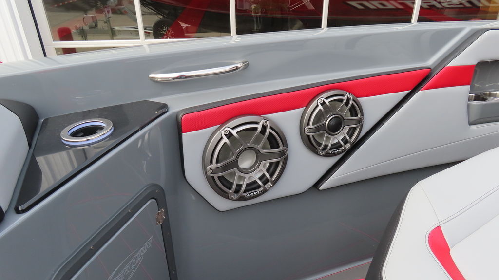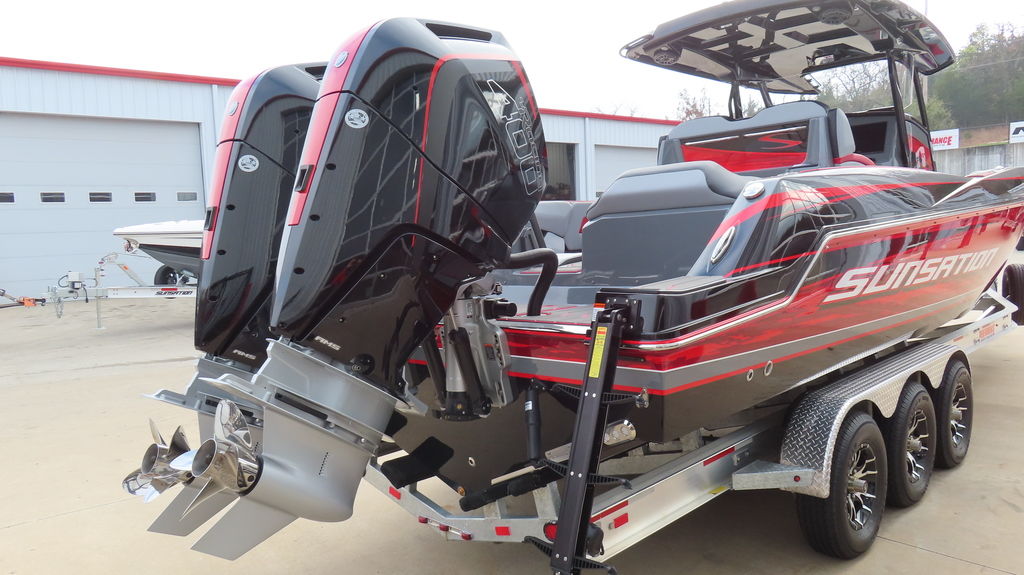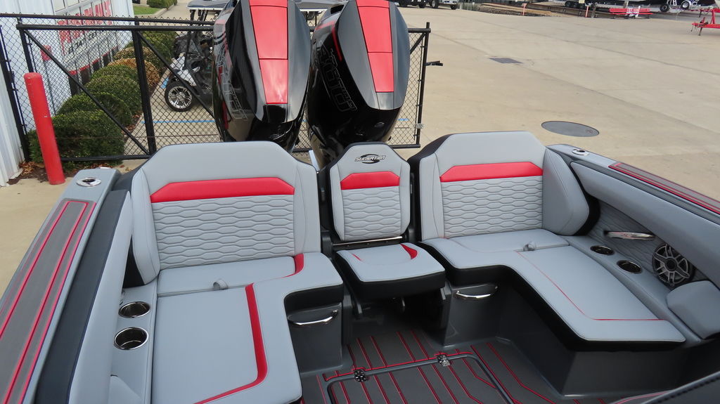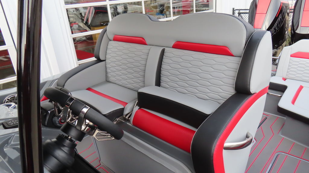 powered by twin Mercury Racing V10 400R Verado. Additional battery with onboard charger and electric switch on dash, dual Garmin 8616s. Mercury Vessel View 903, Stage 2 JL Audio stereo upgrade with remote in bow, depth sounder, LED RGB color changing cockpit lights, Hydro Foam flooring, Isotta steering wheel with tilt, LED trim tab indicators, pump out porta potty, and windlass anchor. Grey dash, black hard top, Mitcher T custom paint, canvas package; includes TTop cover, Stern manual sunshade, and high pressure washdown.