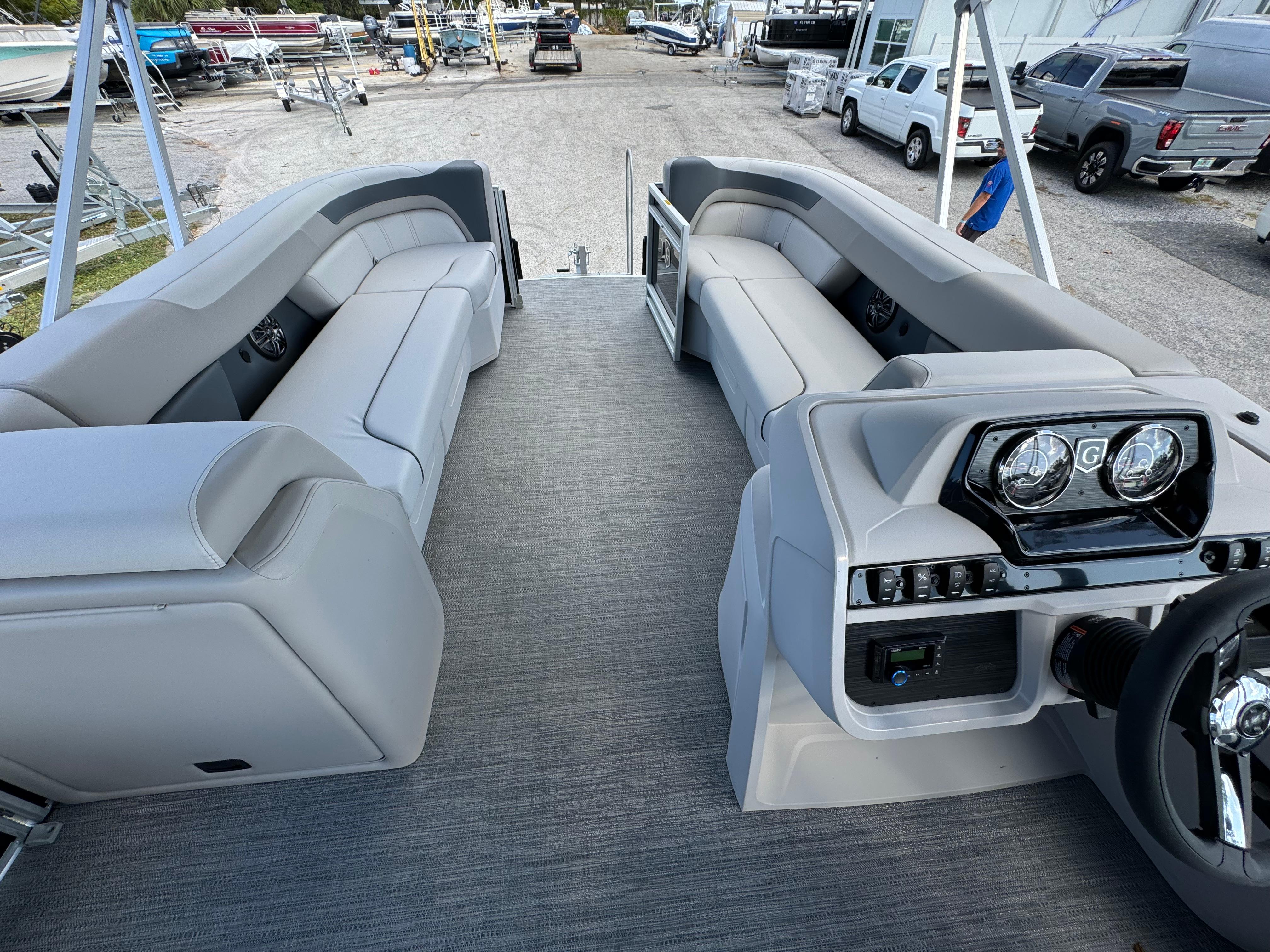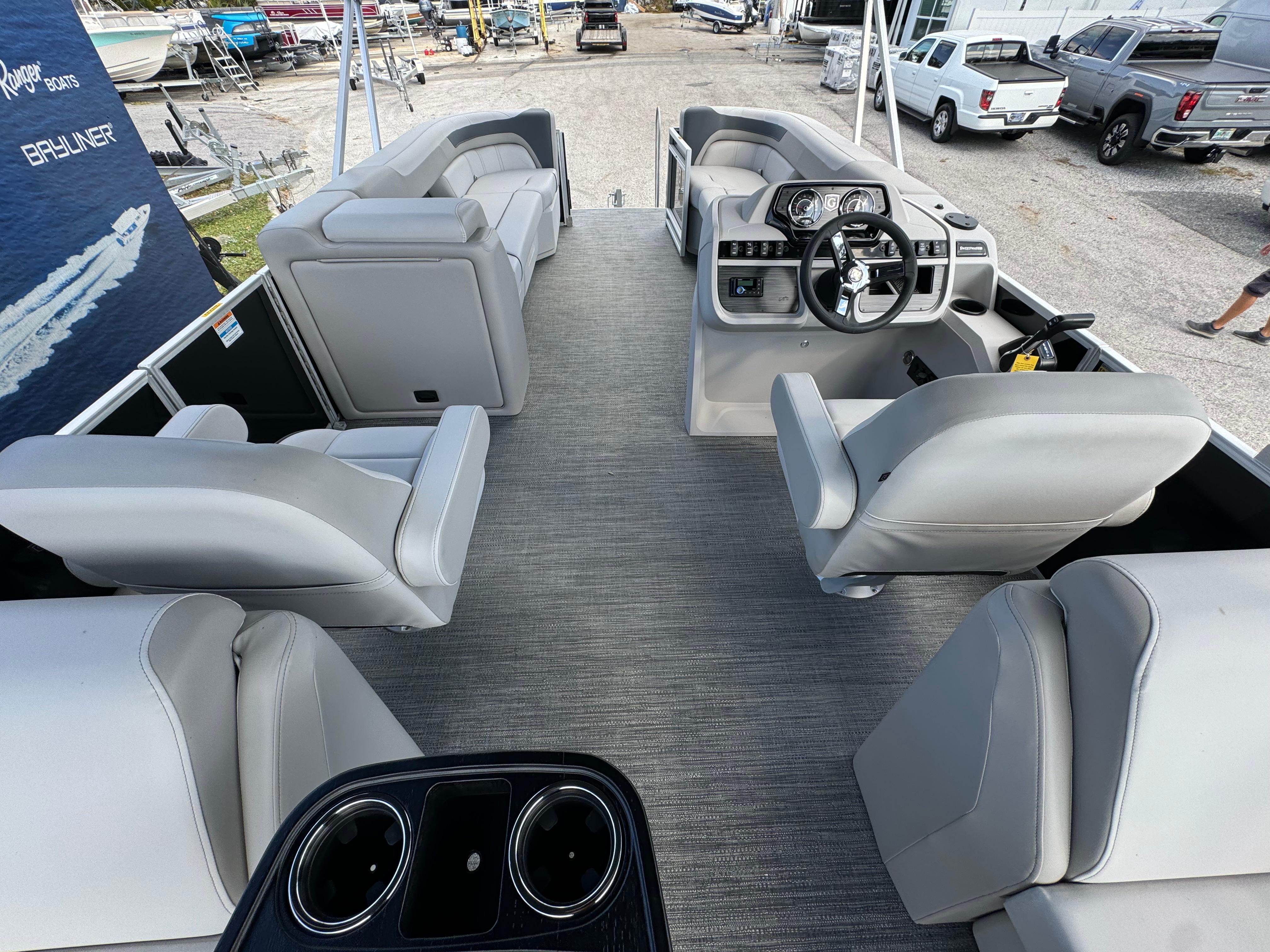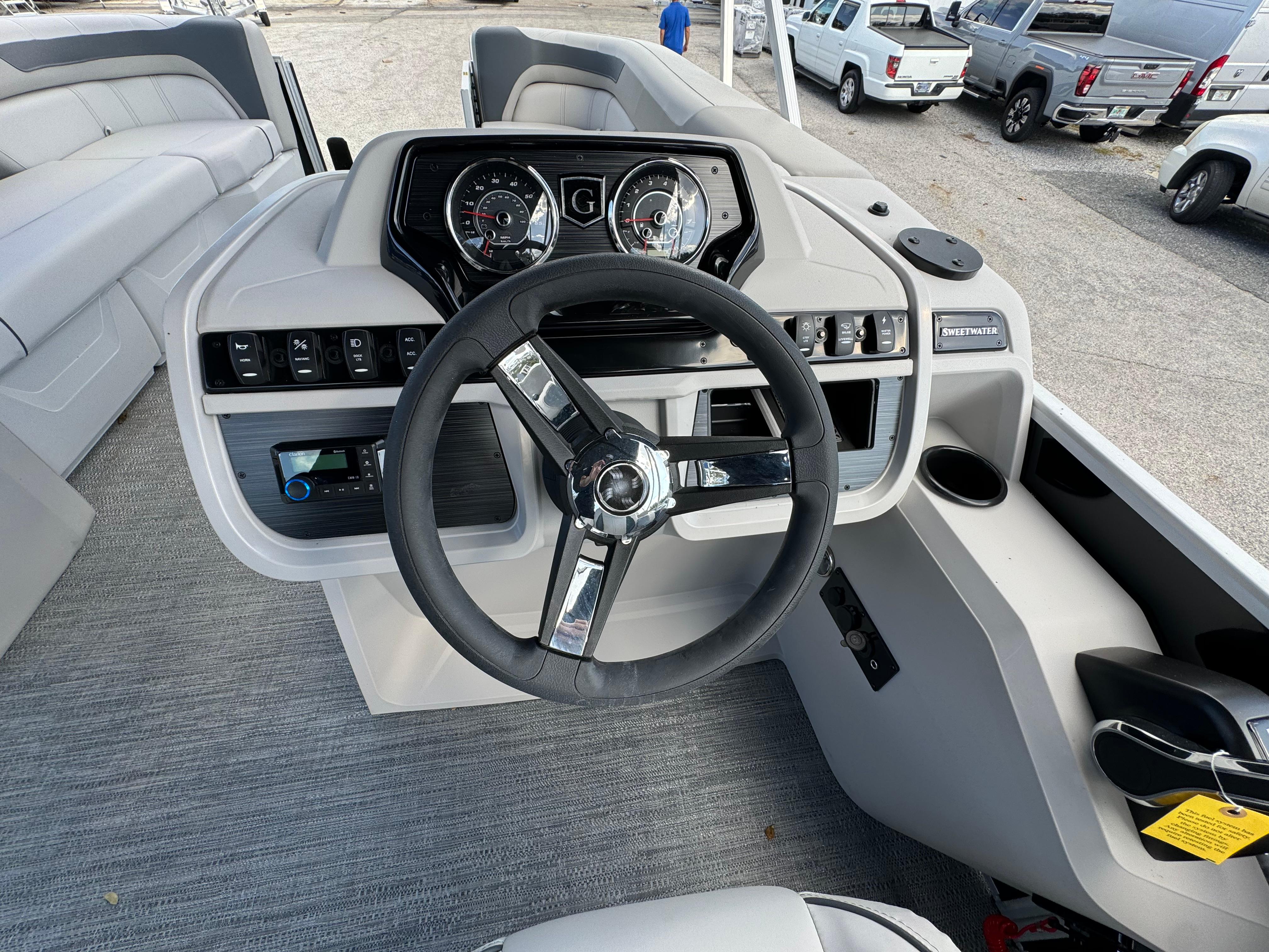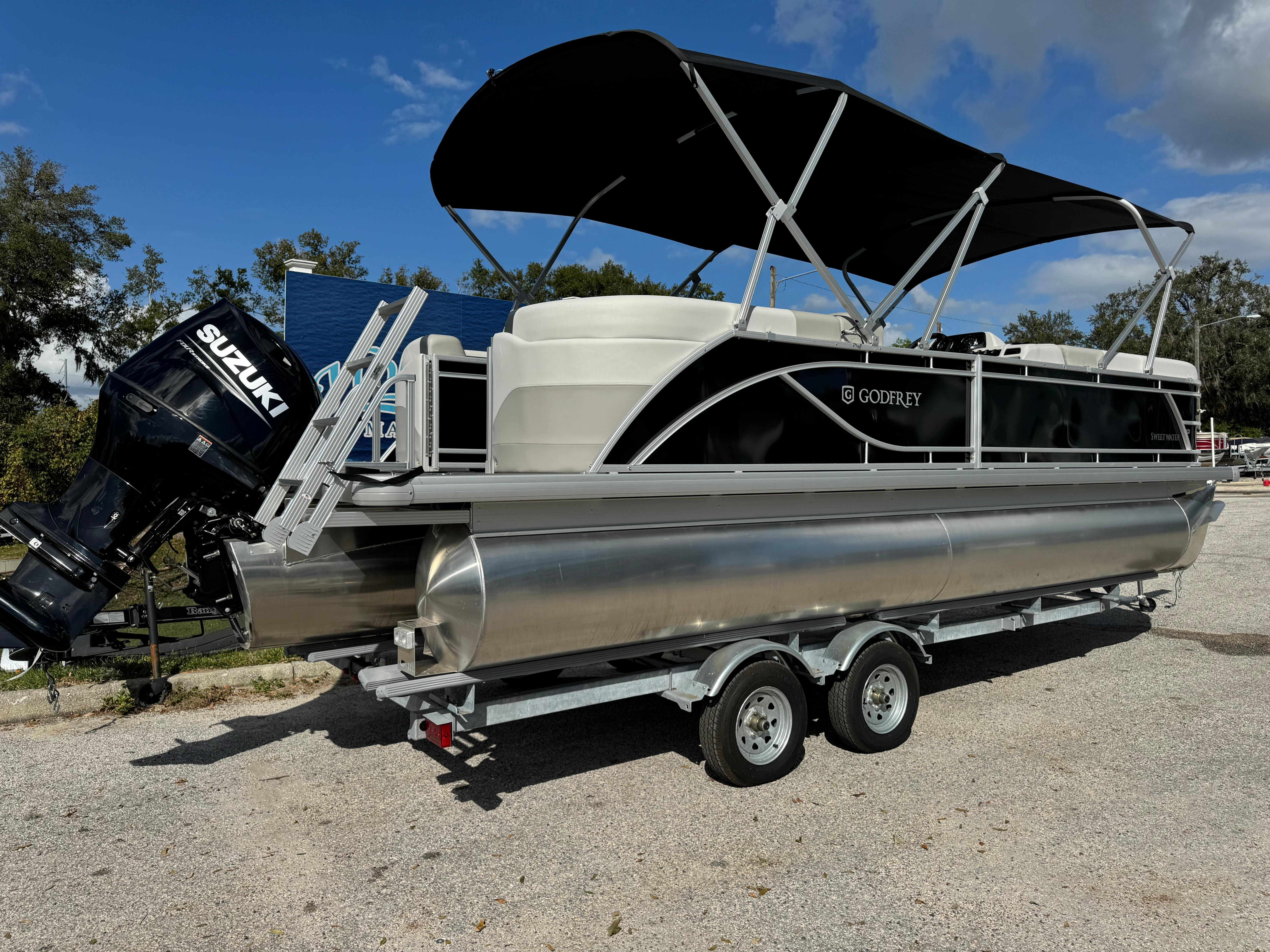 2025 SWEETWATER 2286SBX Double Bimini, Co Captains Chair, Triple Tube, Extended Deck With comfortable seating from bow to stern in lengths from 19 to 21-feet, the Sweetwater Split Bench brings more families together for less. Step up the comfort and the customization of your Sweetwater Split Bench when you choose an optional canopy in your choice of several coordinated canvas colors. The shade provides a welcome reprise from the sun and optional all-metal retention clips enhance the robust design. Equipped with a Mercury 115 HP. Options Include Canopy Frame Canopy and Protective boot Playpen Cover Bow Half Gate Dual battery switch with tray Tubes 25" Outer Ladder Rail Skin Metallic Navy Stainless steel pull-up cleats Golden Weave Flooring Select Tan Interior Captains Chair upgrade Godfrey Digital Gauges Extreme Steering with Tilt Wheel Fusion Stereo with 4 Black Speakers