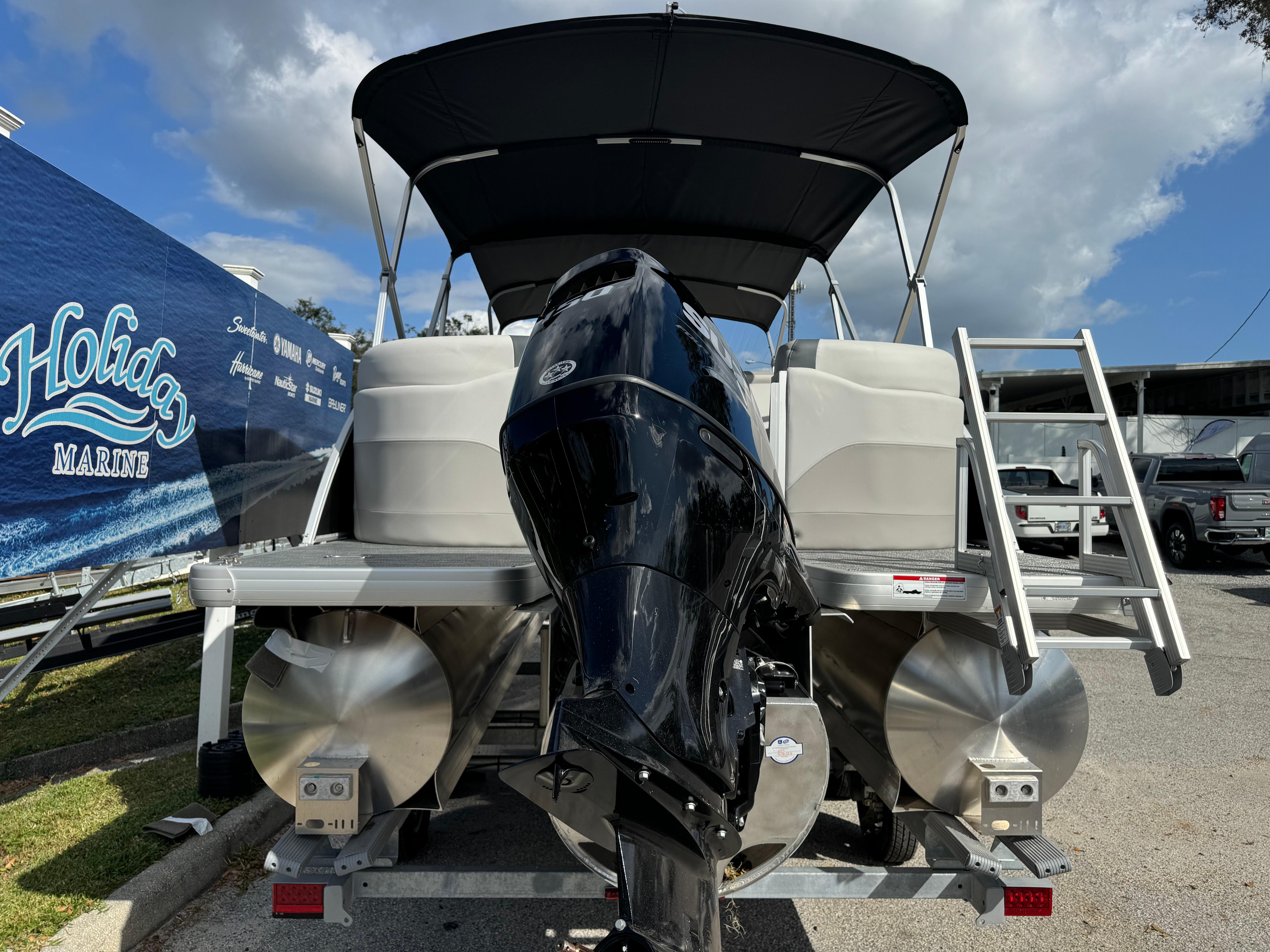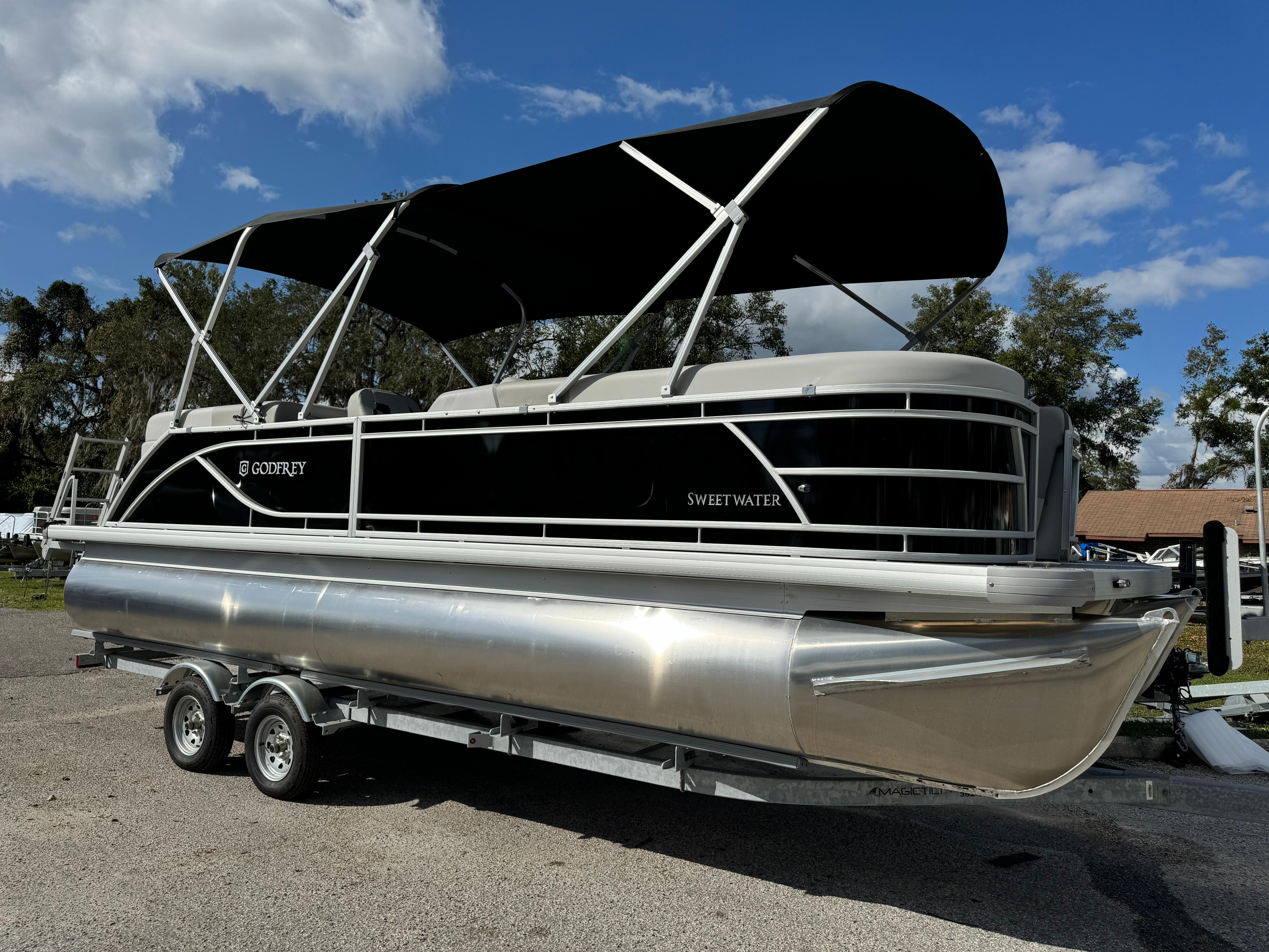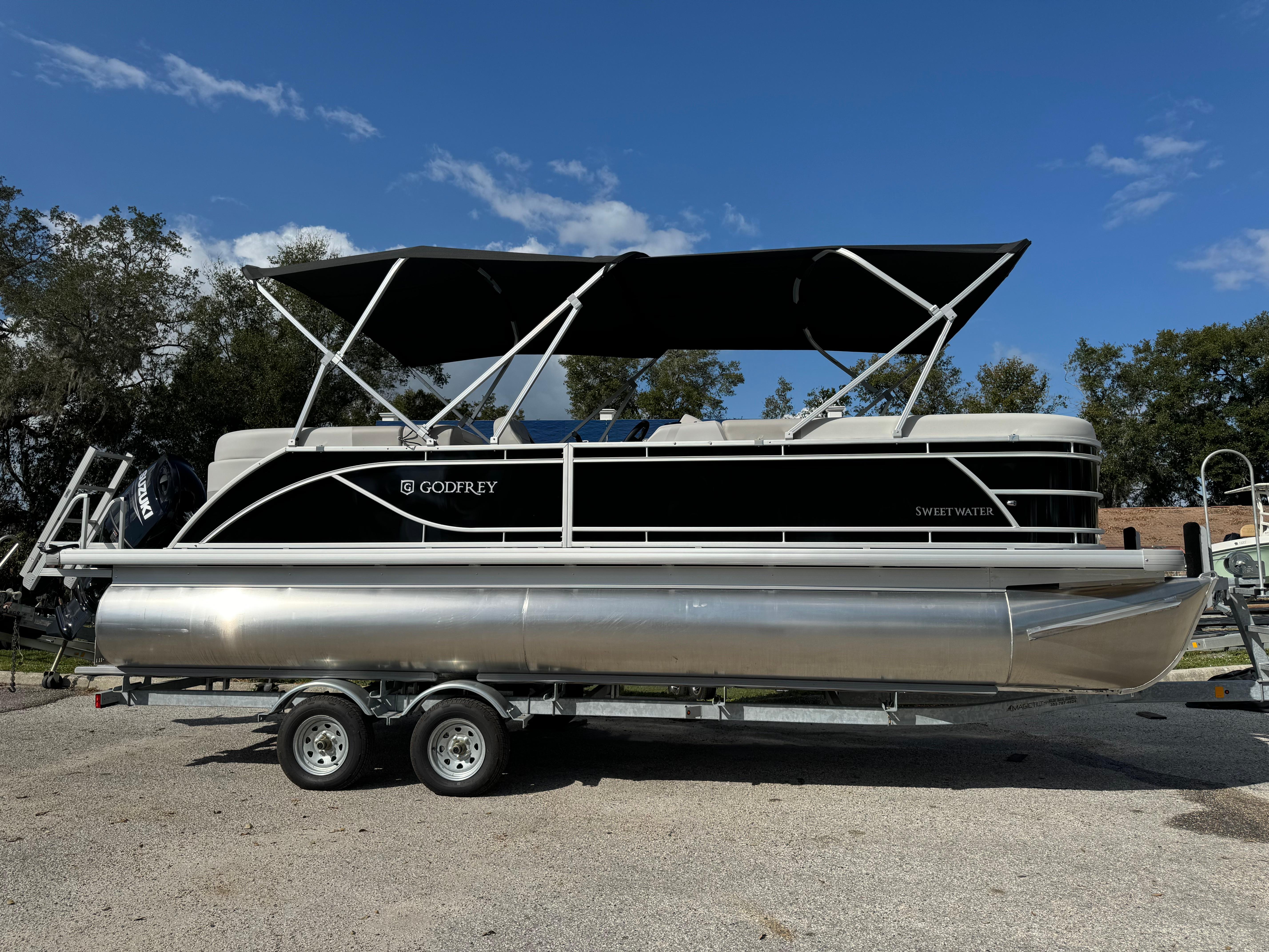 2025 SWEETWATER 2286SBX Double Bimini, Co Captains Chair, Triple Tube, Extended Deck With comfortable seating from bow to stern in lengths from 19 to 21-feet, the Sweetwater Split Bench brings more families together for less. Step up the comfort and the customization of your Sweetwater Split Bench when you choose an optional canopy in your choice of several coordinated canvas colors. The shade provides a welcome reprise from the sun and optional all-metal retention clips enhance the robust design. Equipped with a Mercury 115 HP. Options Include Canopy Frame Canopy and Protective boot Playpen Cover Bow Half Gate Dual battery switch with tray Tubes 25" Outer Ladder Rail Skin Metallic Navy Stainless steel pull-up cleats Golden Weave Flooring Select Tan Interior Captains Chair upgrade Godfrey Digital Gauges Extreme Steering with Tilt Wheel Fusion Stereo with 4 Black Speakers
