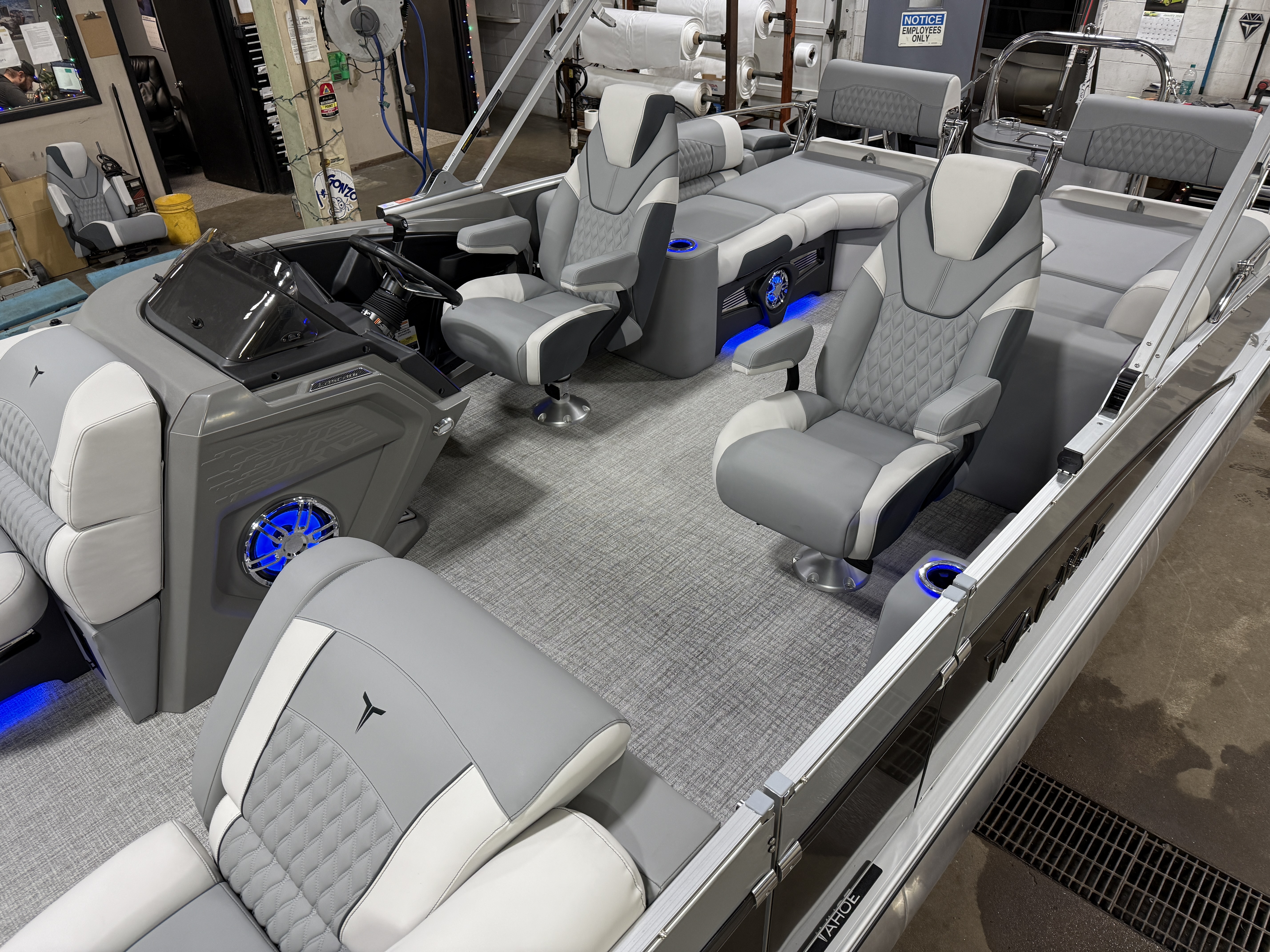 2025 Tahoe Cascade 2385 Quad Lounge Shift SS Tritoon Pontoon & Honda 200HP 4-Stroke EFI. This Luxury Quad Lounger Pontoon Has 2 Chaise Lounge Seating Up Front With Storage, Side By Side Admiral High Back Reclining Captain's Chair, Rear Facing Flip Bench Seating With Storage, Upgraded Riptide Shadow Vinyl Floor, Hydraulic Tilt Steering, Sport Performance Package, Lifting Strakes, Undersheeting, Built-In 38 Gallon Gas Tank, Cascade Platinum Package (Mooring Cover, Pull-Up Cleats, DECO Docking Lights, Platinum Edition Special Badging, Ultrafine Touch Vinyl Upgrade, Blue Ice Package (Lighted Speakers, Cup Holders & Mood Lighting), Vent Covers For Cladding), LED Nav Lights, Simrad NSX 9 Touchscreen Gauges, 4 Fender Holders, 2 Movable Cup Holders, Privacy Station, Simrad 7 GPS Depth Finder, High Performance Sound Package (Bluetooth Fusion Radio With 8 Speakers & Amp, 10" Sub, USB Input w/AUX & Charge), Dual USB Charging Port, Bow USB Charging Port, Ski Tow Bar w/Safety Chains, Lillipad Easy Step Ladder, Table, Lifetime Aluminum Seat Frames, Multiple Cup Holders, Graphite Interior Package, Furniture Series Upgrade, Charcoal Seat Cladding, Electric Bimini Top, 25" Tubes, Smoked Chrome Logos, New Battery, Polished Corner Caps, Manual Dual Battery Selector, Front And Rear Sun Deck. Rated For 12 People.