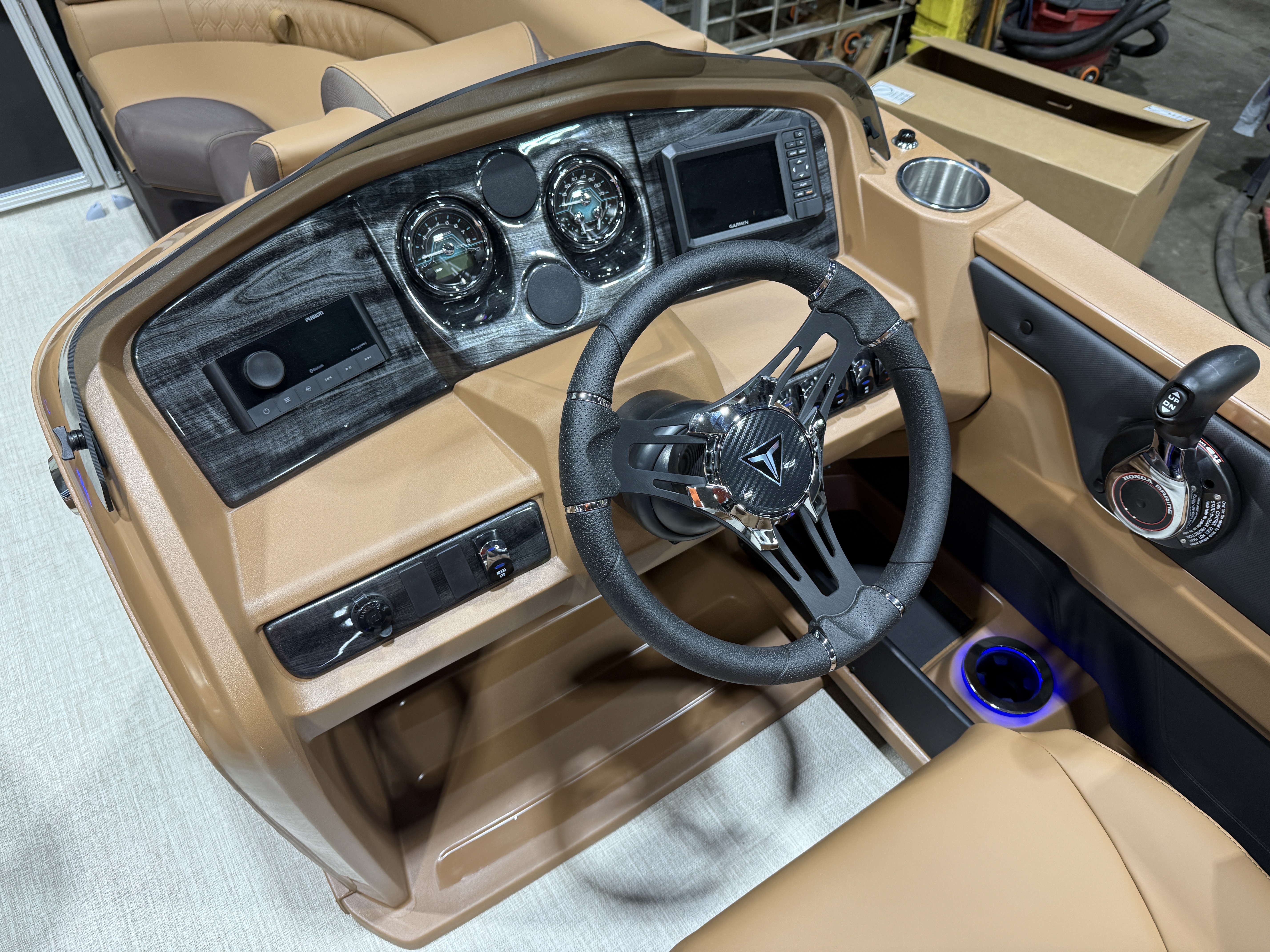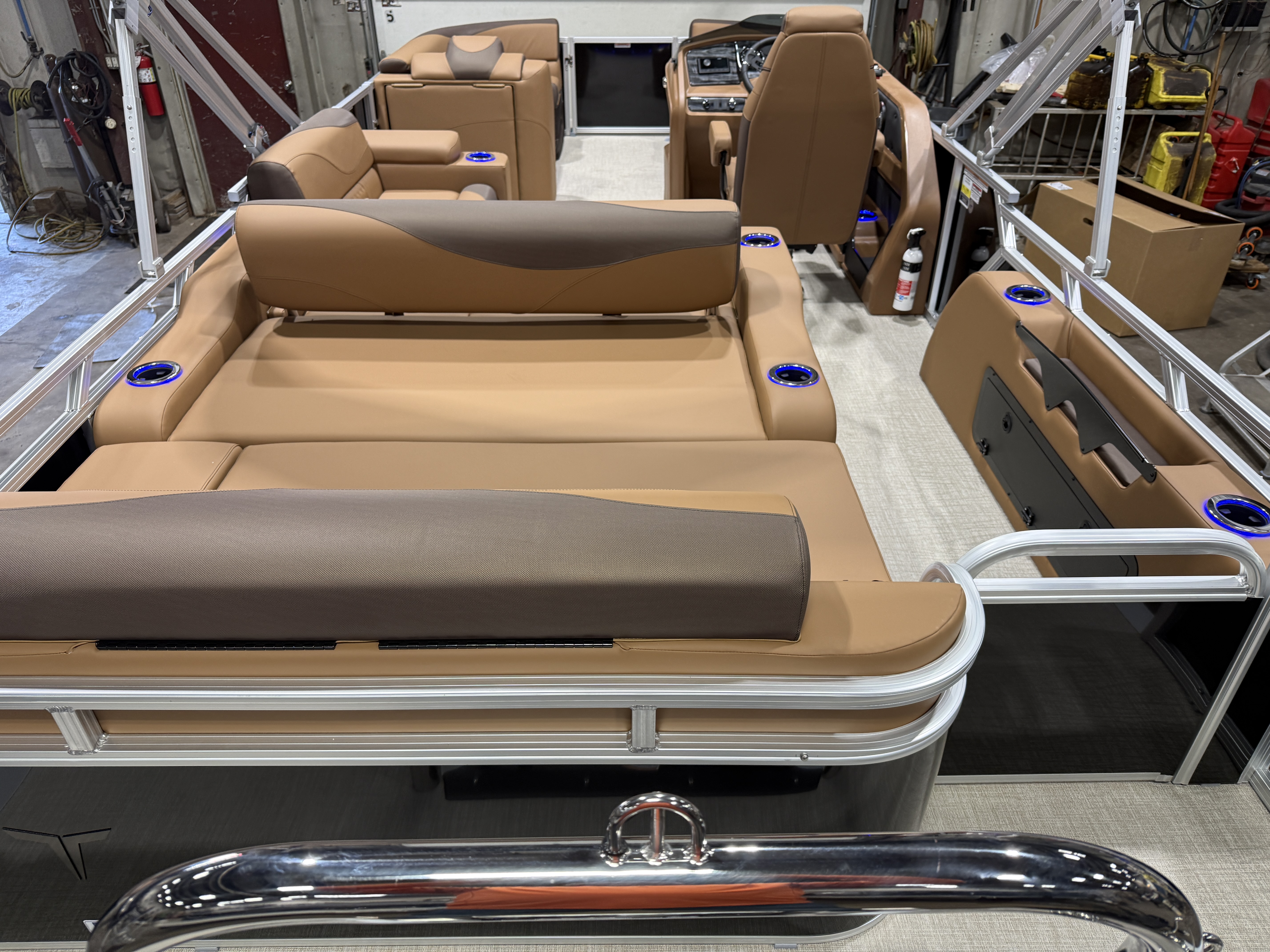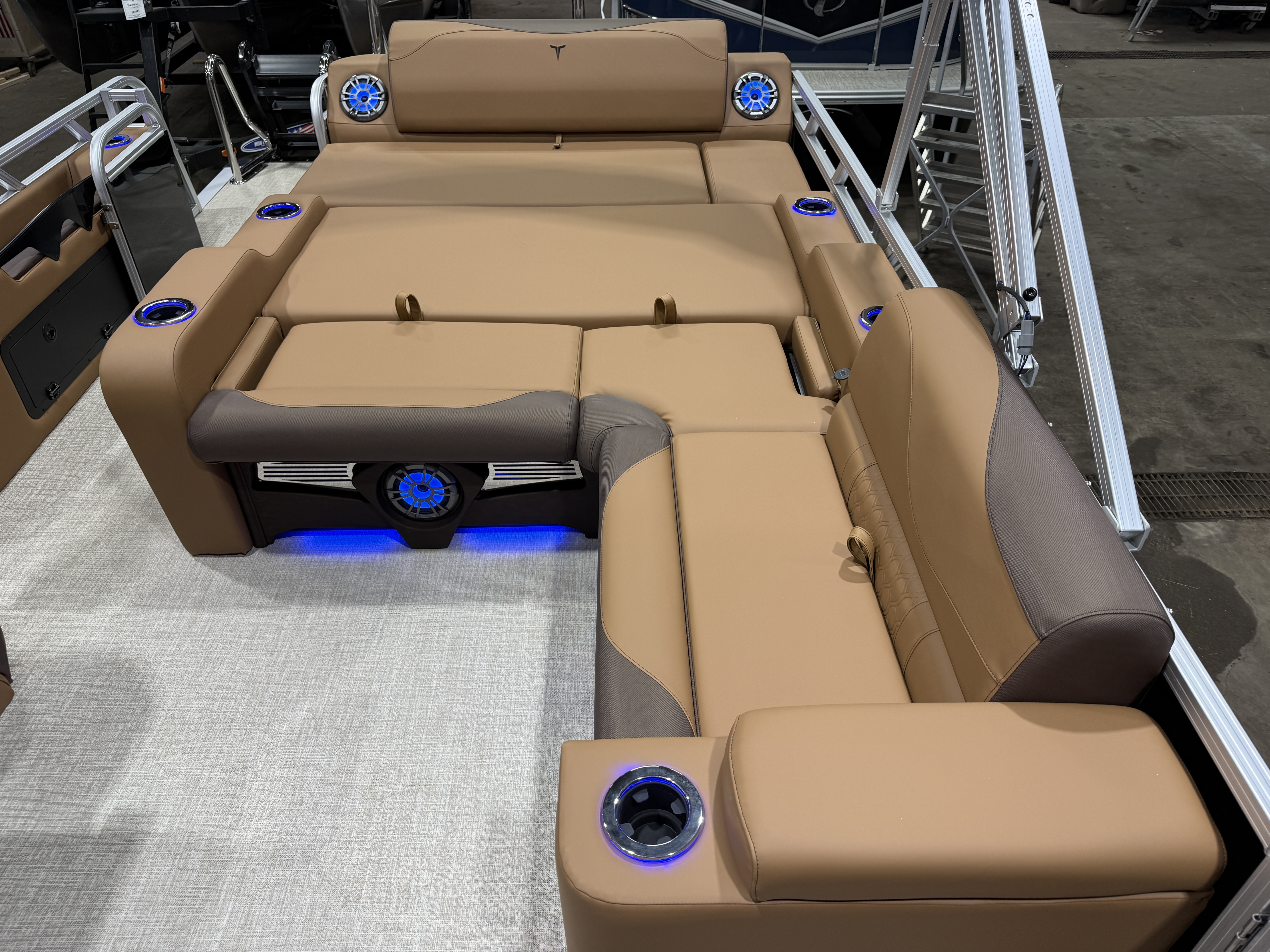 2026 Tahoe LTZ 2385 Versatile Rear Lounger (VRL) Tritoon Pontoon Powered By Honda. This 23' Tri-Toon Has Front Lounge Seating With Storage, Admiral Reclining Captain's Chair, Versatile Rear Lounge Seating With Storage & Built In Speakers, Gated Aft, Riptide Vinyl Flooring, Cognac Interior Package, Platinum Package (Ultrafine Touch Vinyl Upgrade, LED Chrome Smoked Docklights, Polished Corner Caps, Garmin 52CV GPS Depth Finder, Pull Up Cleats, Vent Covers For Cladding, Platinum Edition Special Badging), Gauge Package w/Hour Meter, Bimini Top, New Battery, Side Storage Behind Captain's Chair, Built-In 38 Gallon Gas Tank, Hydraulic Tilt Steering, Lifting Strakes, Underneath Aluminum Sheeting, Mooring Cover, Blue Ice Package (Lighted Cup Holders, Speakers & Mood Lighting), Ski Tow Bar, Multiple Cup Holders, Side Storage Behind Captain's Seat, Fusion Bluetooth Radio w/6 Speakers & Amp, Lillipad Easy Step Ladder, Tilt Steering, Bow & Aft USB Charging Ports, On/Off Battery Switch, Smoked Chrome Logos, Nice Front And Rear Deck, New Battery, Brushed Bronze Seat Cladding. Rated For 12 People.