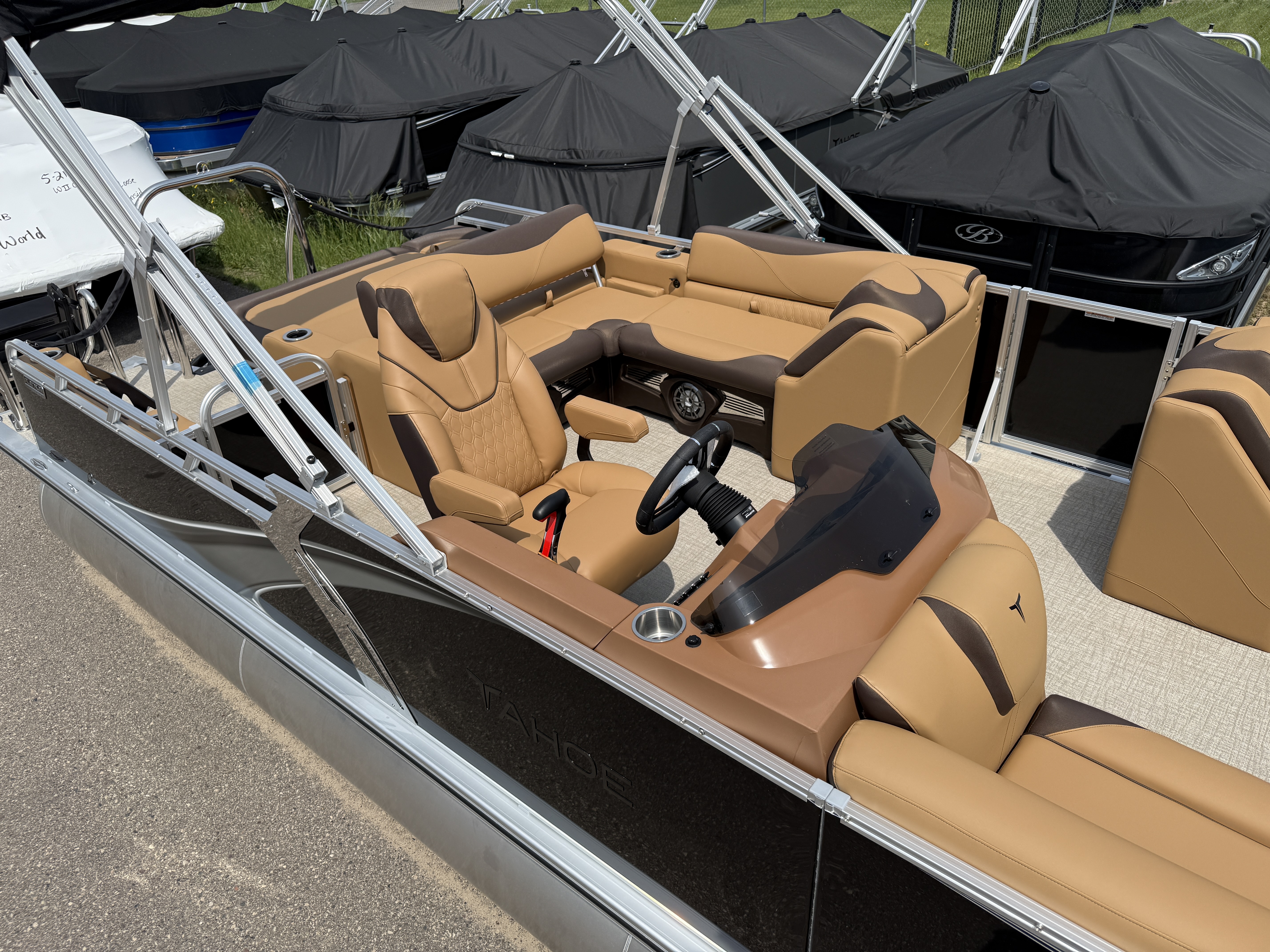 2025 Tahoe LTZ 2385 Versatile Rear Bench (VRB) Tritoon Pontoon Powered By Honda. This 23' Tri-Toon Has Front Lounge Seating With Storage, Admiral Reclining Captain's Chair, Versatile Rear Bench Seating With Storage, Gated Aft, Riptide Shadow Vinyl Flooring, Cognac Interior Package, Upgraded Ultra-Fine Vinyl Seats, Platinum Package (LED Chrome Smoked Docklights, Polished Corner Caps, Mooring Cover, Garmin 52CV GPS Depth Finder, Pull Up Cleats, Vent Covers For Cladding), Gauge Package w/Hour Meter, Bimini Top, New Battery, Side Storage Behind Captain's Chair, Built-In 38 Gallon Gas Tank, Hydraulic Tilt Steering, Lifting Strakes, Underneath Aluminum Sheeting, Blue Ice Package (Lighted Cup Holders, Speakers & Mood Lighting), Ski Tow Bar, Multiple Cup Holders, Helm Side Storage, Fusion Bluetooth Radio w/6 Speakers & Amp, Lillipad Easy Step Ladder, Tilt Steering, Bow & Aft USB Charging Ports, Nice Front And Rear Deck, New Battery, Brushed Bronze Seat Cladding. Rated For 12 People.