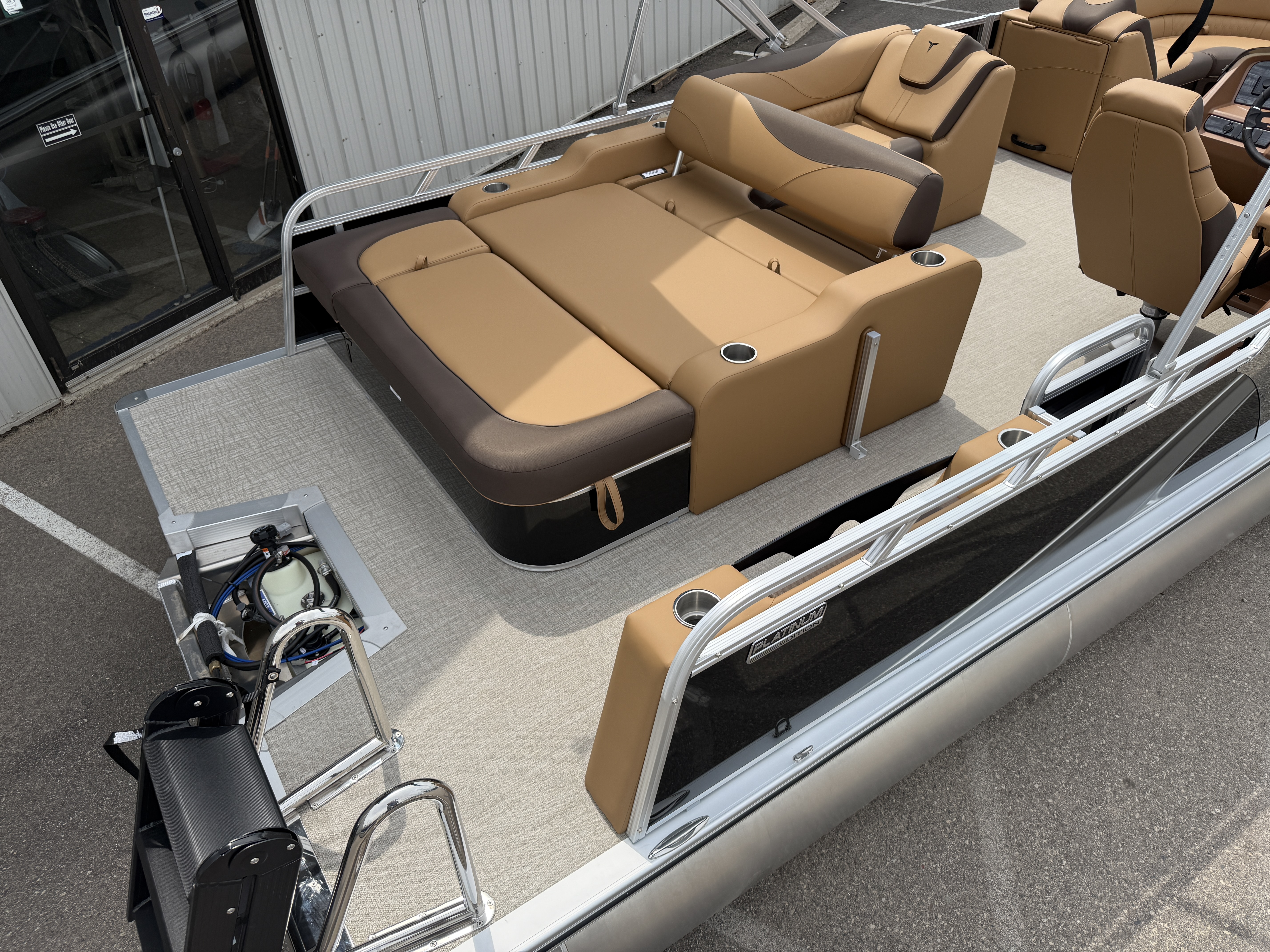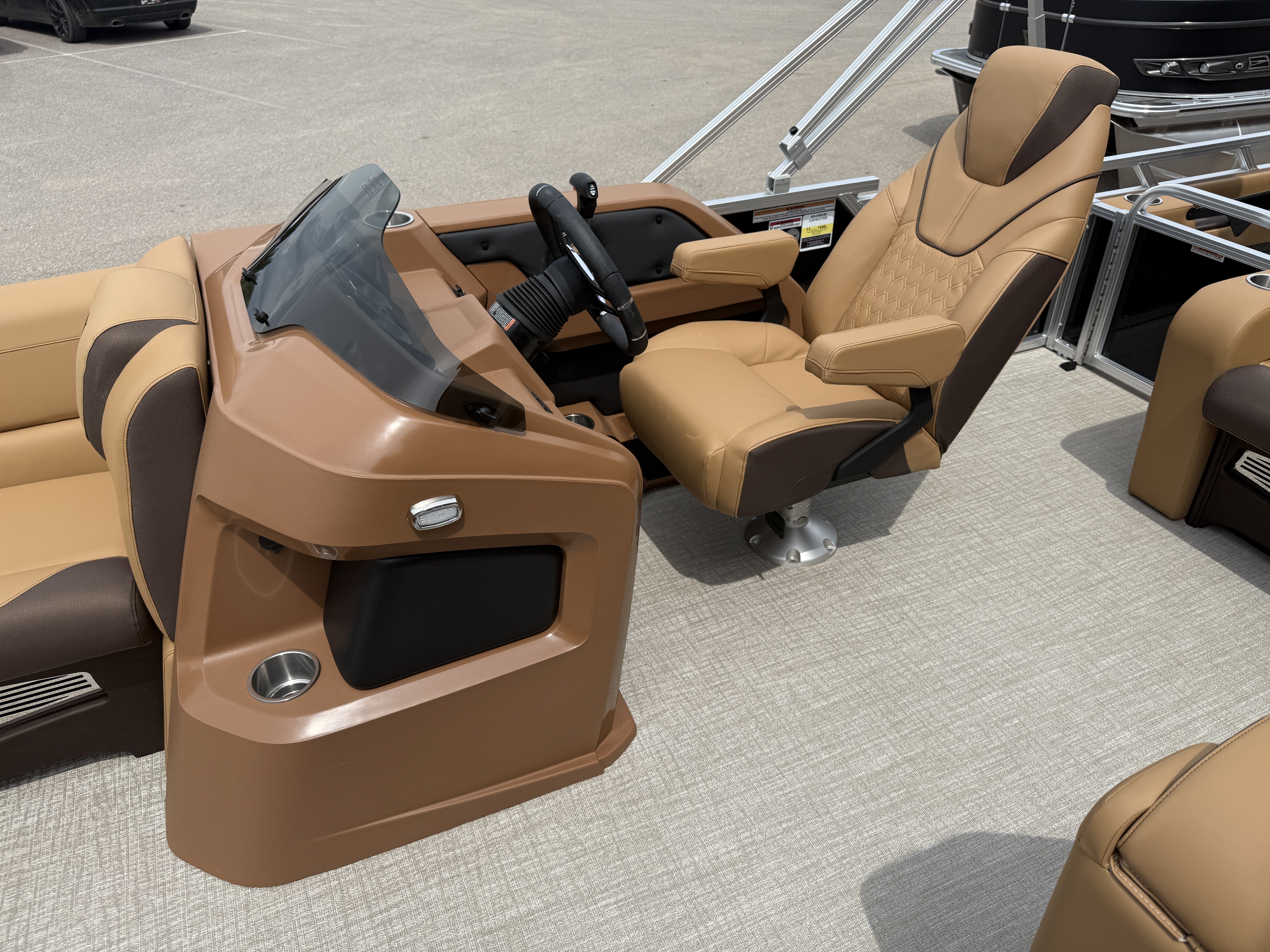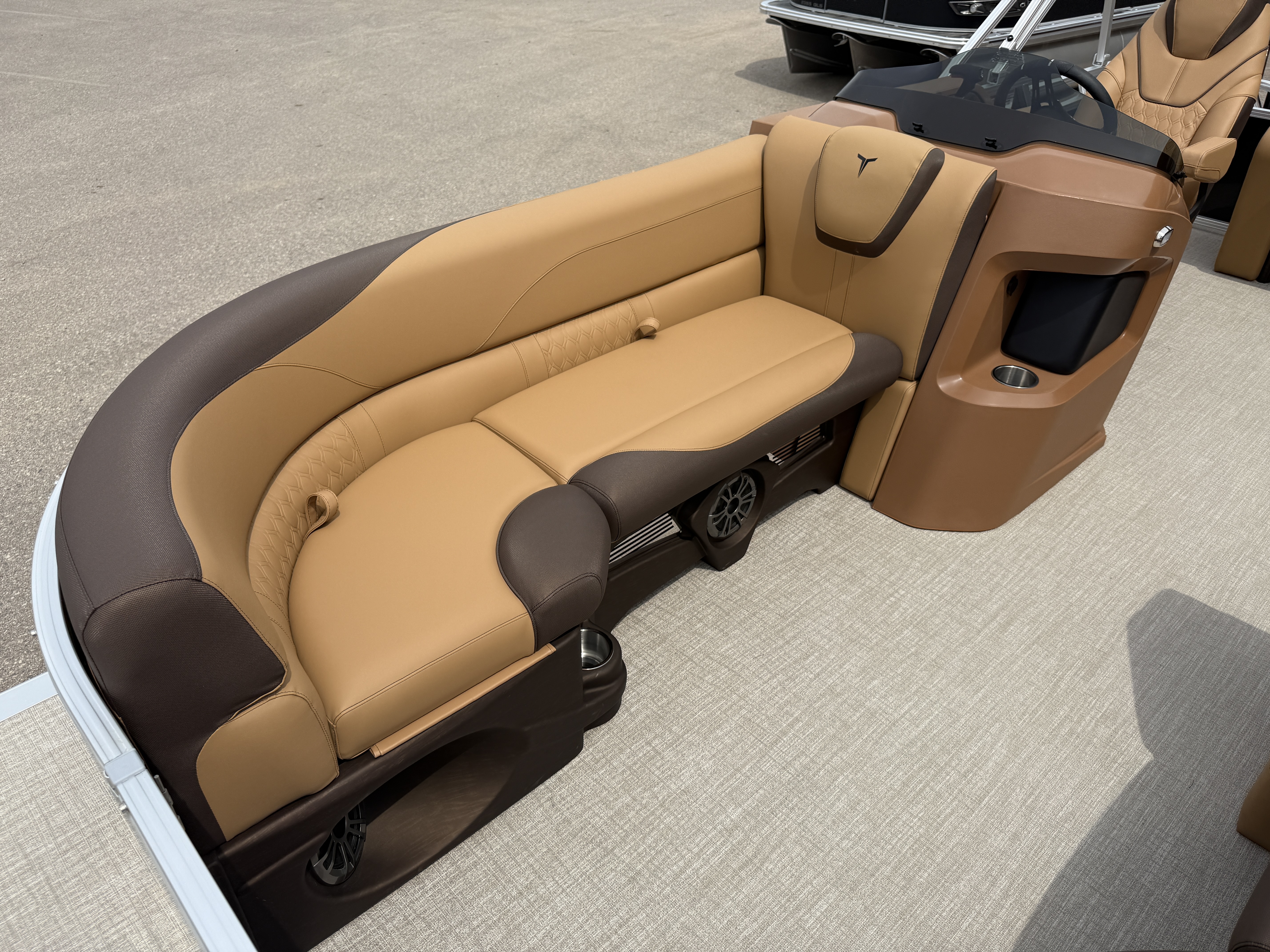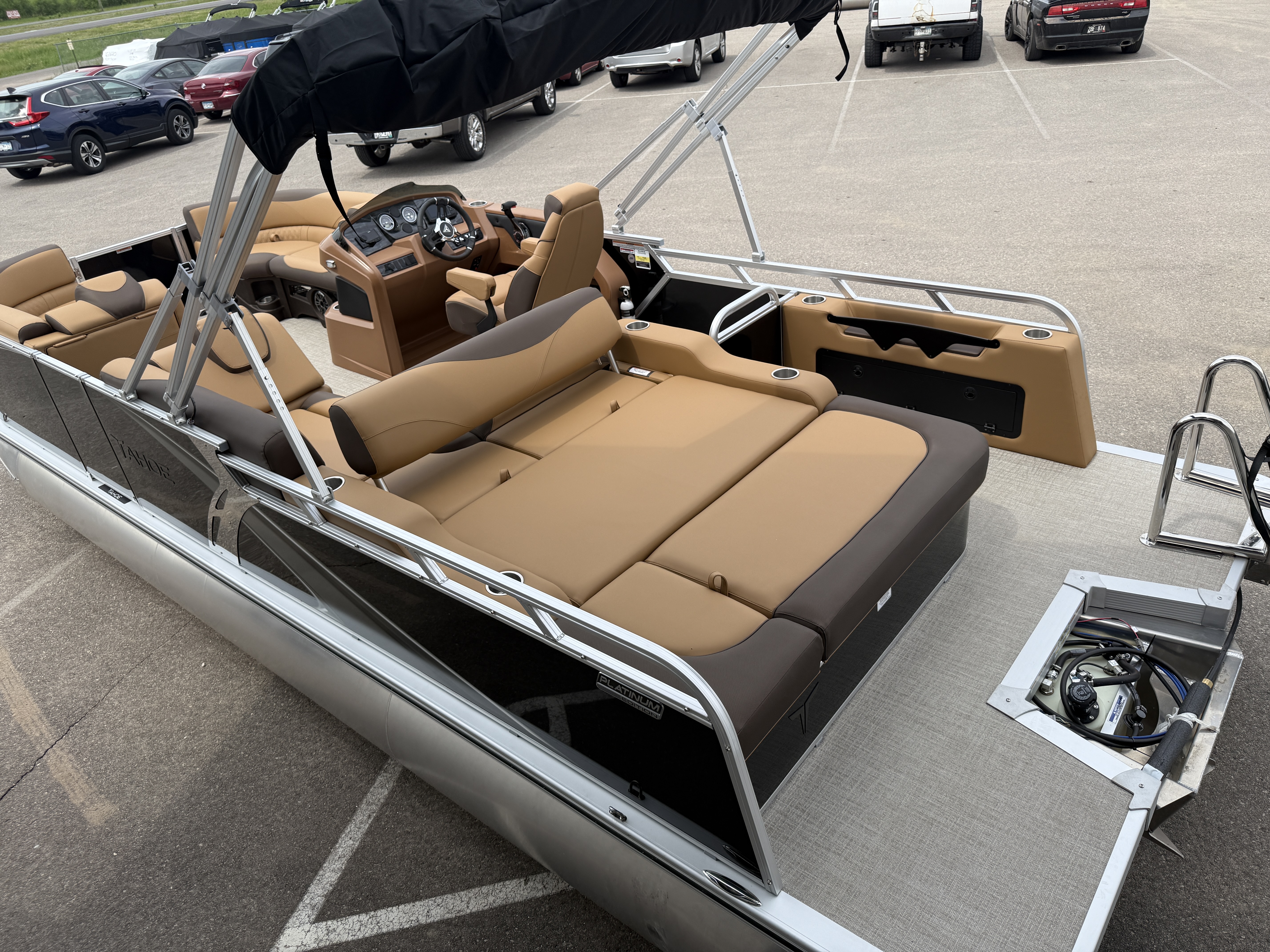 2025 Tahoe LTZ 2385 Versatile Rear Bench (VRB) Swingback Pontoon & Honda 4-Stroke EFI. This Pontoon Has Front Chaise Lounge Seating With Storage, Wrap Around Seating With Storage, Admiral Reclining Captain's Chair, Seating That Turns Into A Bed Or Rear Facing Bench Seating, Rear Swim Deck, Riptide Dune Vinyl Flooring, LTZ Platinum Package (Mooring Cover, Garmin 52CV GPS Depth Finder, Pull-Up Cleats, LED Smoked Chrome Docking Lights, Vent Covers For Cladding) Table, Bluetooth Radio w/6 Speakers, Multiple Cup Holders, 25" Tubes, 10' Bimini Top, Gated Aft, Cognac Interior Package, Bow & Aft USB Charging Ports, Lillipad Easy Step Ladder, Side Storage Behind Captain's Seat, Front Deck. Rated For 11 People.