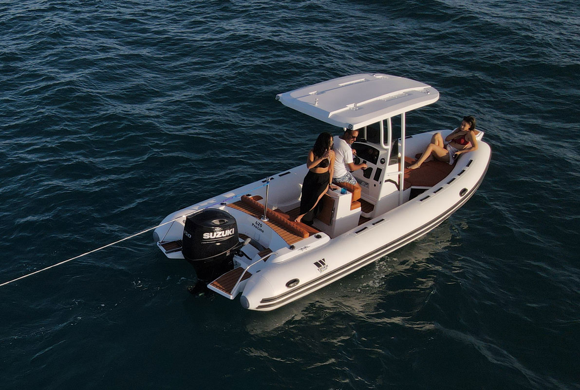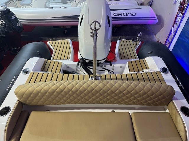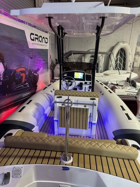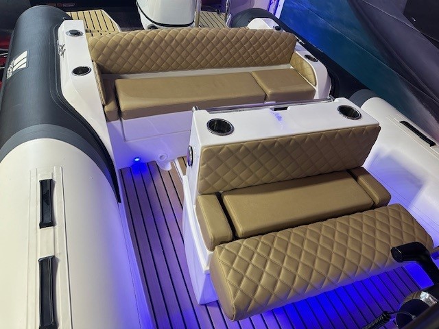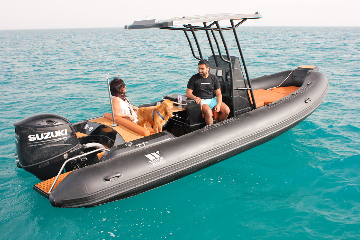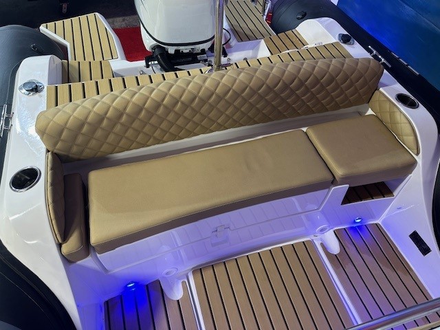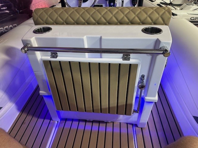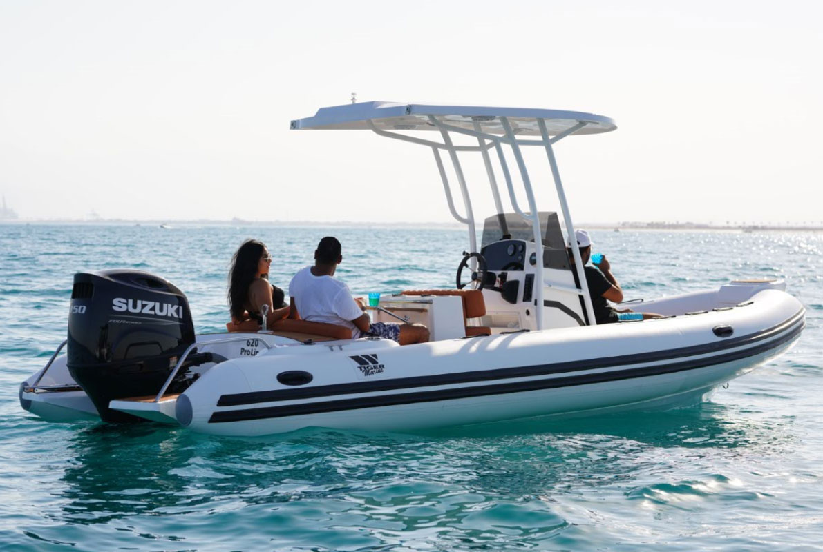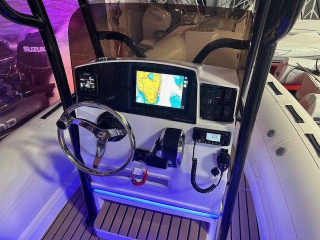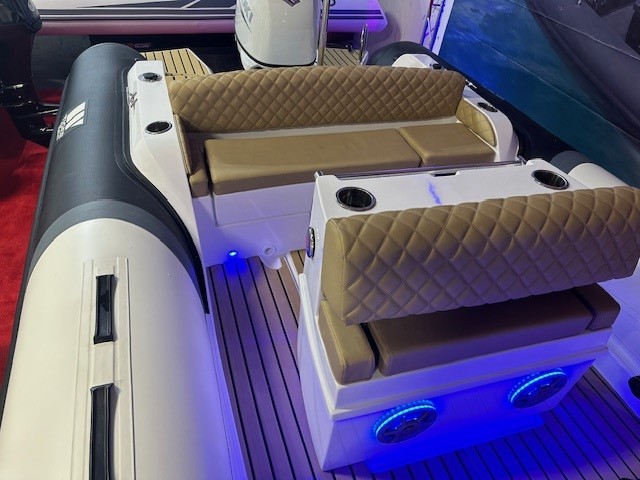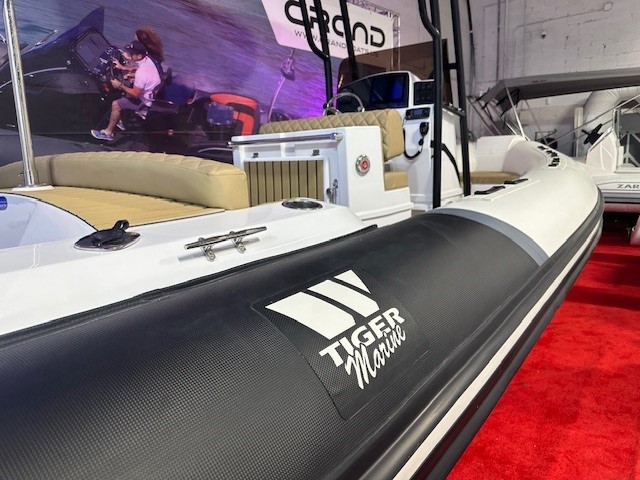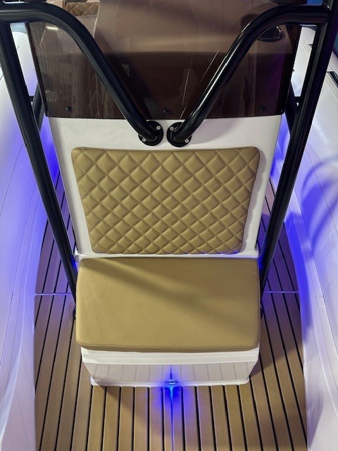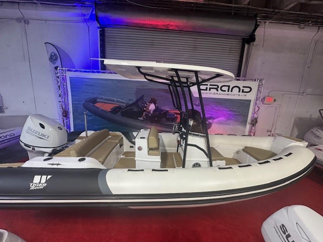 The Tiger Marine 620 PL is stocked with hypalon tube. SeaDeck faux teak, Silvertex cushion set, ski-pole, Nav lights, Bilge Pump, Battery system with cutoff switch, Fiberglass T-top with aluminum frame. SS rod holders. SS cup holders, swim platforms with SS hadrails, sundeck, LED deck lights.