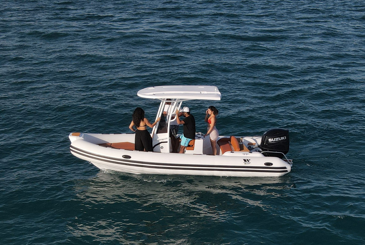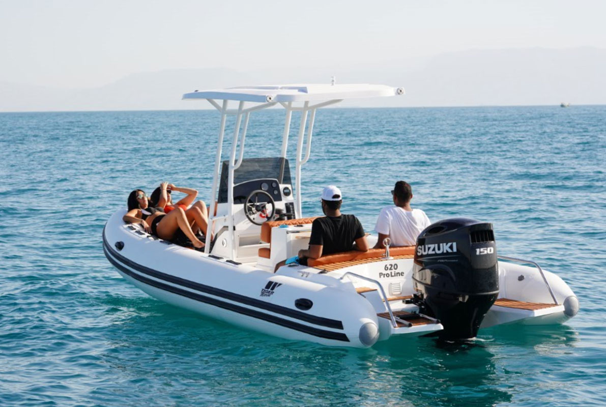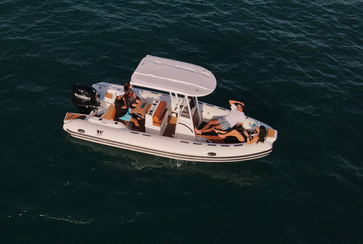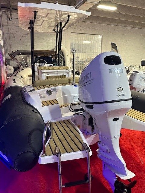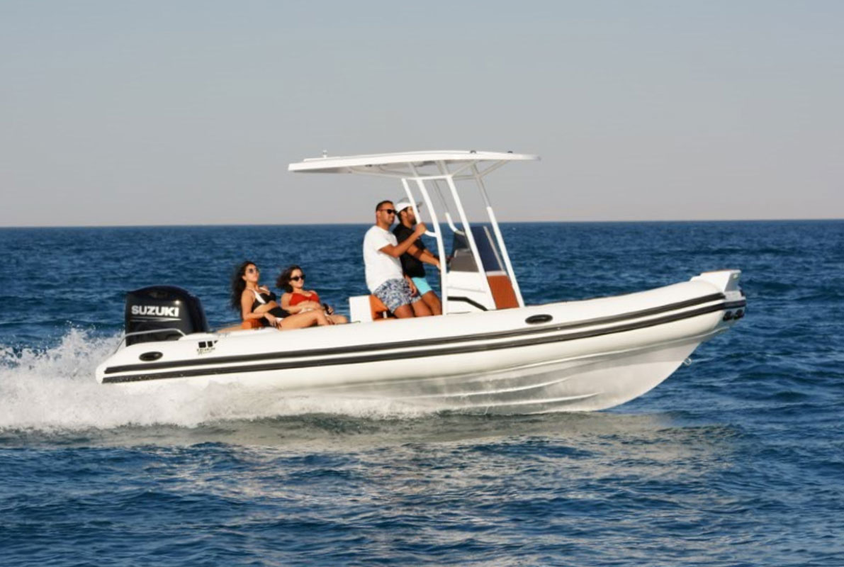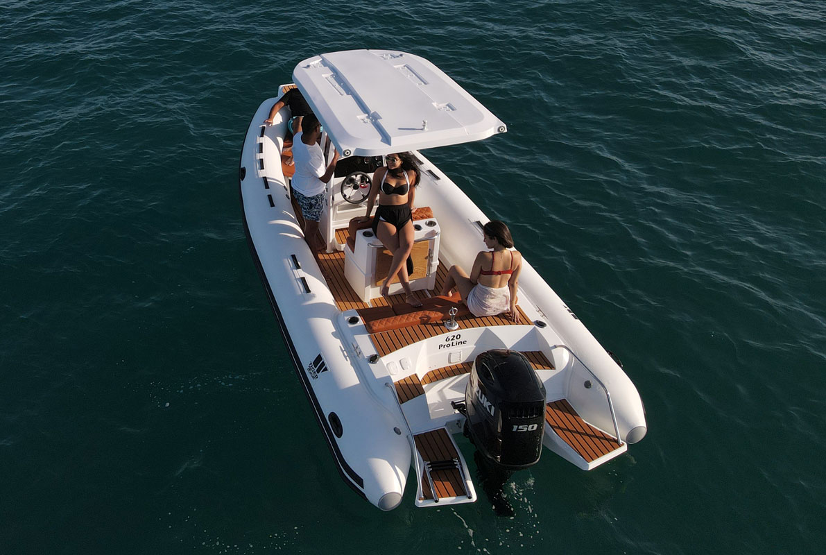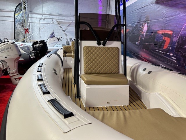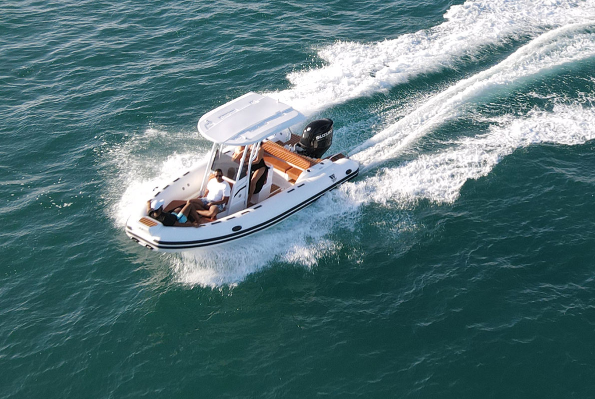 The Tiger Marine 620 PL is stocked with hypalon tube. SeaDeck faux teak, Silvertex cushion set, ski-pole, Nav lights, Bilge Pump, Battery system with cutoff switch, Fiberglass T-top with aluminum frame. SS rod holders. SS cup holders, swim platforms with SS hadrails, sundeck, LED deck lights.